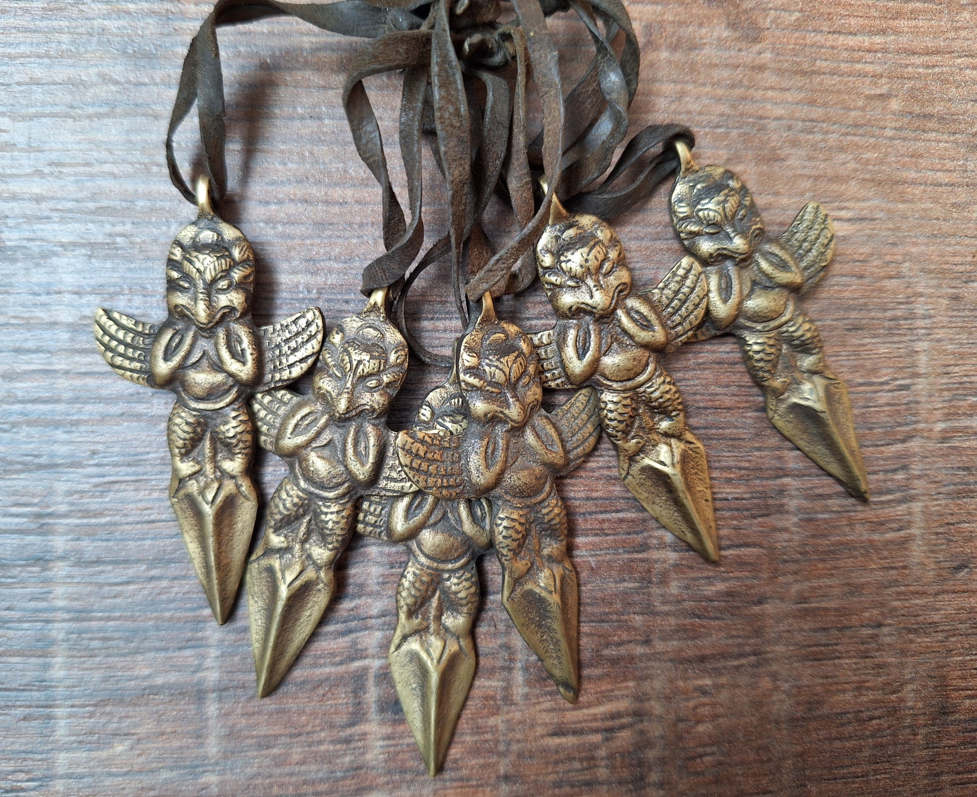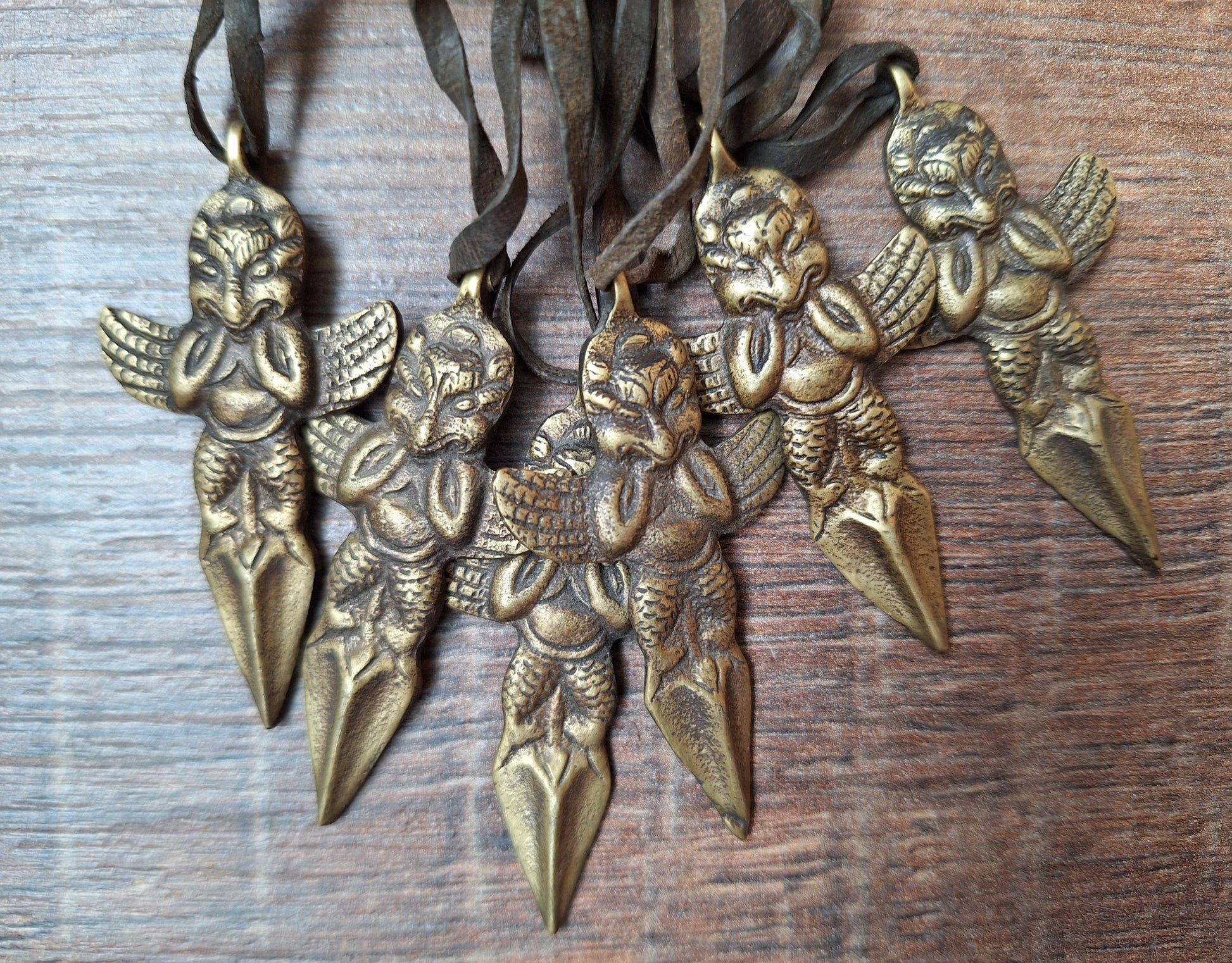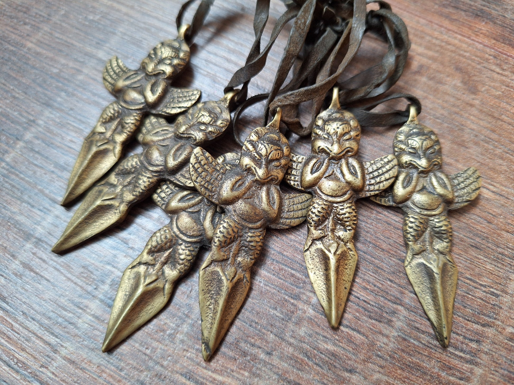 In this pendant, Garuda sits on top of a phurba; the ritual triangular knife common in vast territories of Asia. The use of the phurba for diverse ritual and protective purposes can be dated back at least 3500 years. Read more about the general and specific design and symbolism of the phurba in the general description of the webshop-collection "Ritual Attributes; Phurba's".