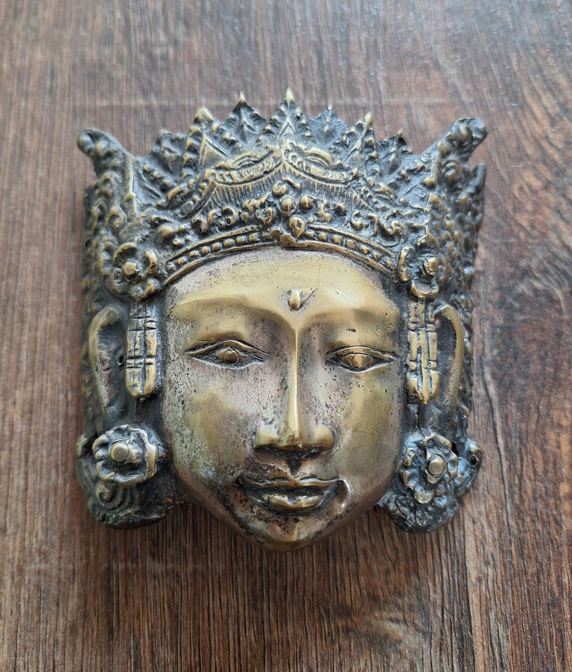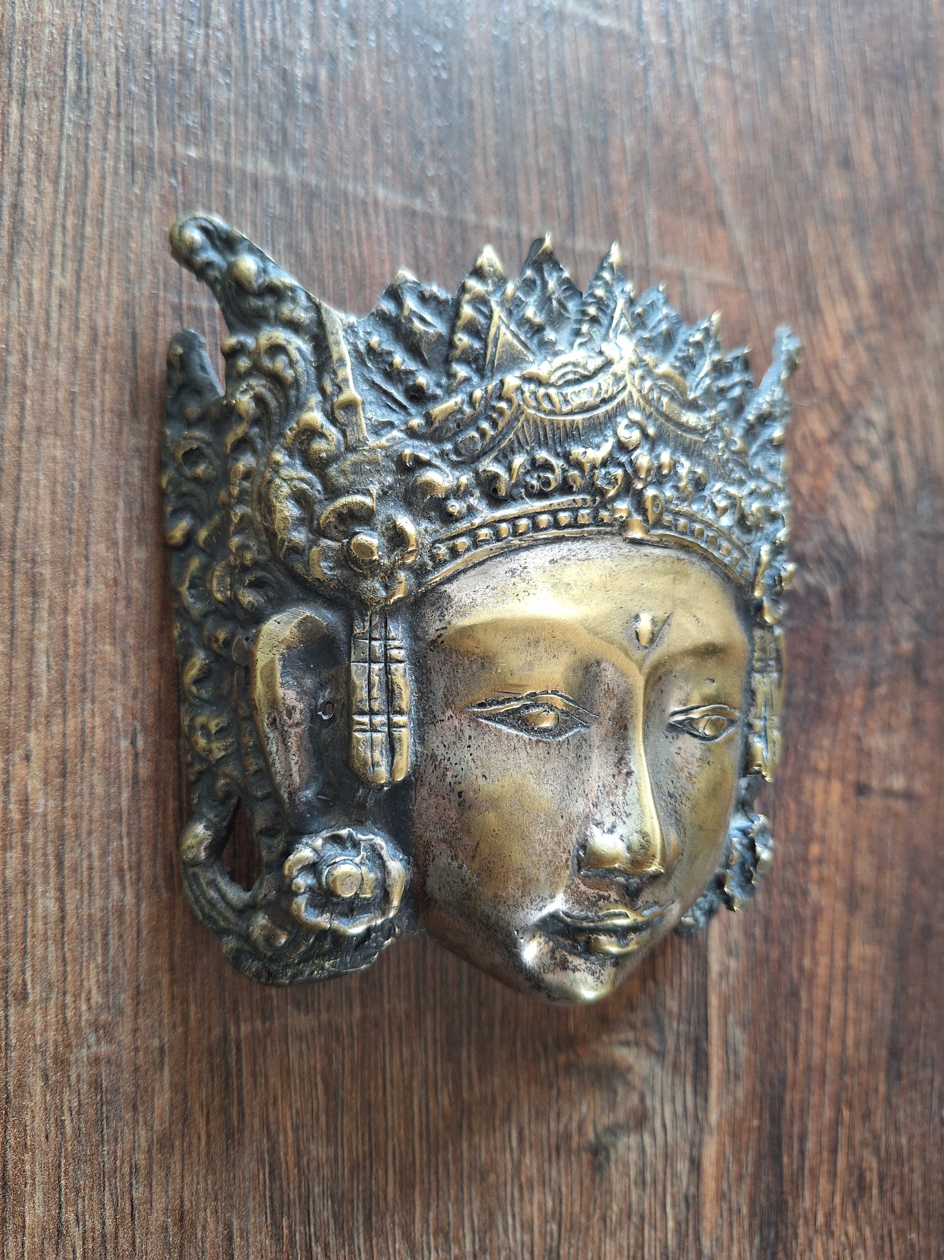 This brass mask shows the face of Tara, crowned as the 'mother of all buddha's'. The mask is from vintage origin and even tho the decorations might not be of very high quality, Tara's facial expression beautifully shows her loving, motherly, compassionate energy.