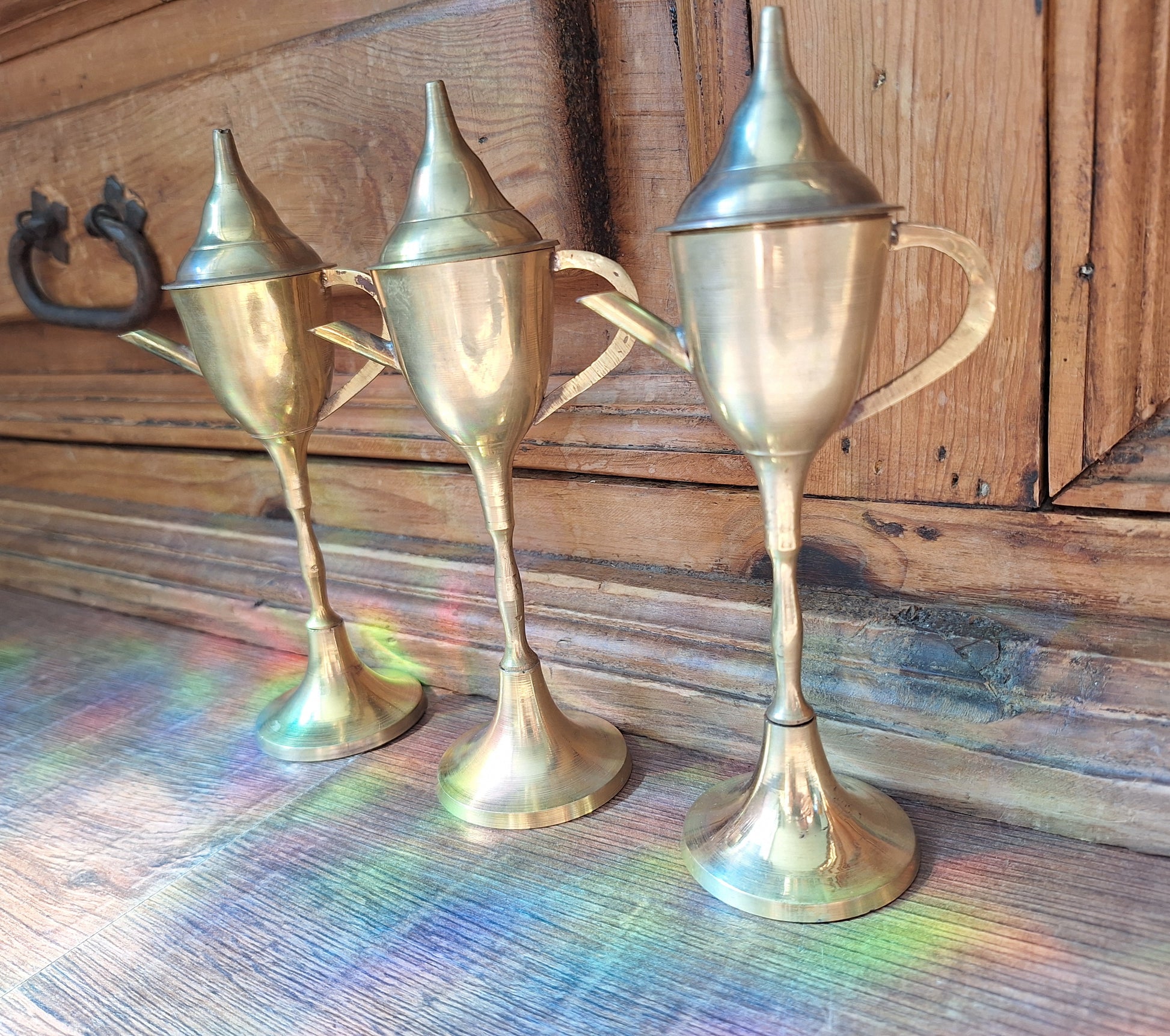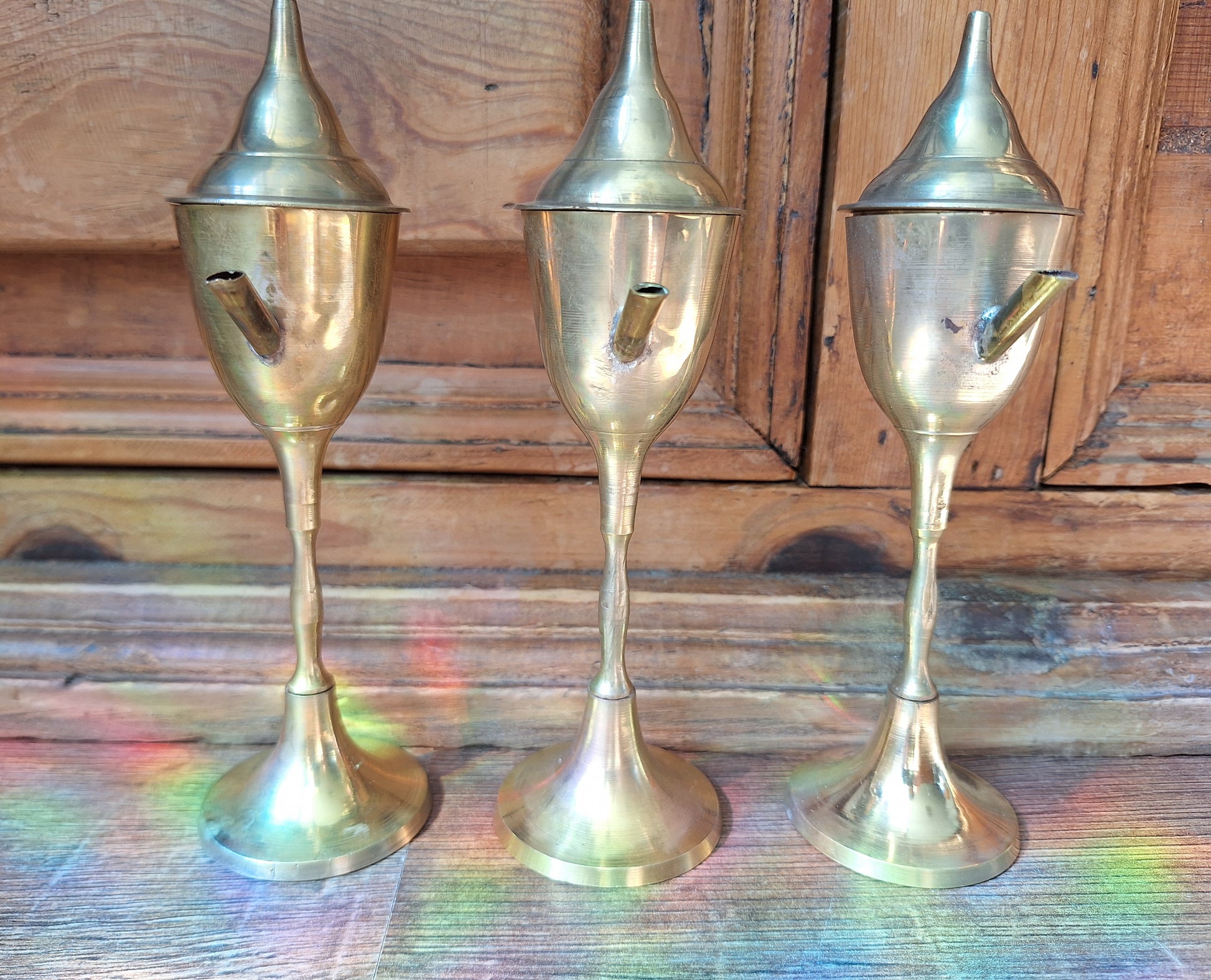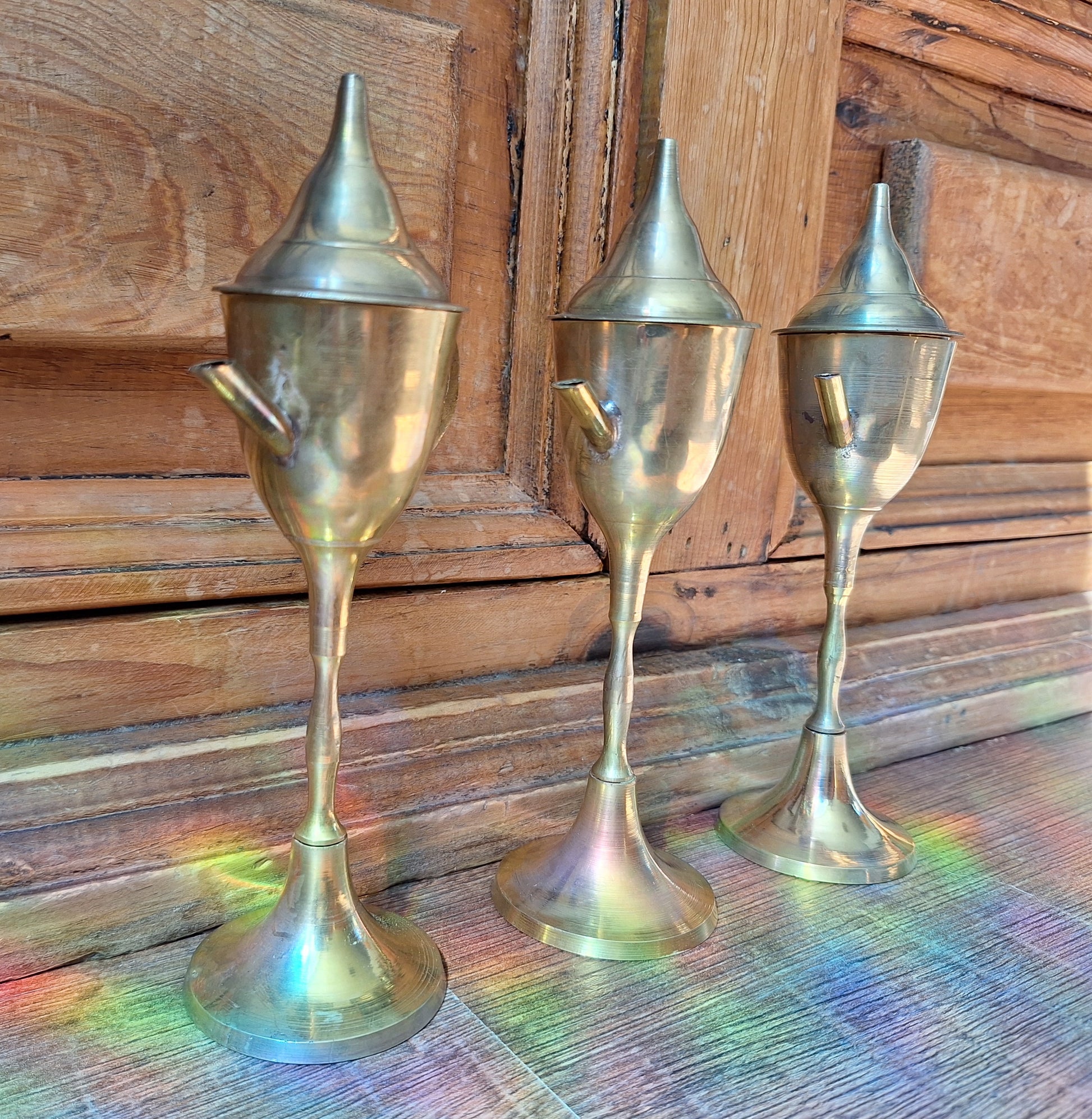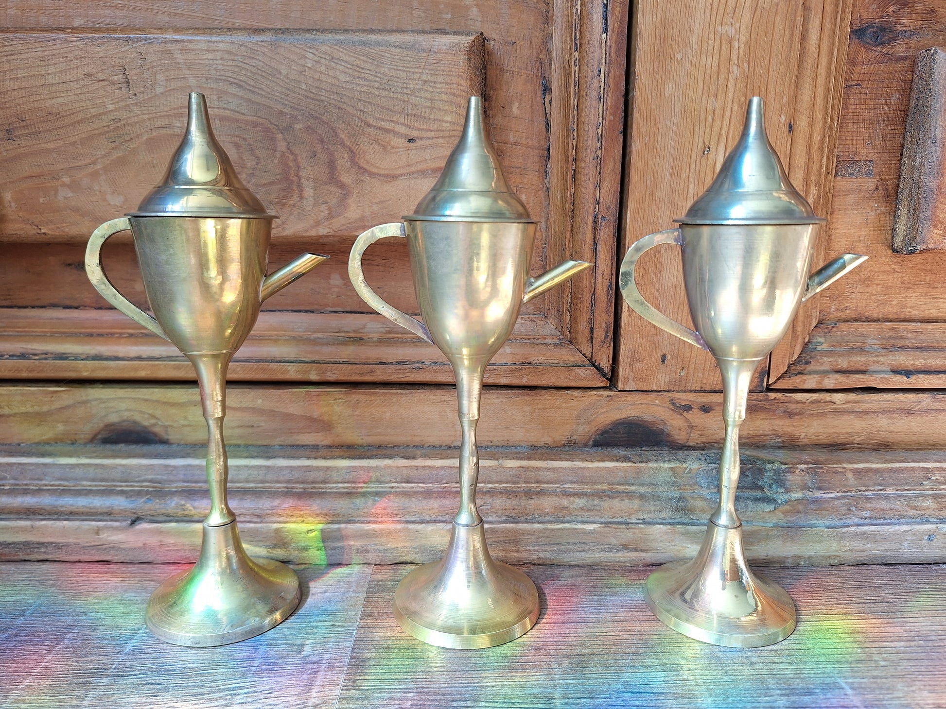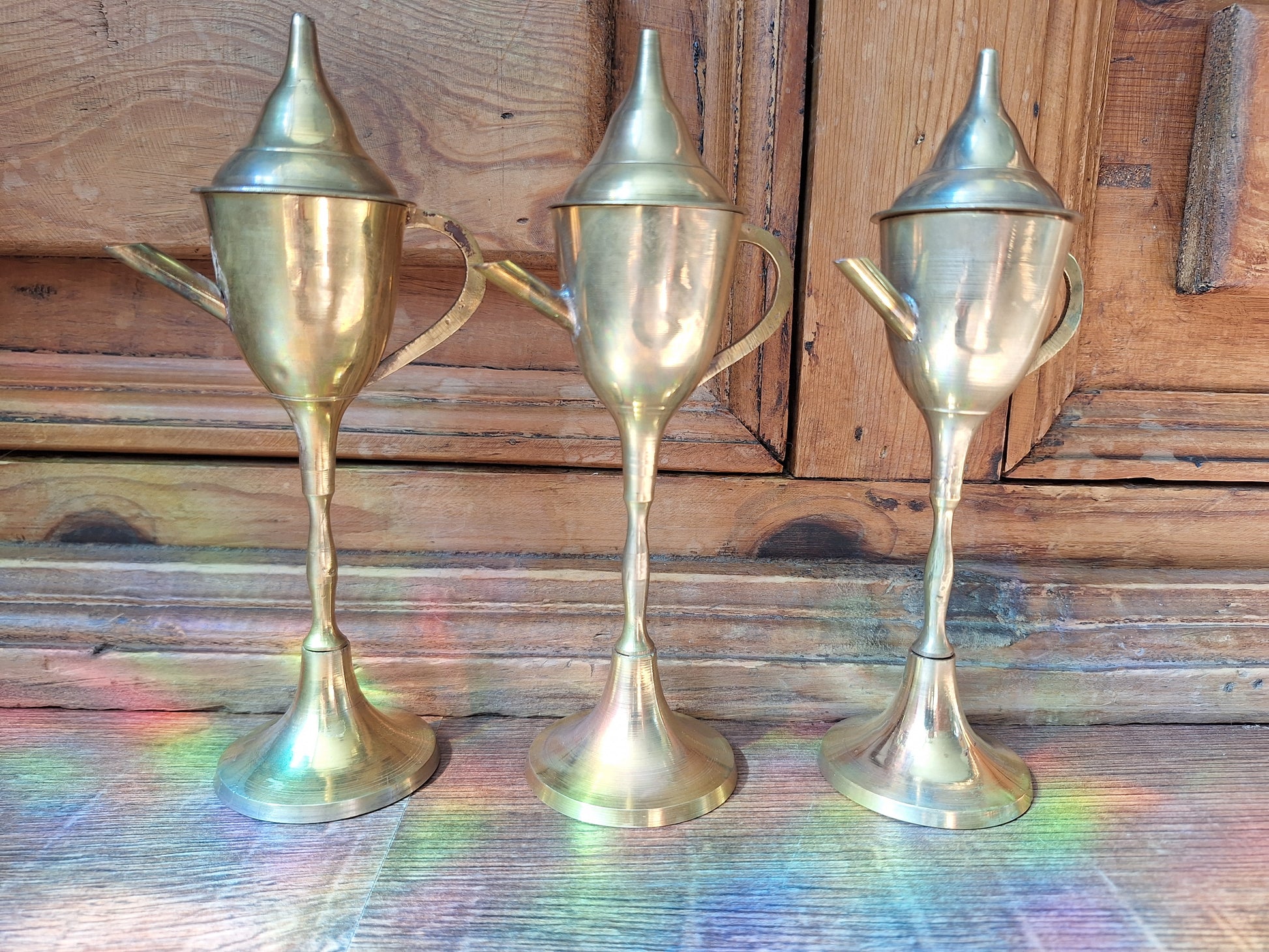 Vintage brass oil lamps with a dutch origin. In dutch, this style of oil lamp is called "Snotneus", which translates as 'runny / drippy nose', referring to the fact that oil often leaks from the wick in the spout.