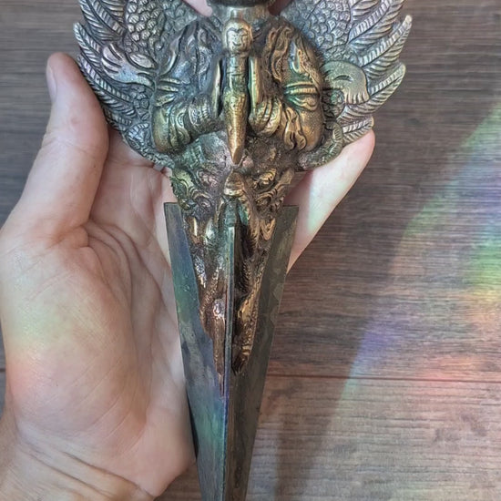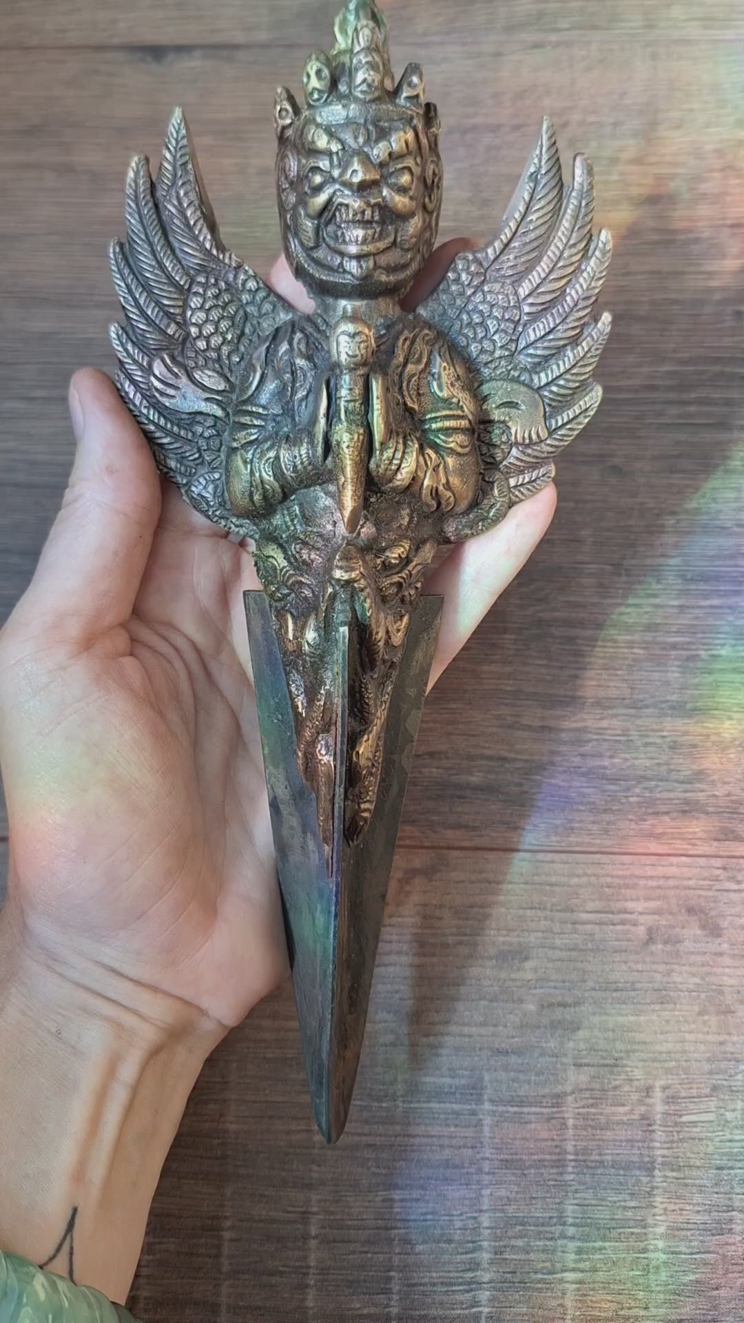 Very beautiful vintage phurba from Nepal, made from brass and with an iron blade.