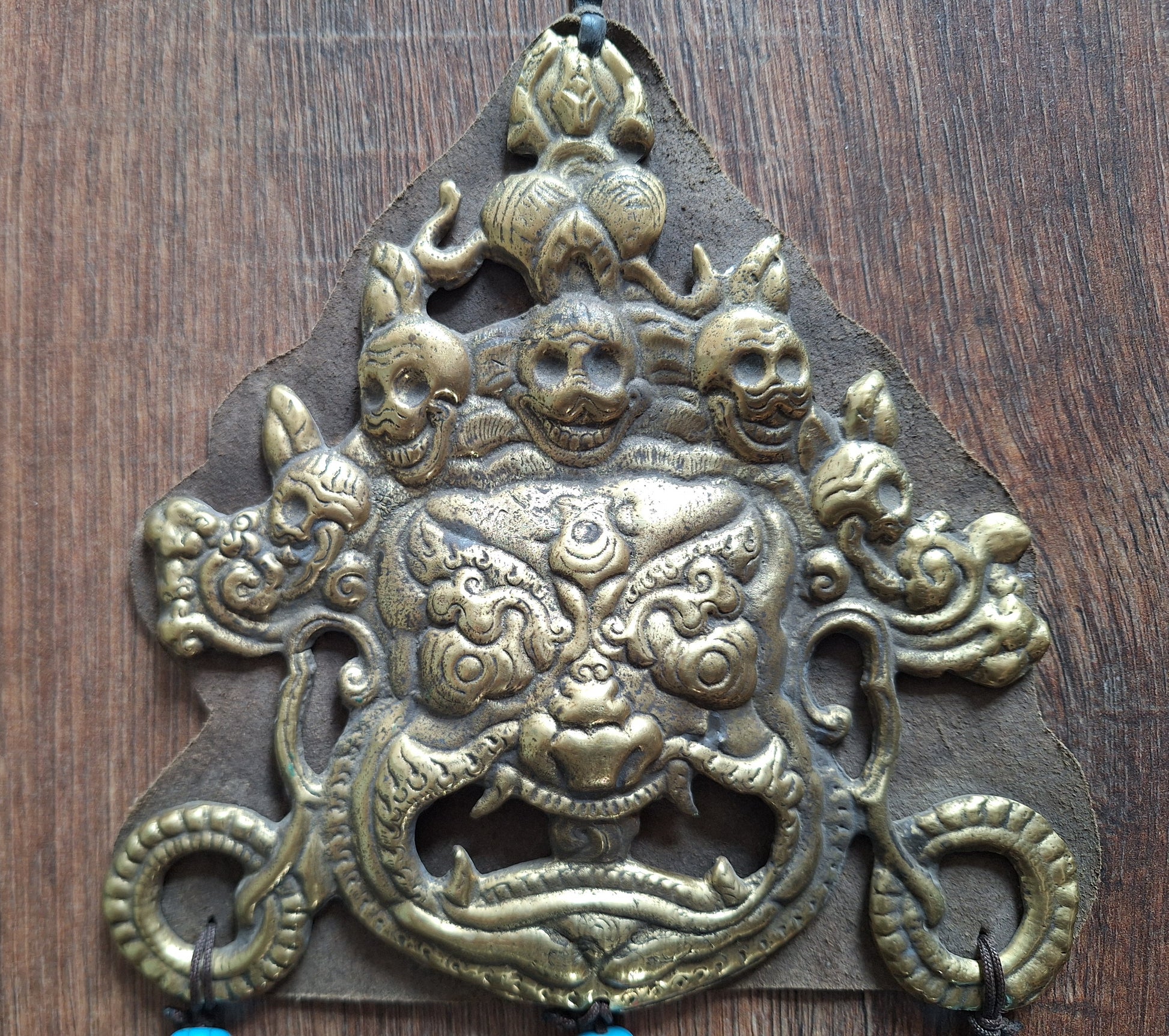 This Mahakala wallhanger comes from Tibet. It features a good quality brass mask attached to a background of dark brown leather fabric. For an extra decorative effect, underneath the mask a few strands of colorful (synthetic) beads have been added (reminiscent of the typical Tibetan (gem)stone trio of turquoise, coral and amber).