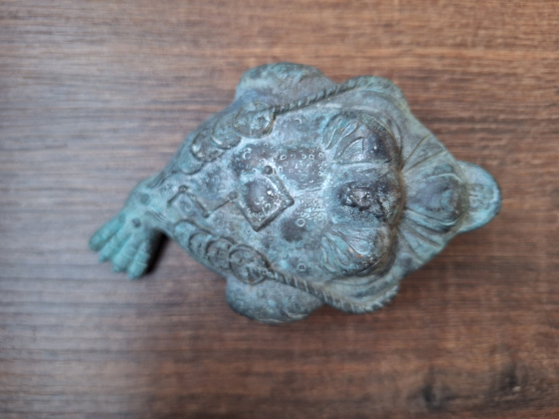 As is often done with such statues, after it has been made some special ingredients have been added to the inside of the statue, after which it has been closed with a seal with characters of good fortune (this can be seen on the belly of the frog). When you shake the statue carefully, you hear a slight rattling sound inside. Such ingredients are often a mix of chippings of precious stones and metals, herbs and grains and sometimes pieces of fabric or paper with symbols or mantra's on it. These fillings are an offering to the spirit of the statue and adding them enlivens and blesses it for its purpose.
