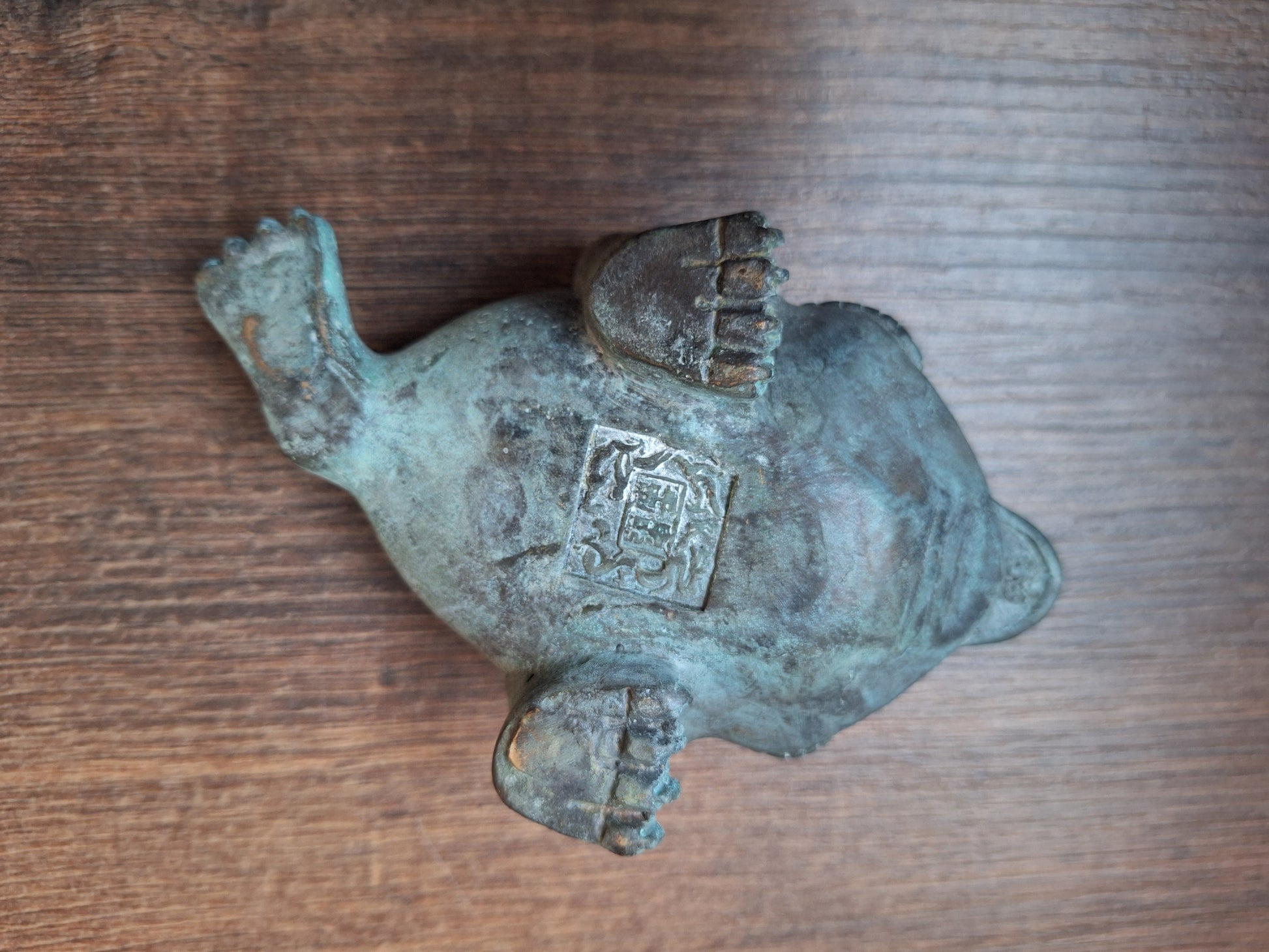 This statue has been made in a very nice 'antique-look'; the bronze has been treated to attain a green-grey antique color. The statue is from vintage origin and in good condition. This statue is approximately 15 centimeters long, 9,5 centimeters wide and 5,5 centimeters high. It weighs 559 grams.