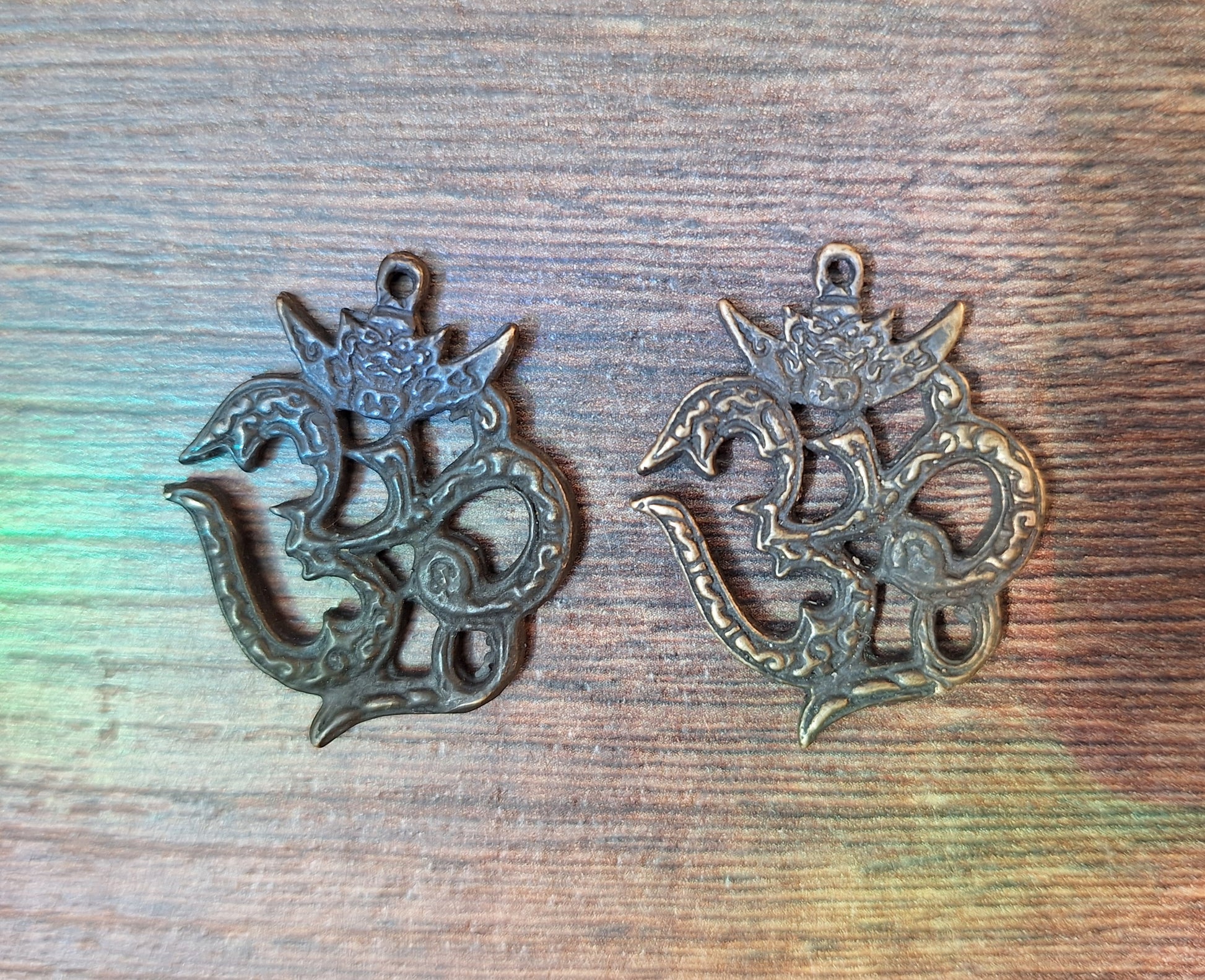 Vintage bronze pendants with the symbol for the (mantra)word "Aum". This symbol and its sound, when spoken as an individual seed mantra or as part of a bigger mantra, is said to be the all encompassing cosmic vibration of the universe. It represents all times, all awareness of times and the overtaking of time itself. When recited, it activates and energizes all the chakra's.