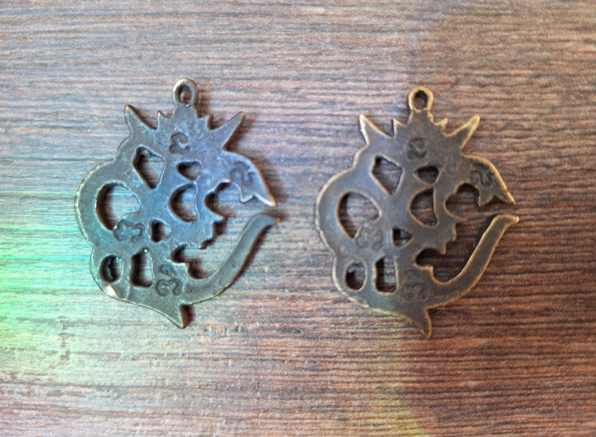 The pendants are approximately 36 millimeters high (including the eyelet) and 39 millimeters wide and weigh 8 grams. Also on the back they are stamped a few times with the symbol Aum.