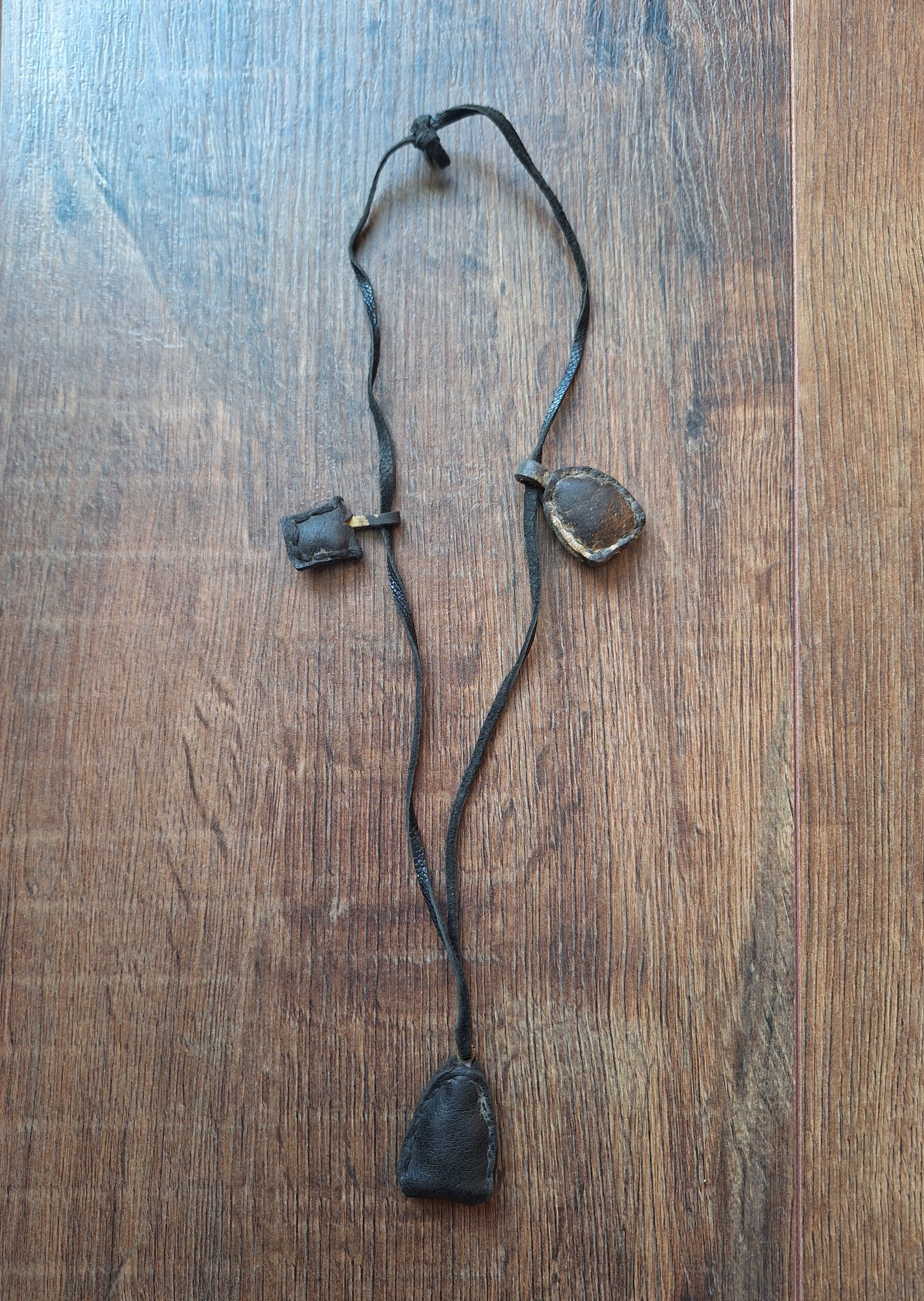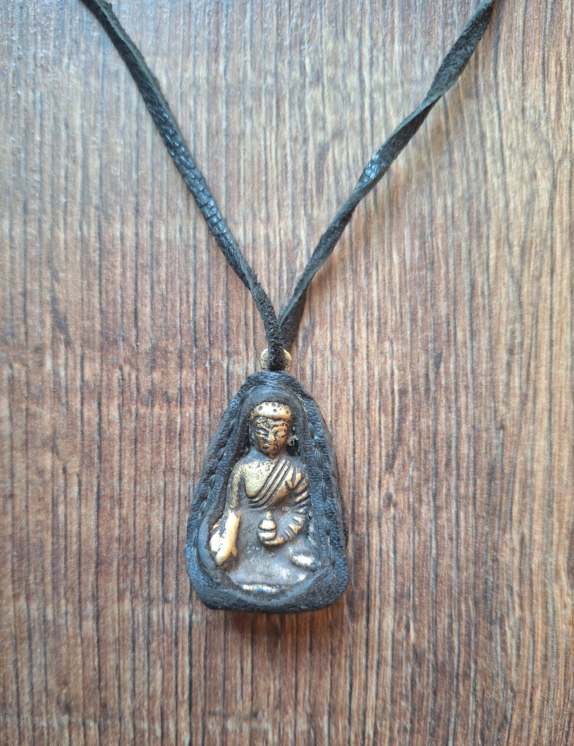 Necklaces in this traditional style are most commonly handmade by buddhist monks in temples, to be sold as amulets for pilgrims and tourists. On a yak leather cord, three pendants are hung; the central one holding a brass depiction of Amitabha Buddha with a Long Life vase in his hand, and on both sides a small leather 'pillow' style amulet. These pillows are filled with a mix of different sacred and blessed ingredients and can contain for example grains, herbs, stone chips and ashes from sacred fires.