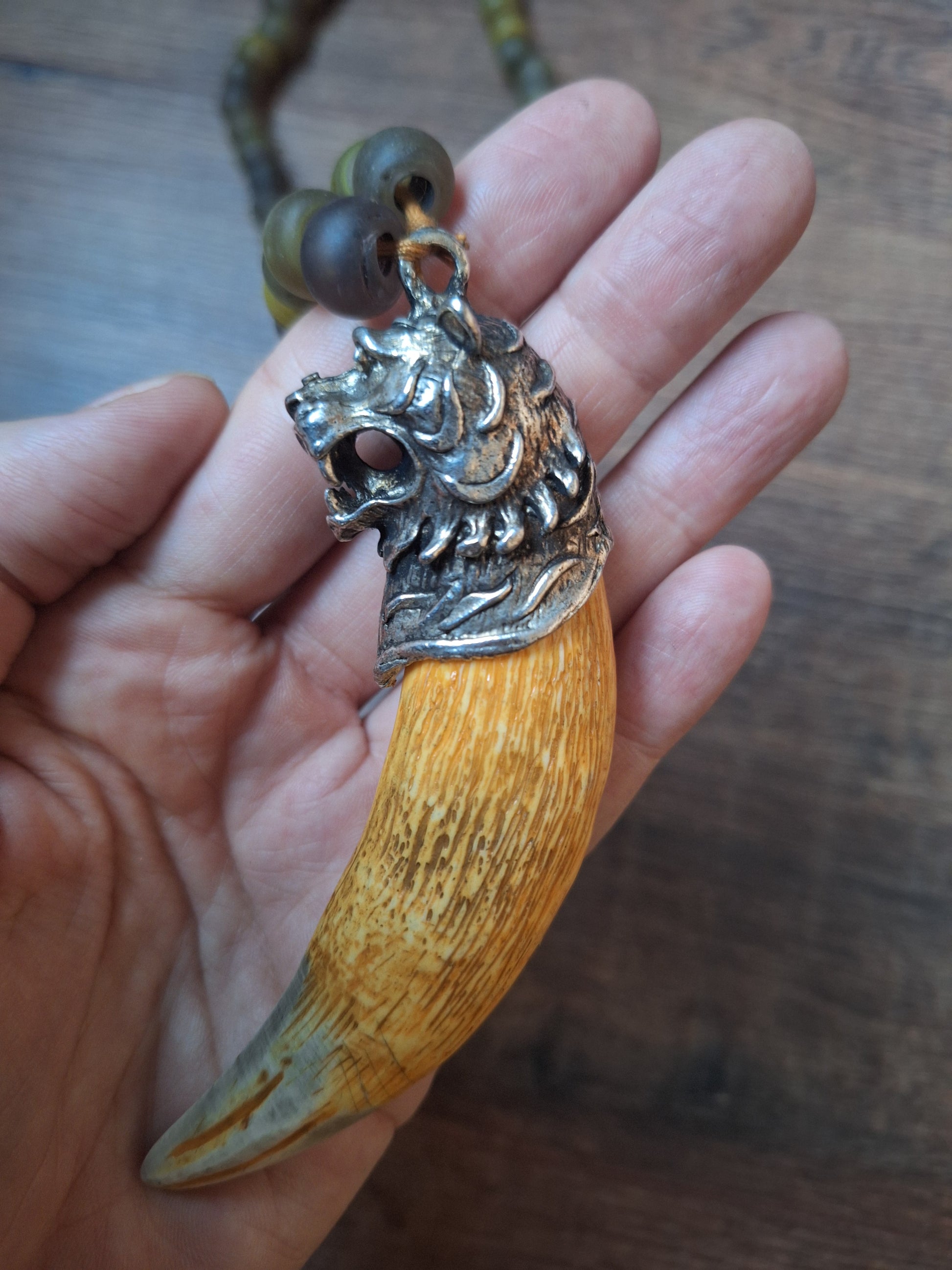A resin tiger tooth in a Tibetan silver setting with the face of a tiger is the eyecatching centerpiece of this necklace. This pendant is approximately 13 centimeters long, measured going along with the outside curve.