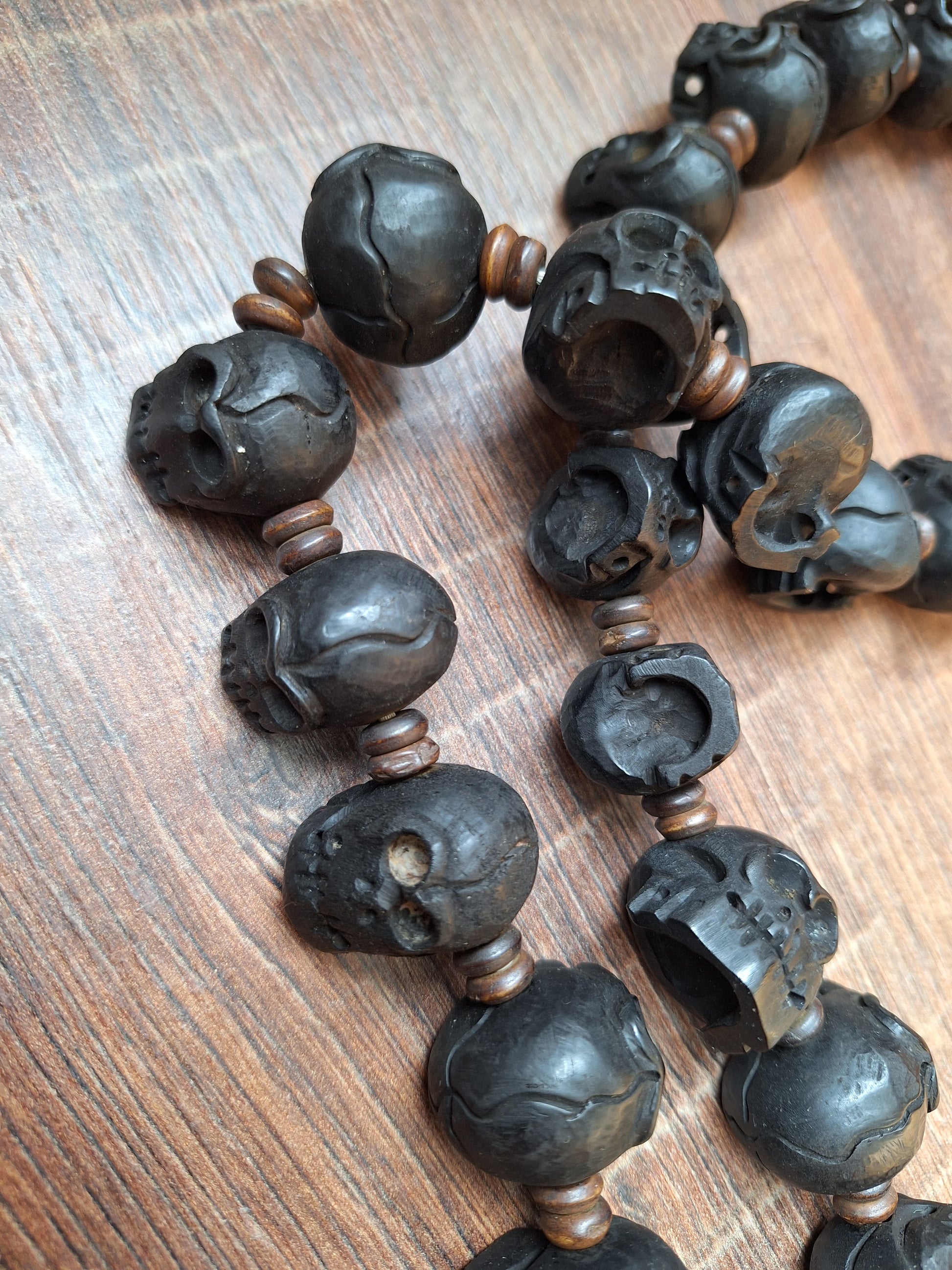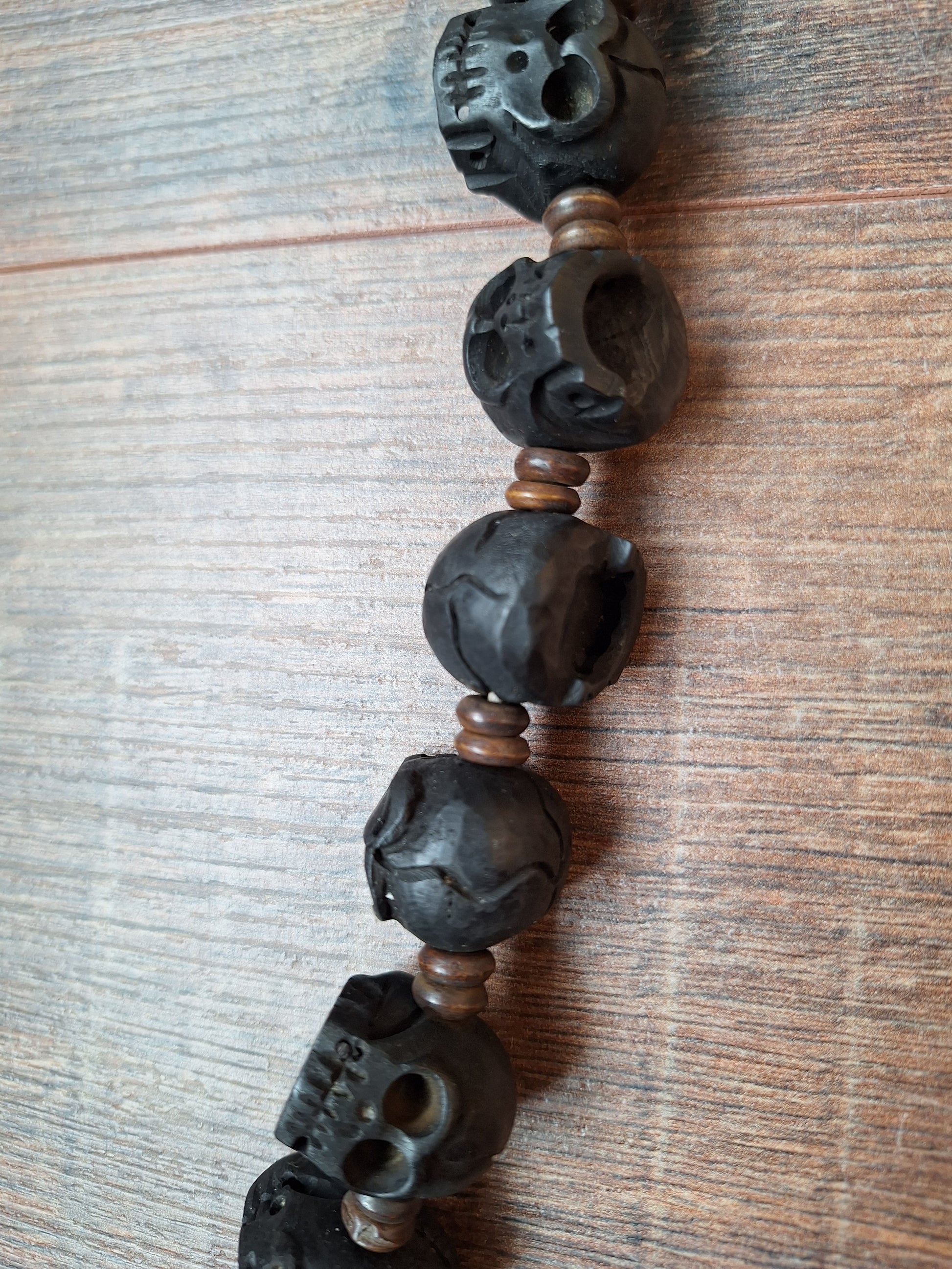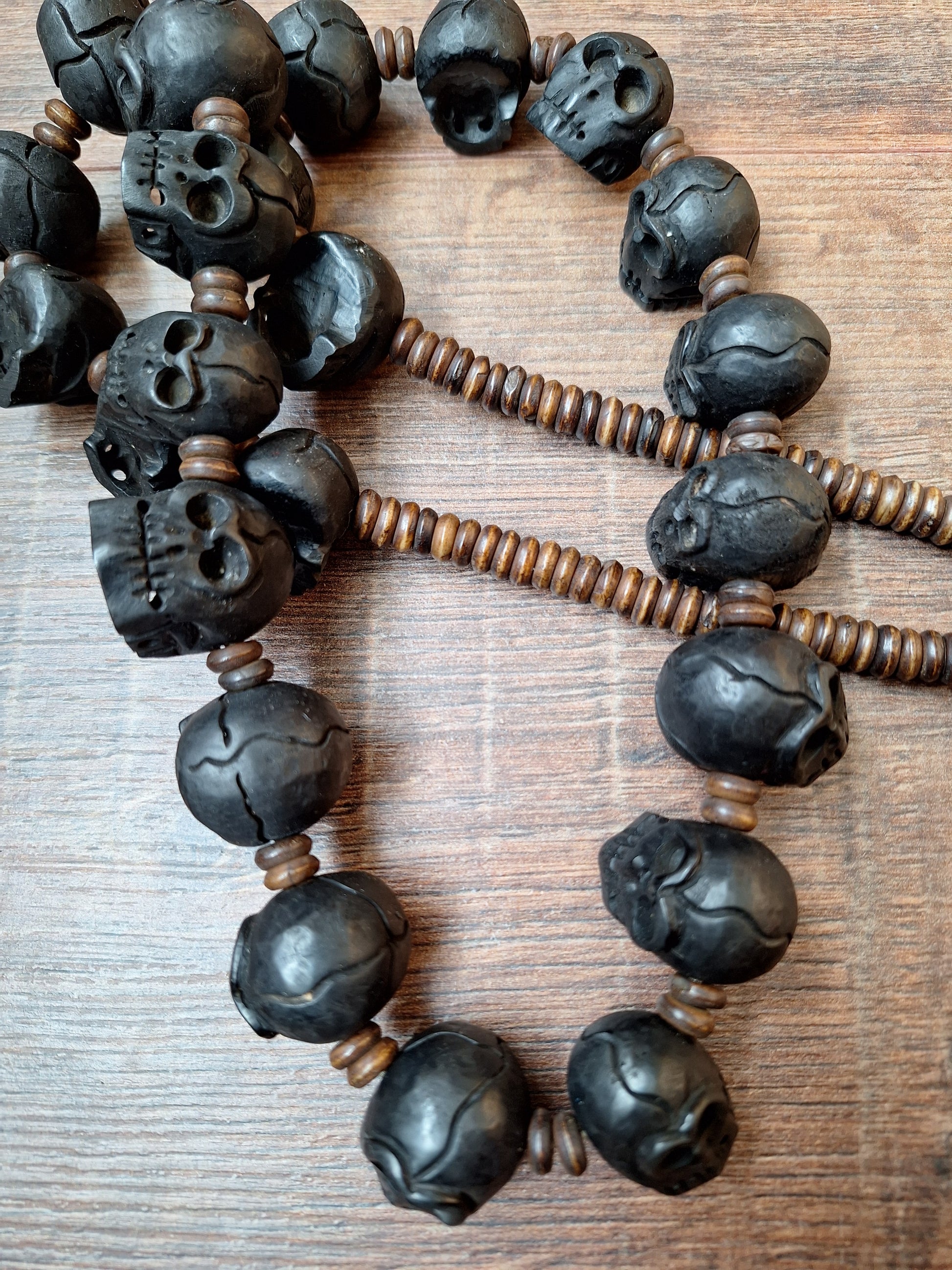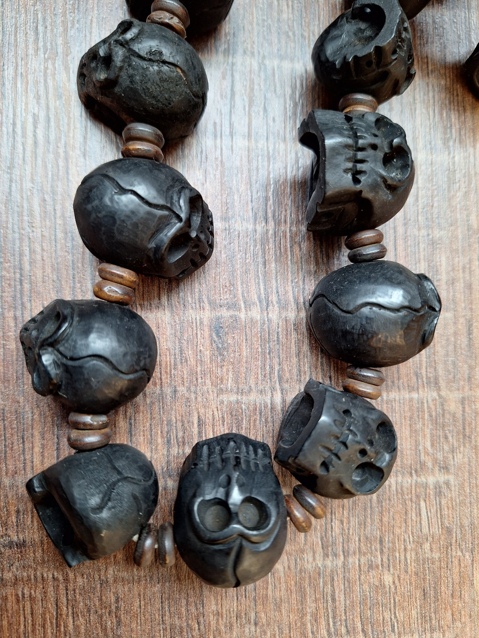 Very beautiful necklace made with large black skull beads carved from buffalo horn. The skulls have been completely handcarved and therefore all a bit different and unique in appearance.