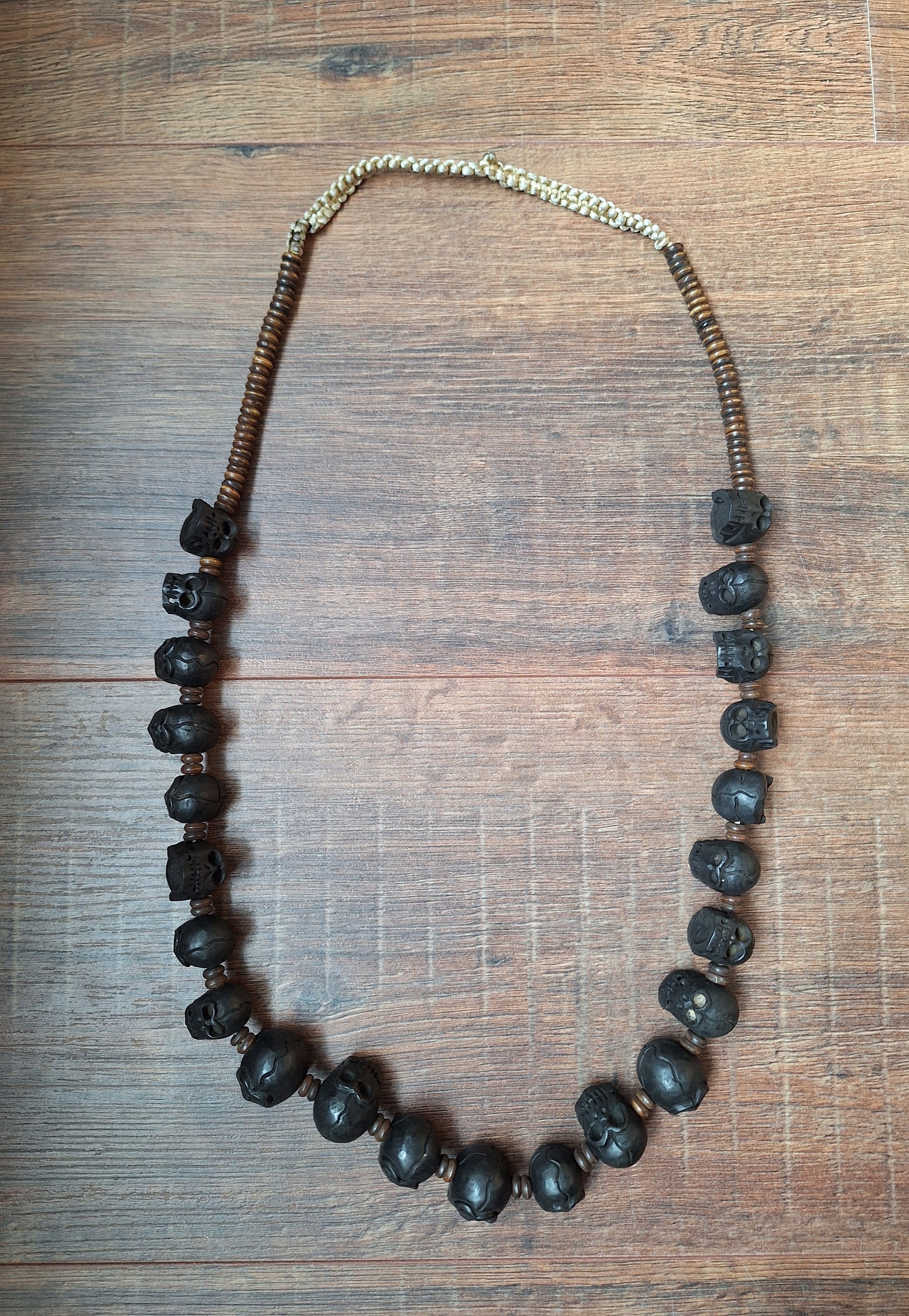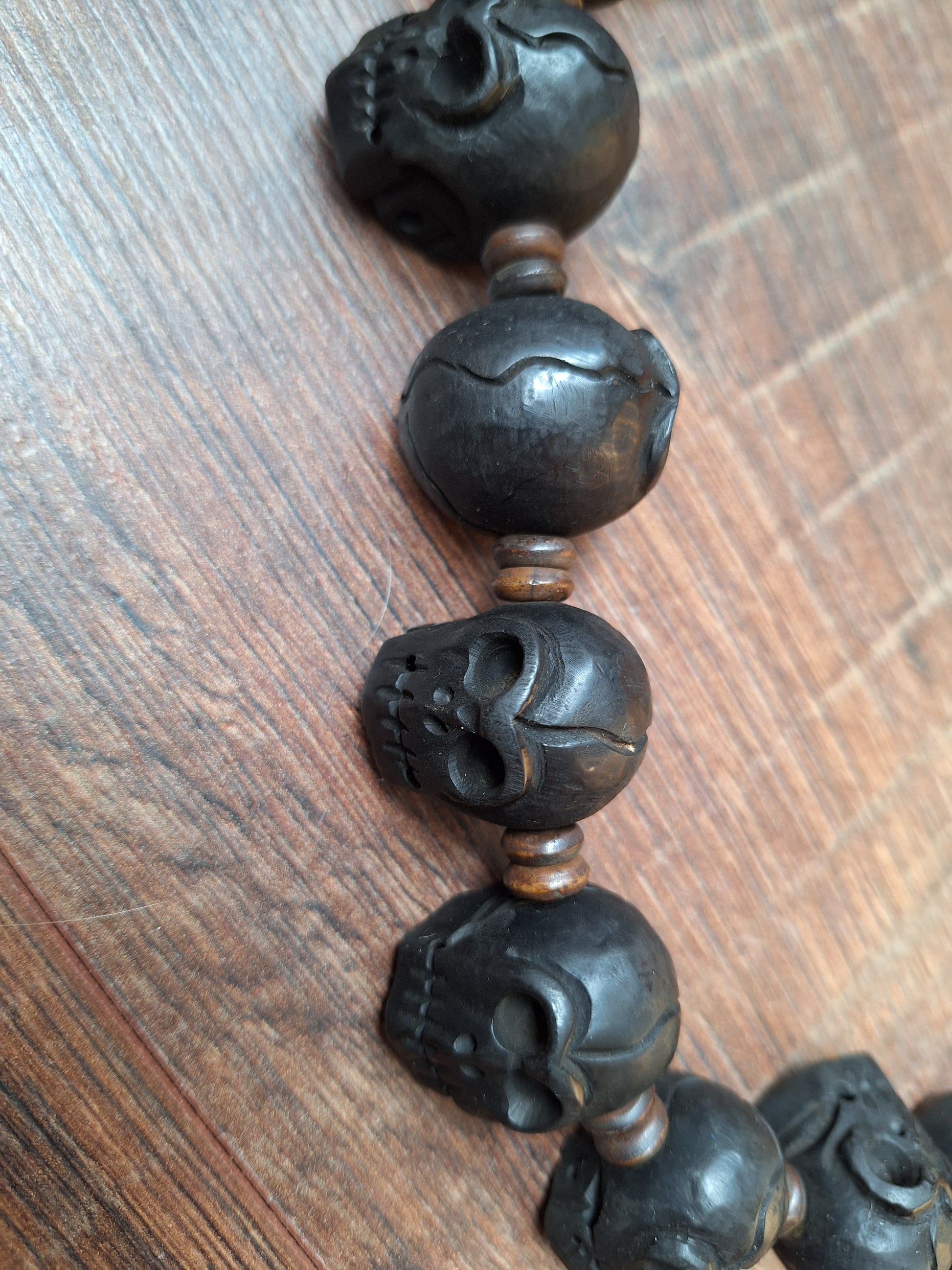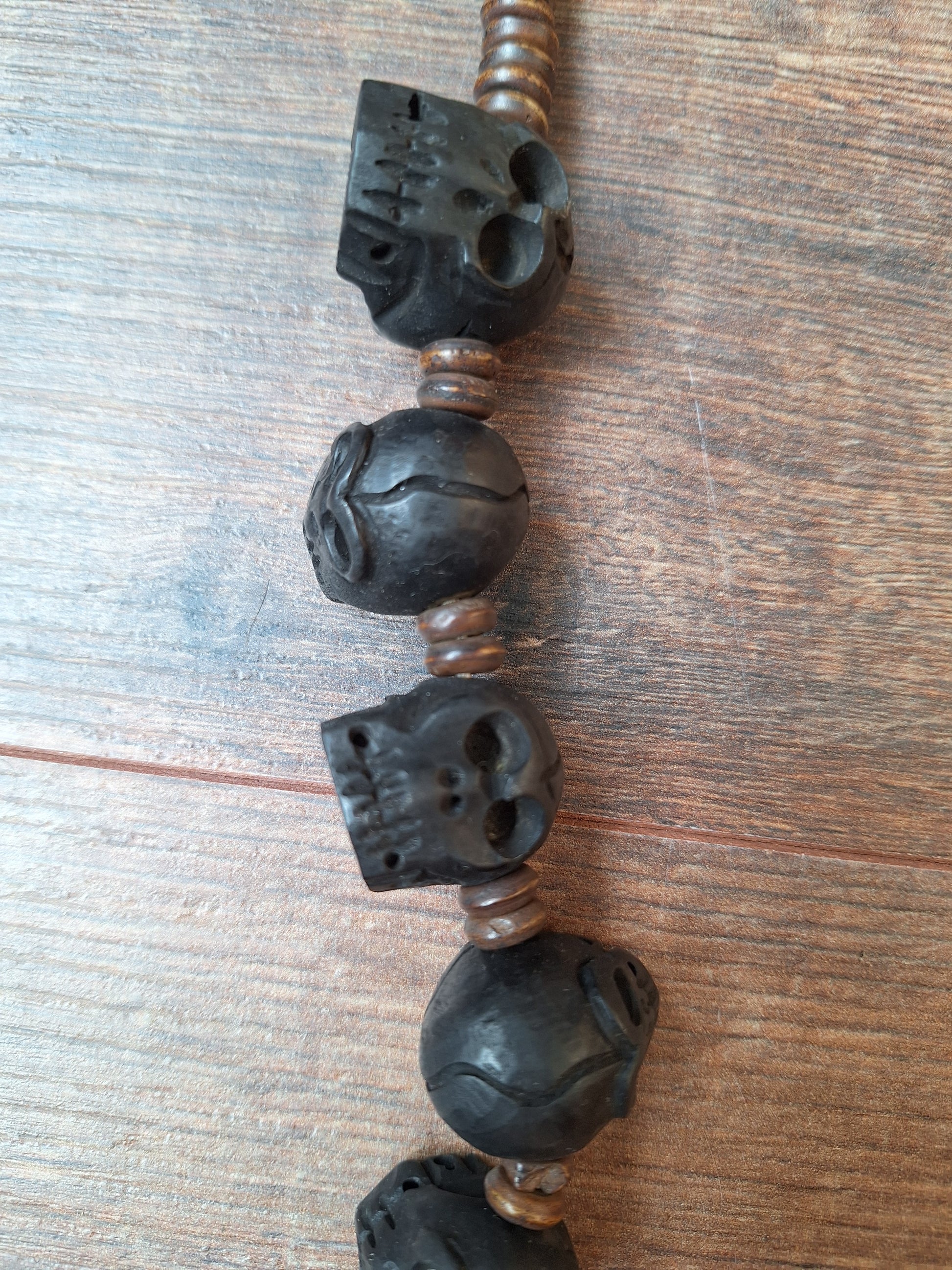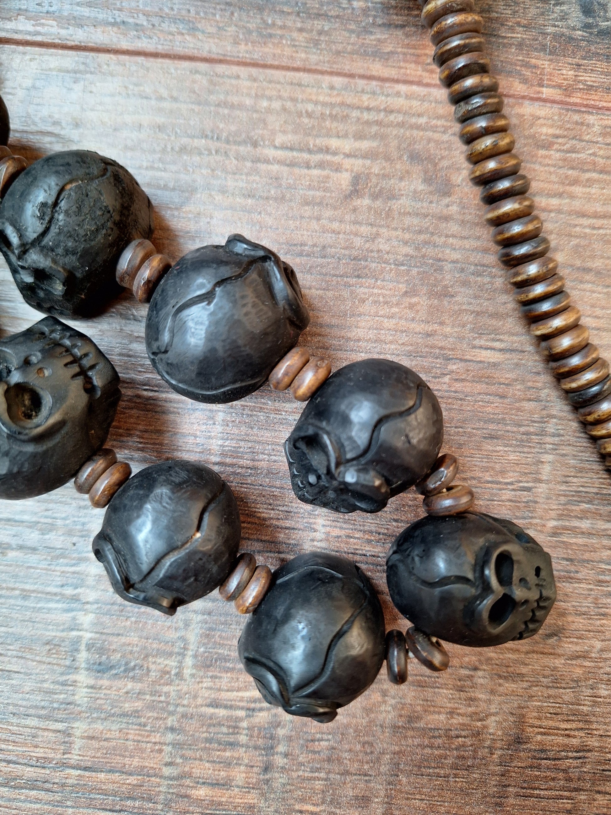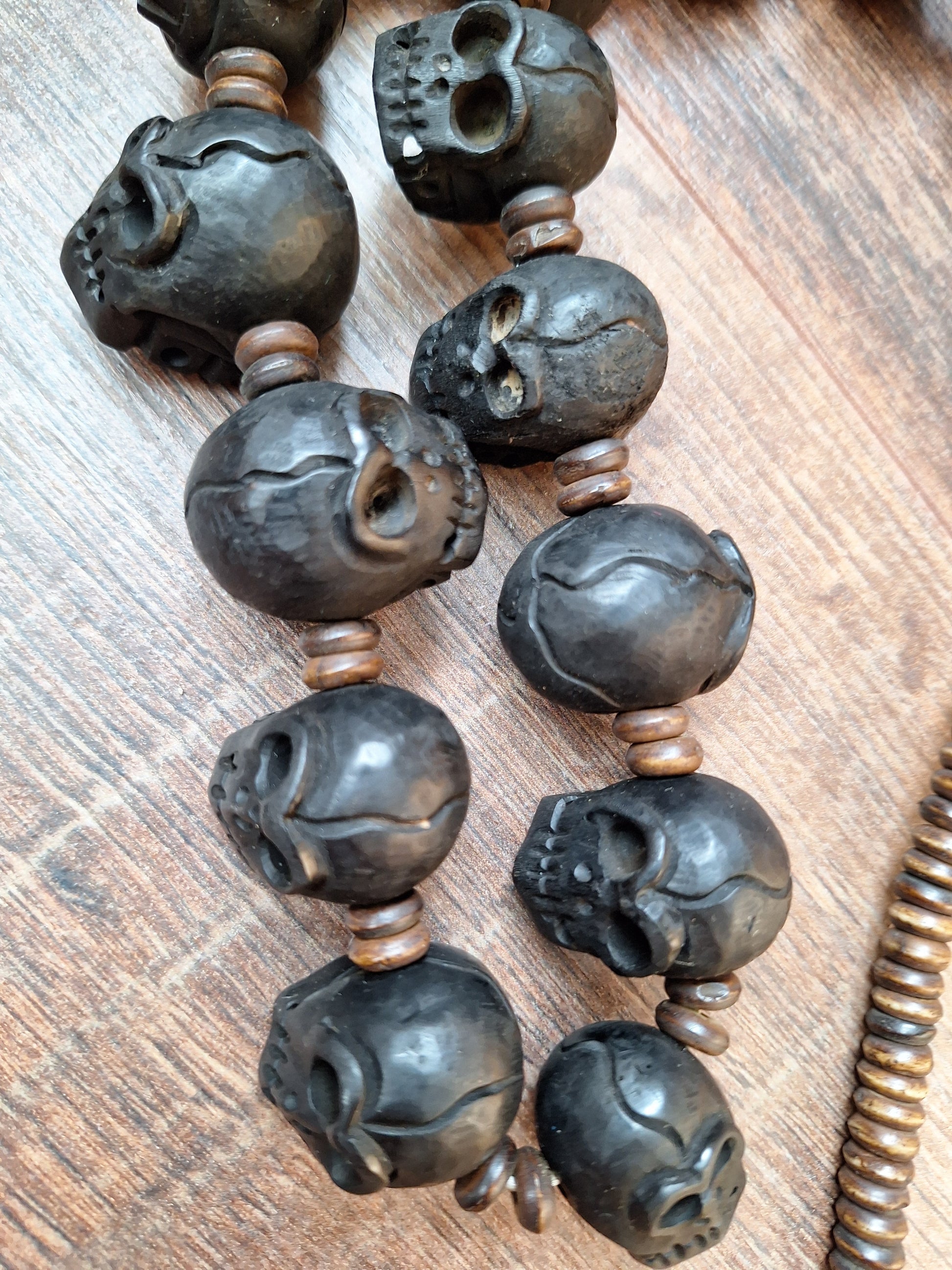 Very beautiful necklace made with large black skull beads carved from buffalo horn. The skulls have been completely handcarved and therefore all a bit different and unique in appearance.