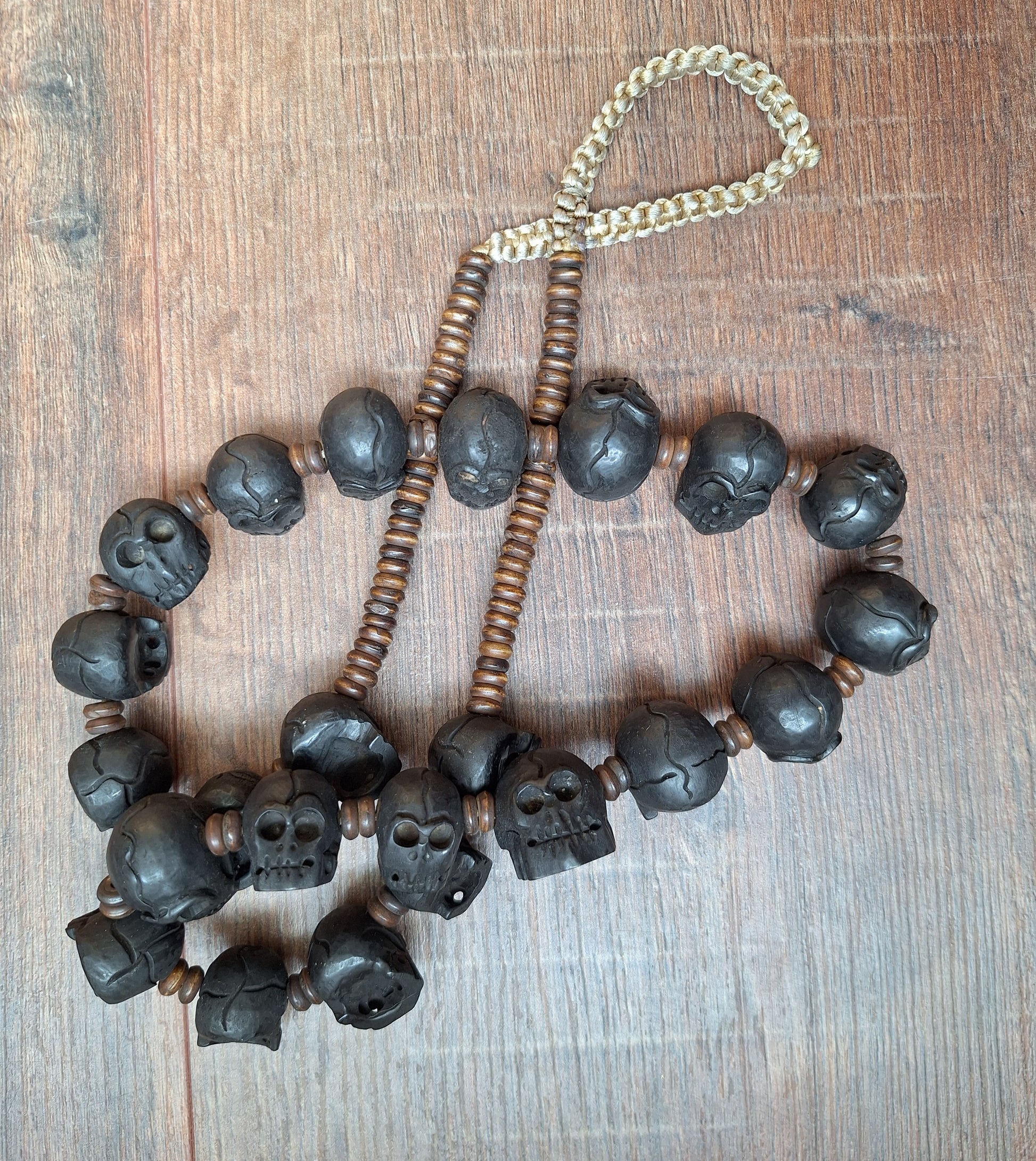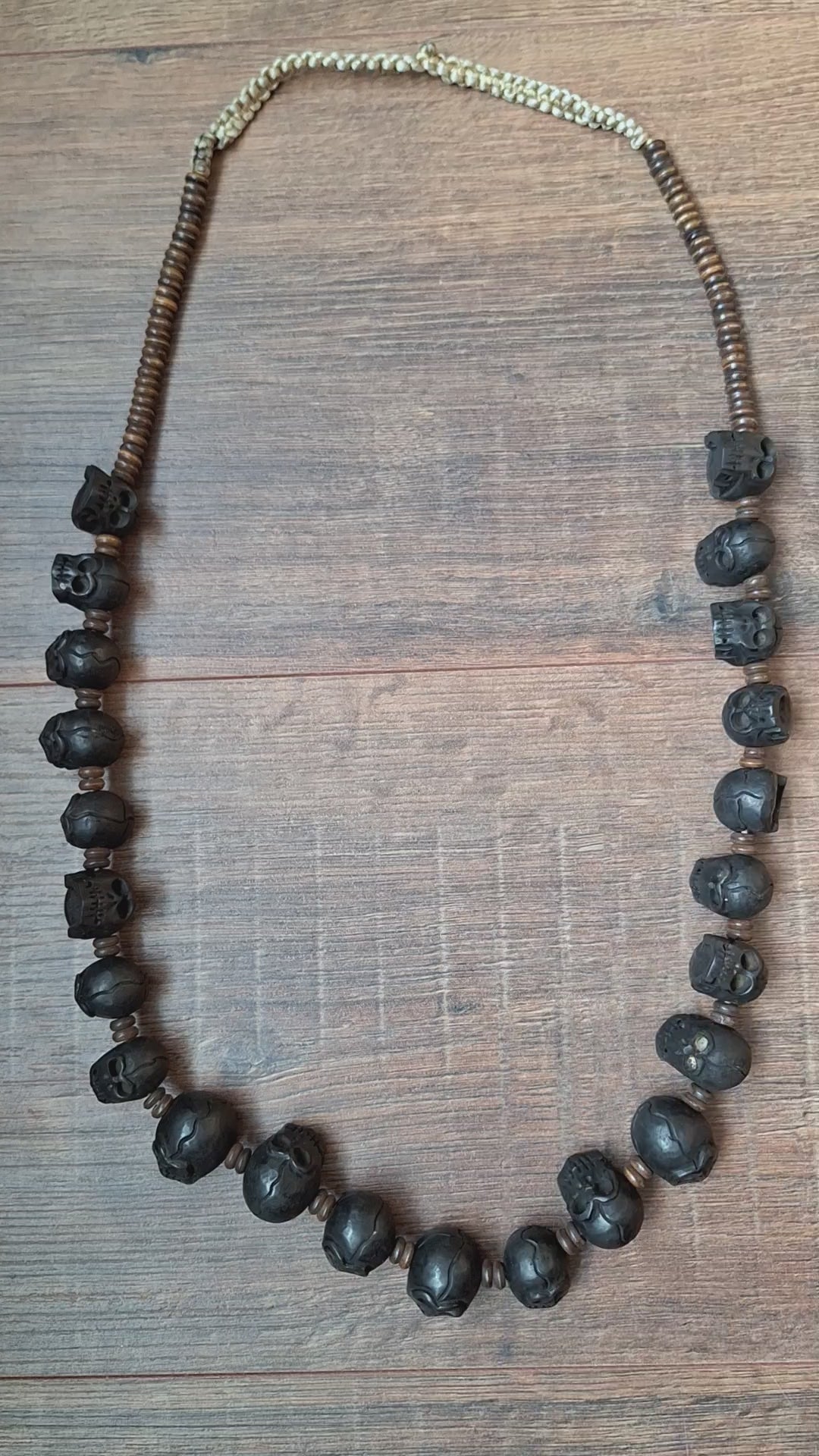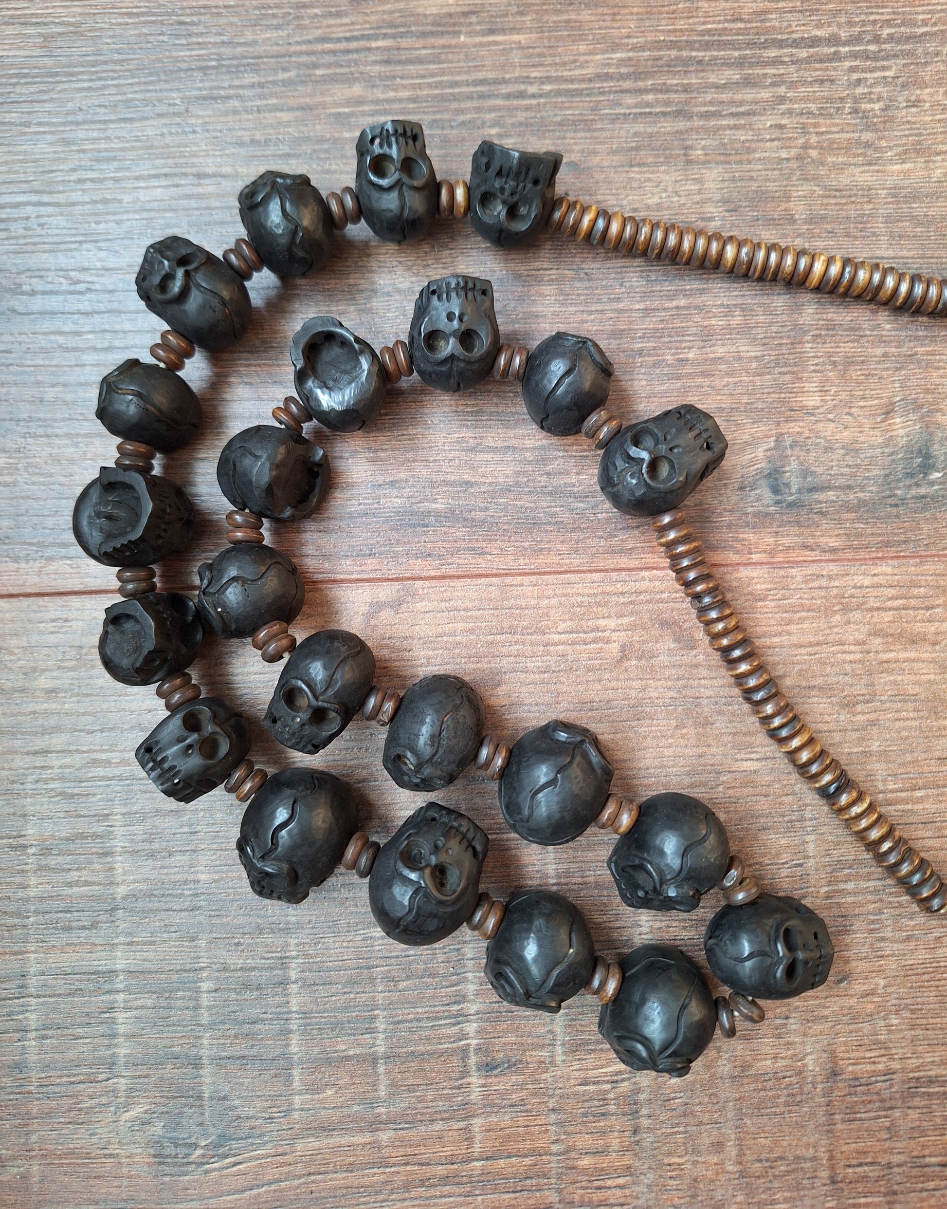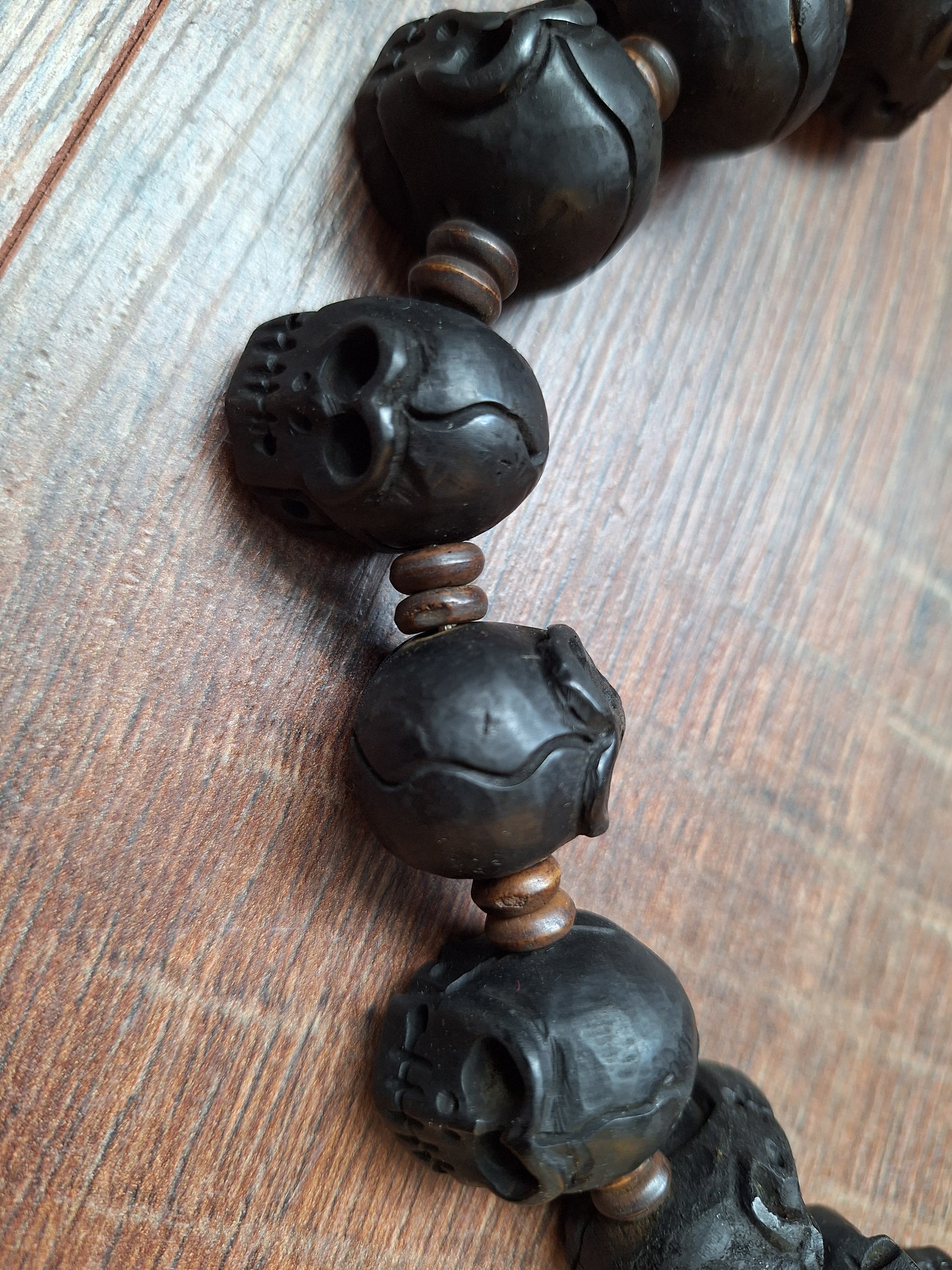 Very beautiful necklace made with large black skull beads carved from buffalo horn. The skulls have been completely handcarved and therefore all a bit different and unique in appearance.