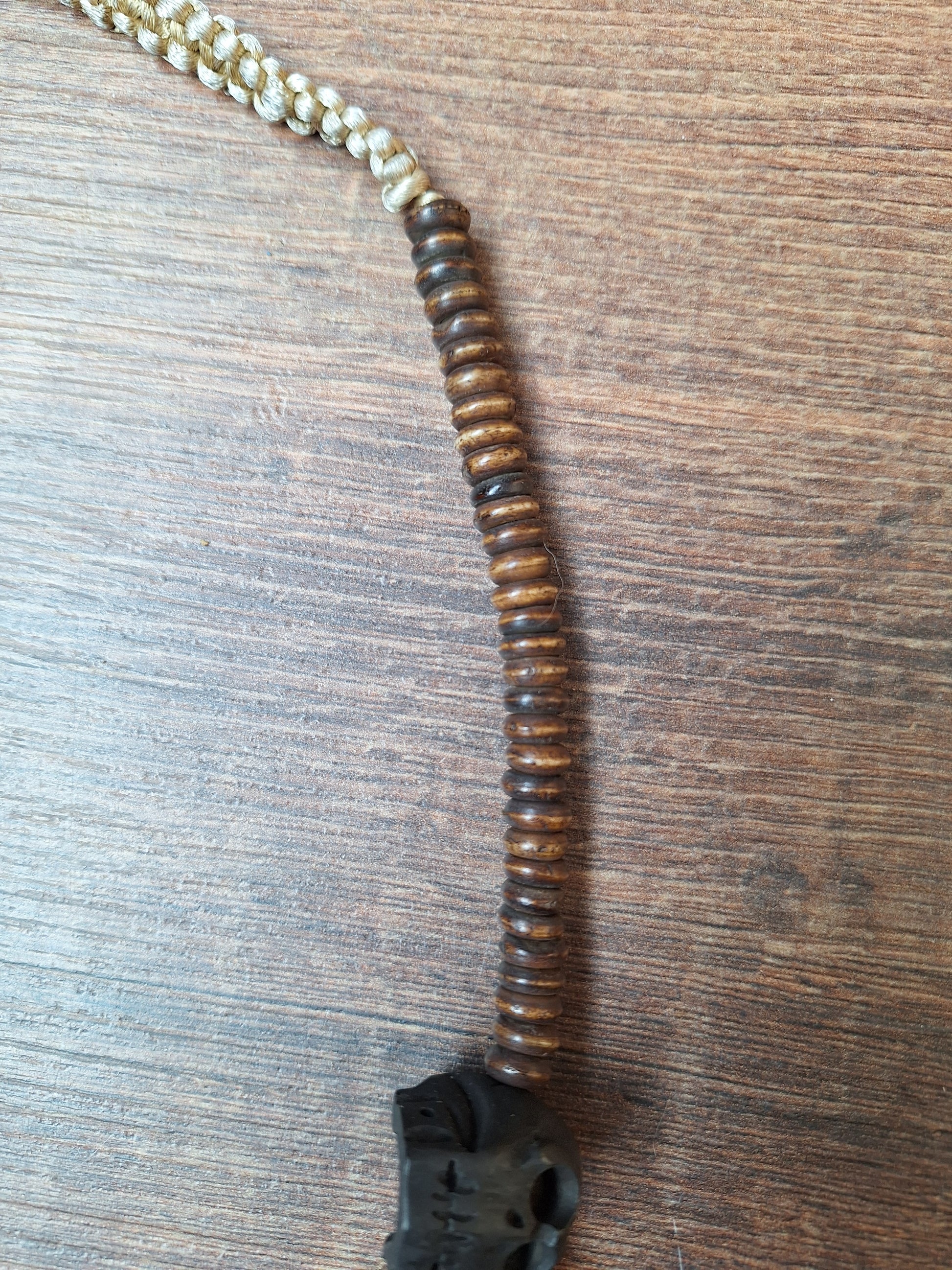 The skulls have been strung on beige satin macrame cord, together with some smaller sized flat brown yak bone beads.