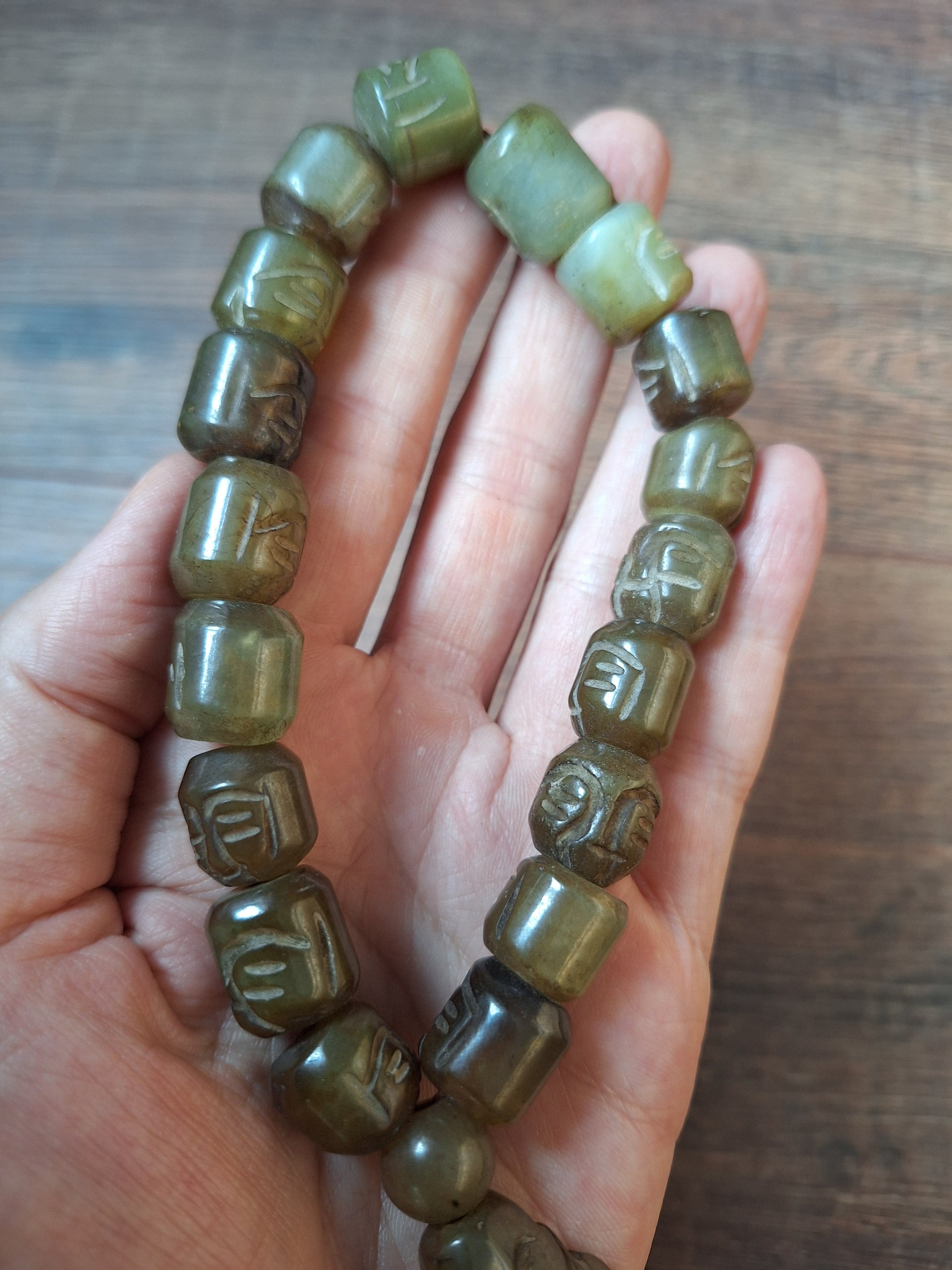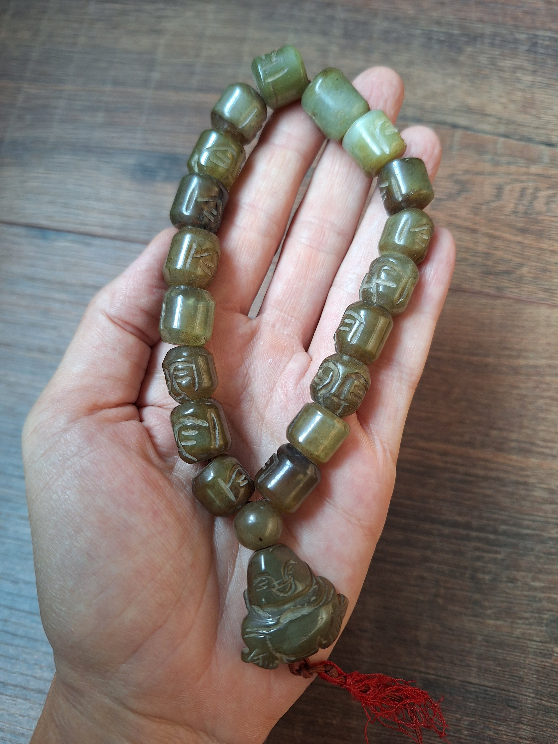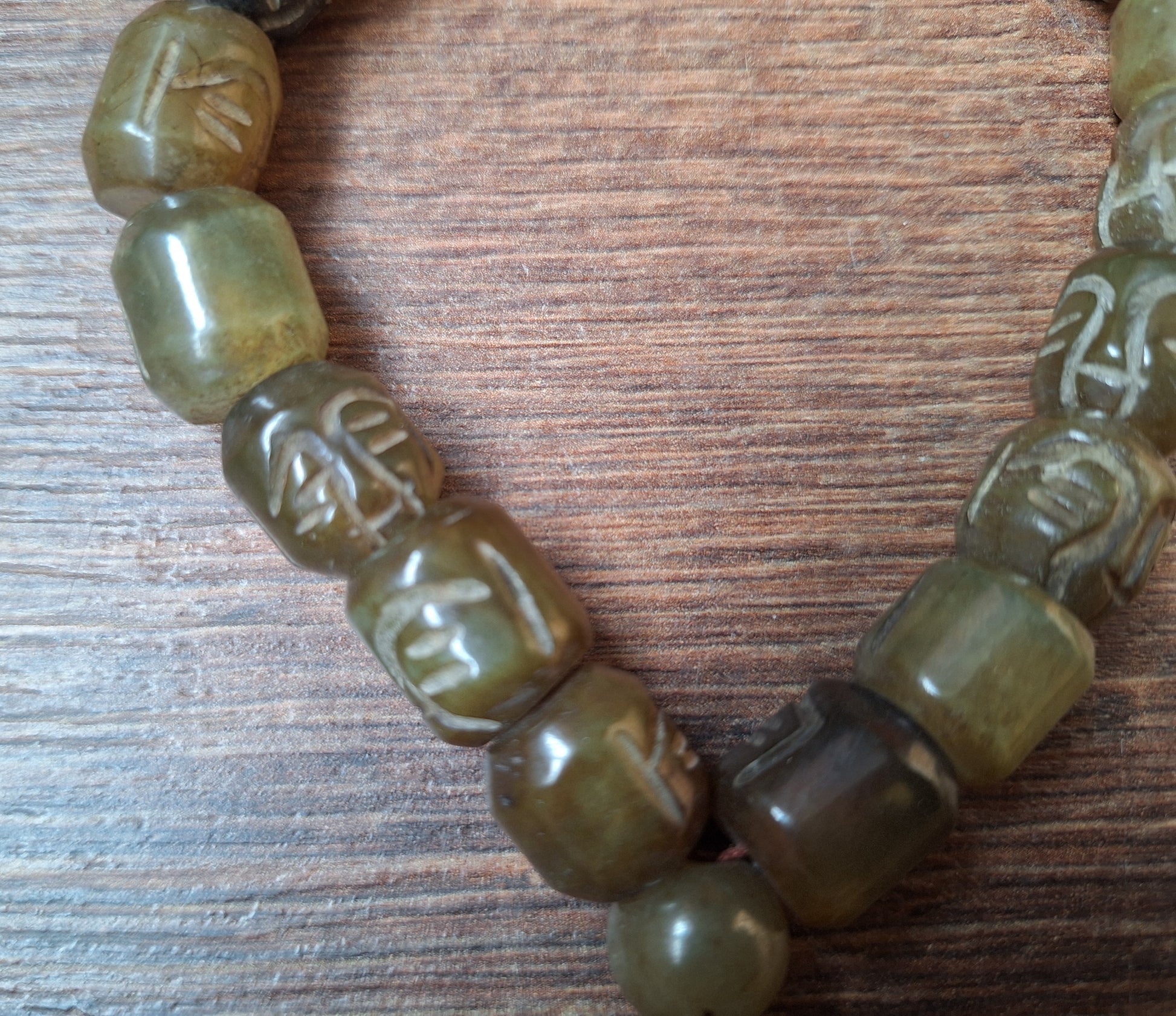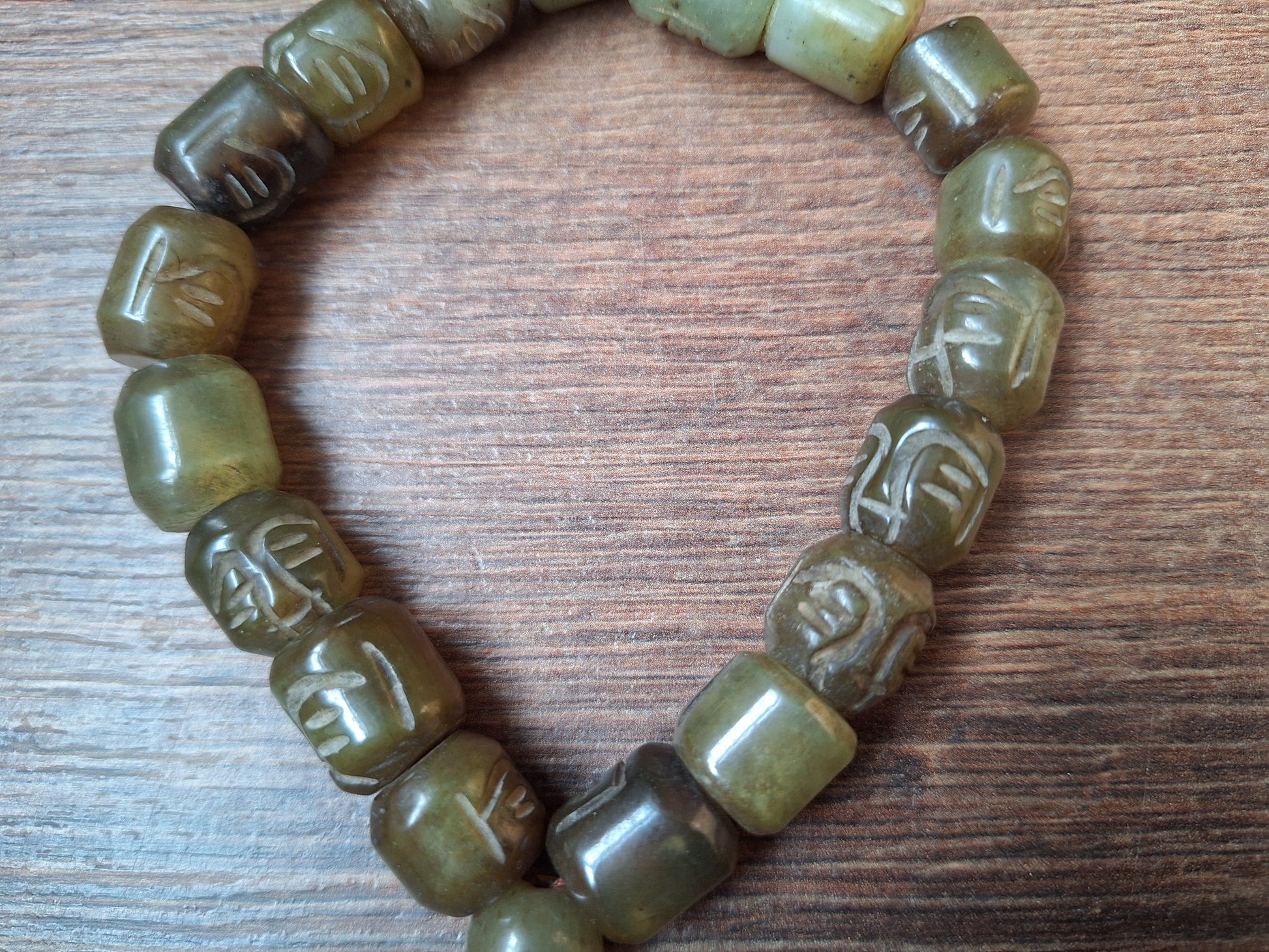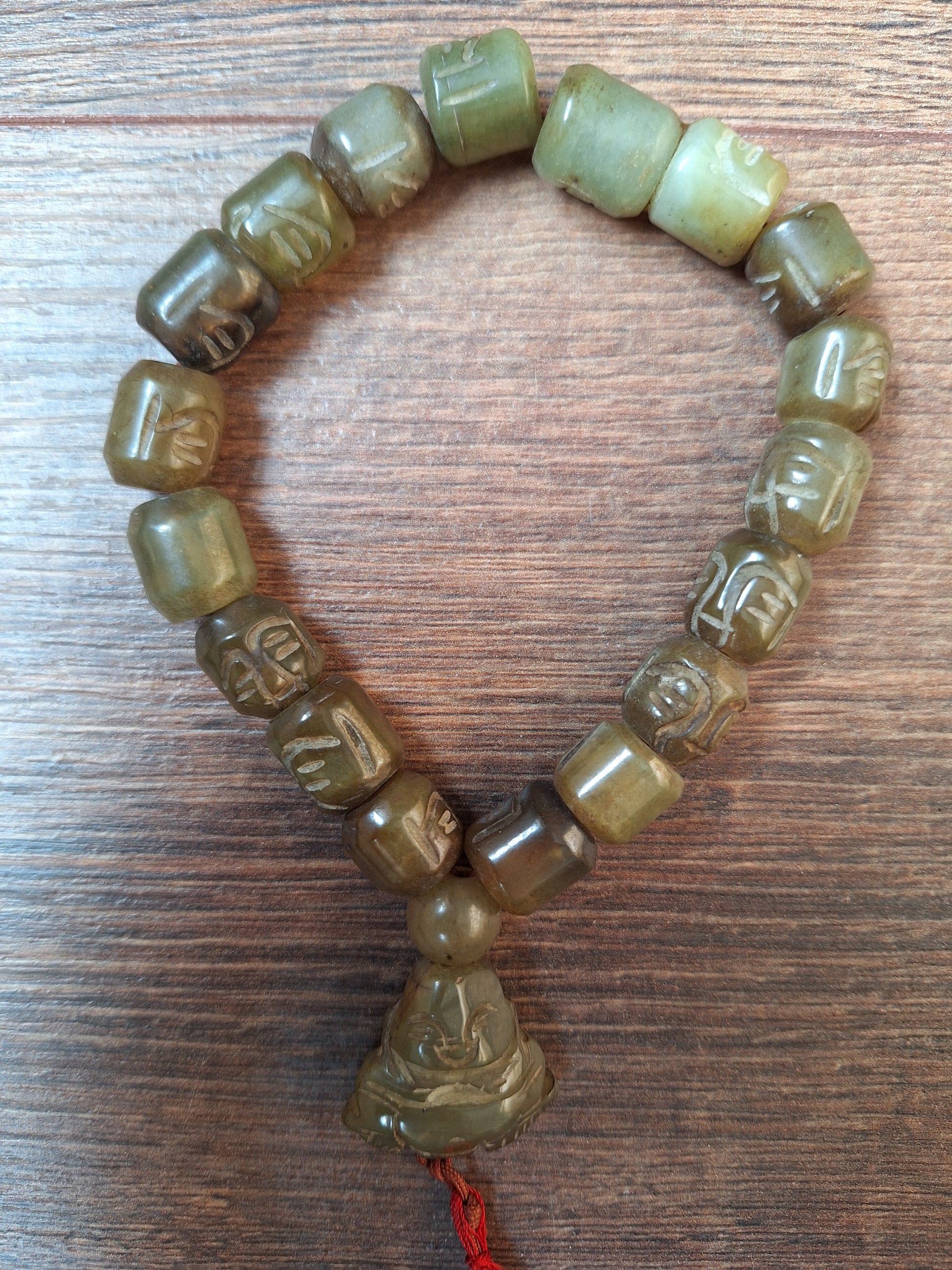 Beautiful Tibetan mala made with beads from natural jade, in mostly green color shades with a little hint of brown/yellow here and there. A handcarved jade buddha pendant is attached to the guru bead. Also all the beads are handcarved; in most of the carvings the face of the buddha can be recognised.