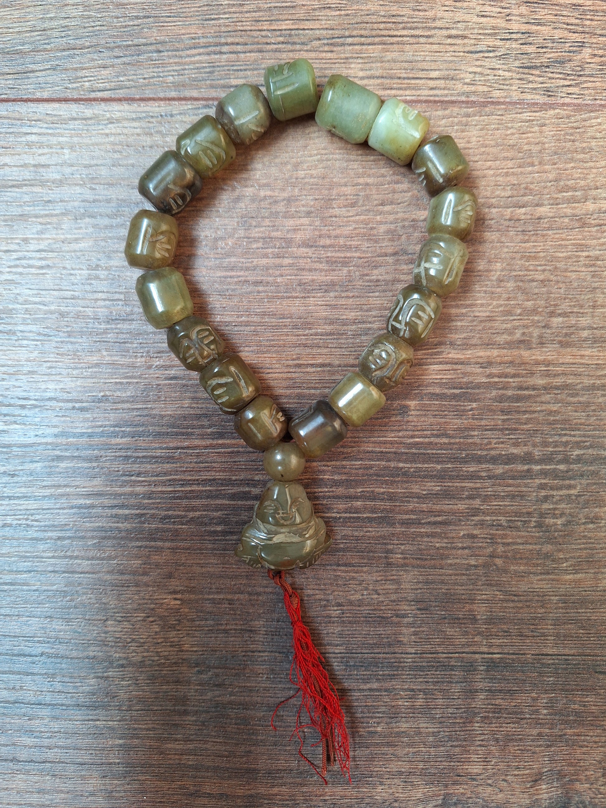 Sizes; approximately 30 centimeter (measured without the pendant and tassel). The buddha pendant is approximately 2,5 centimeters long and 3 centimeters wide and each bead is approximately 13-16 millimeters high and 13 millimeters wide. Total weight; 97 grams.
