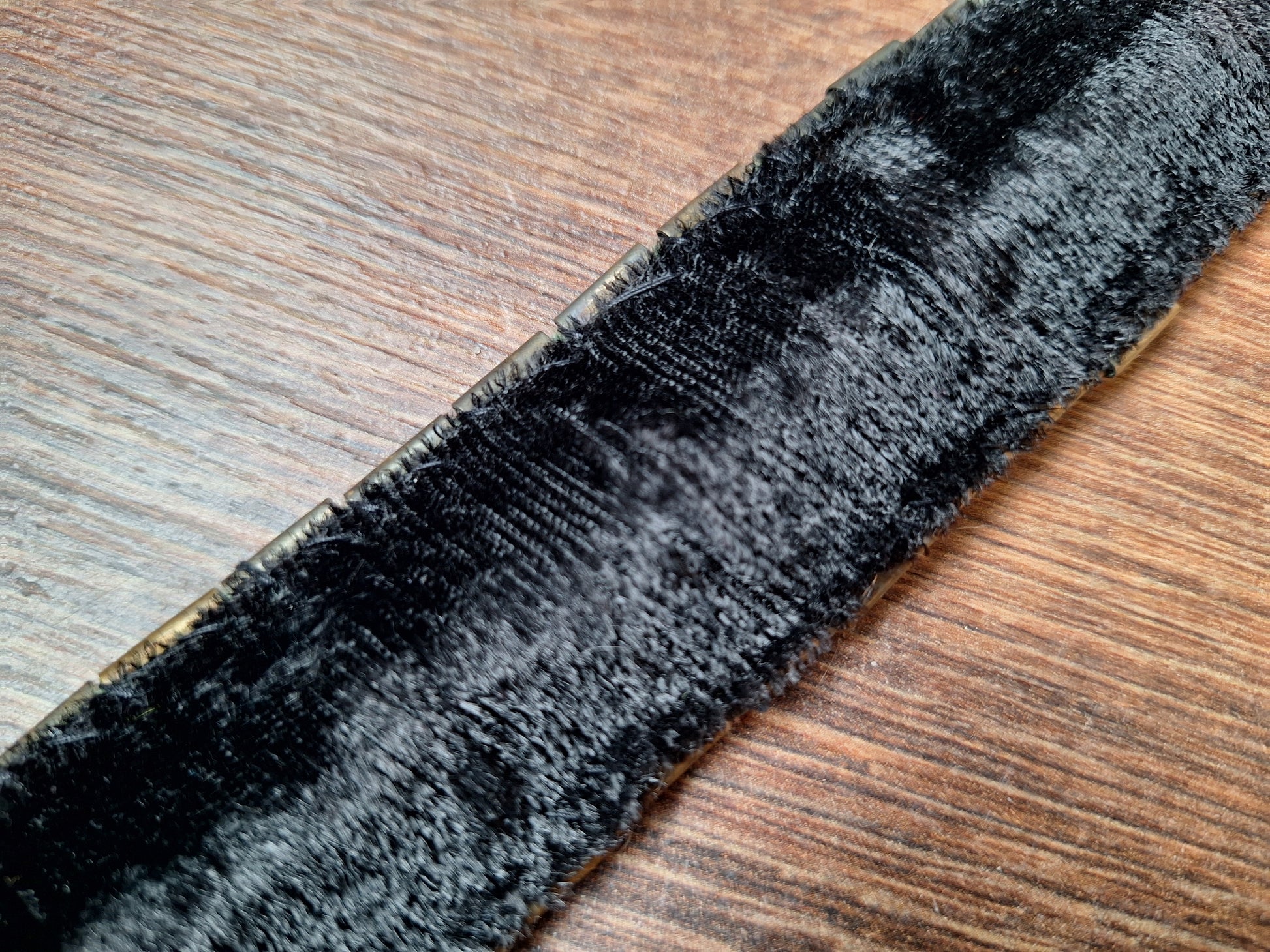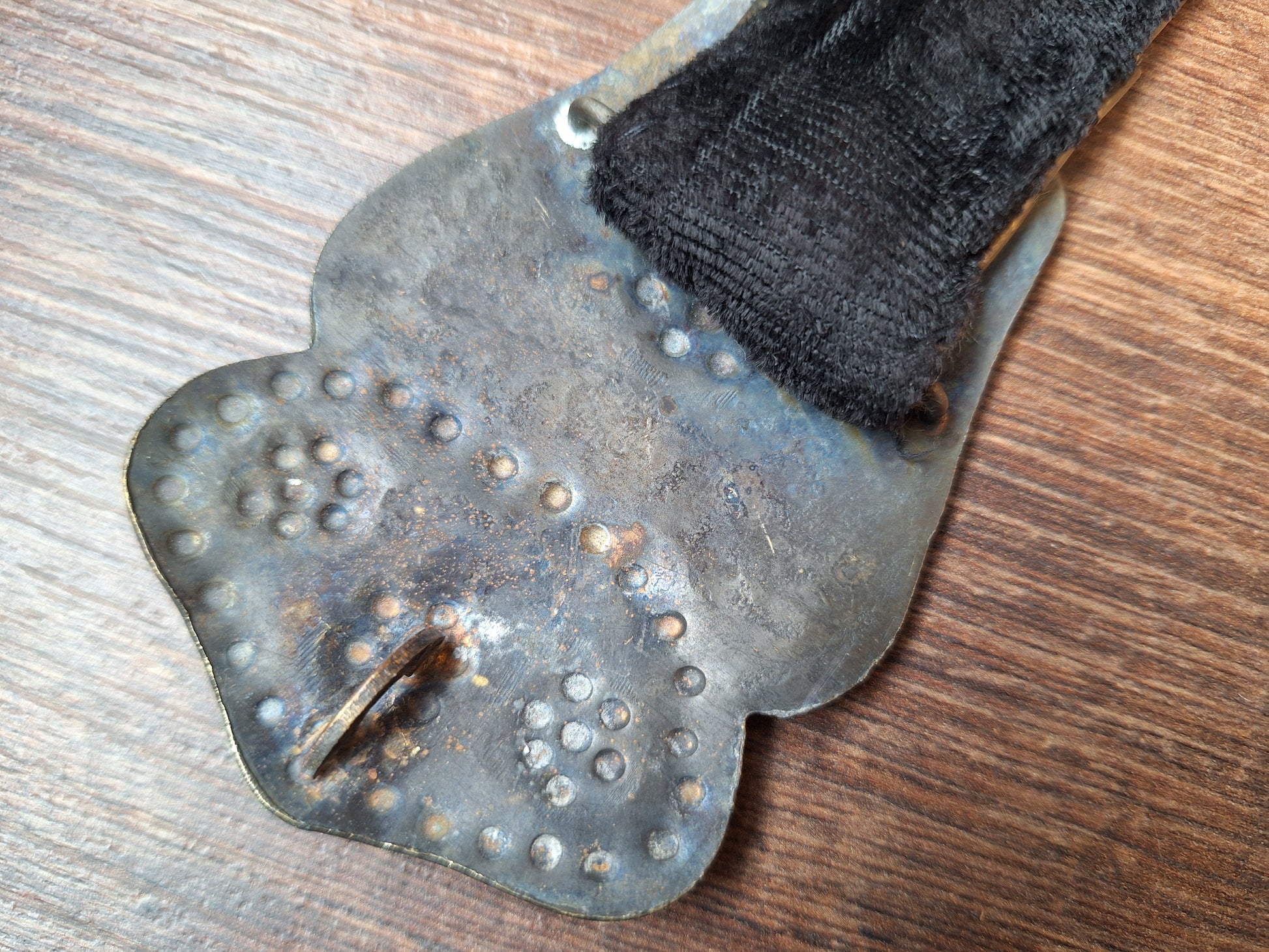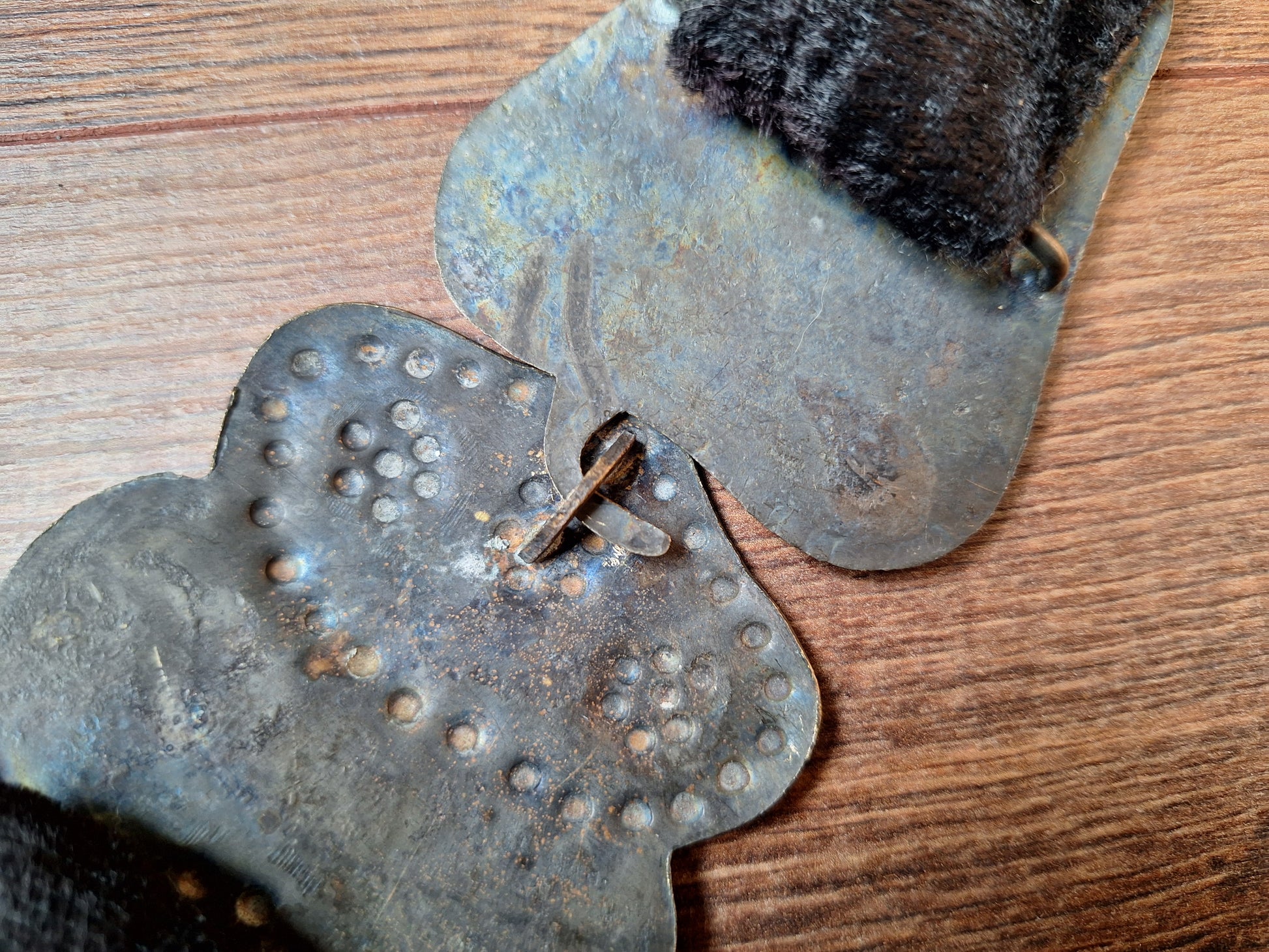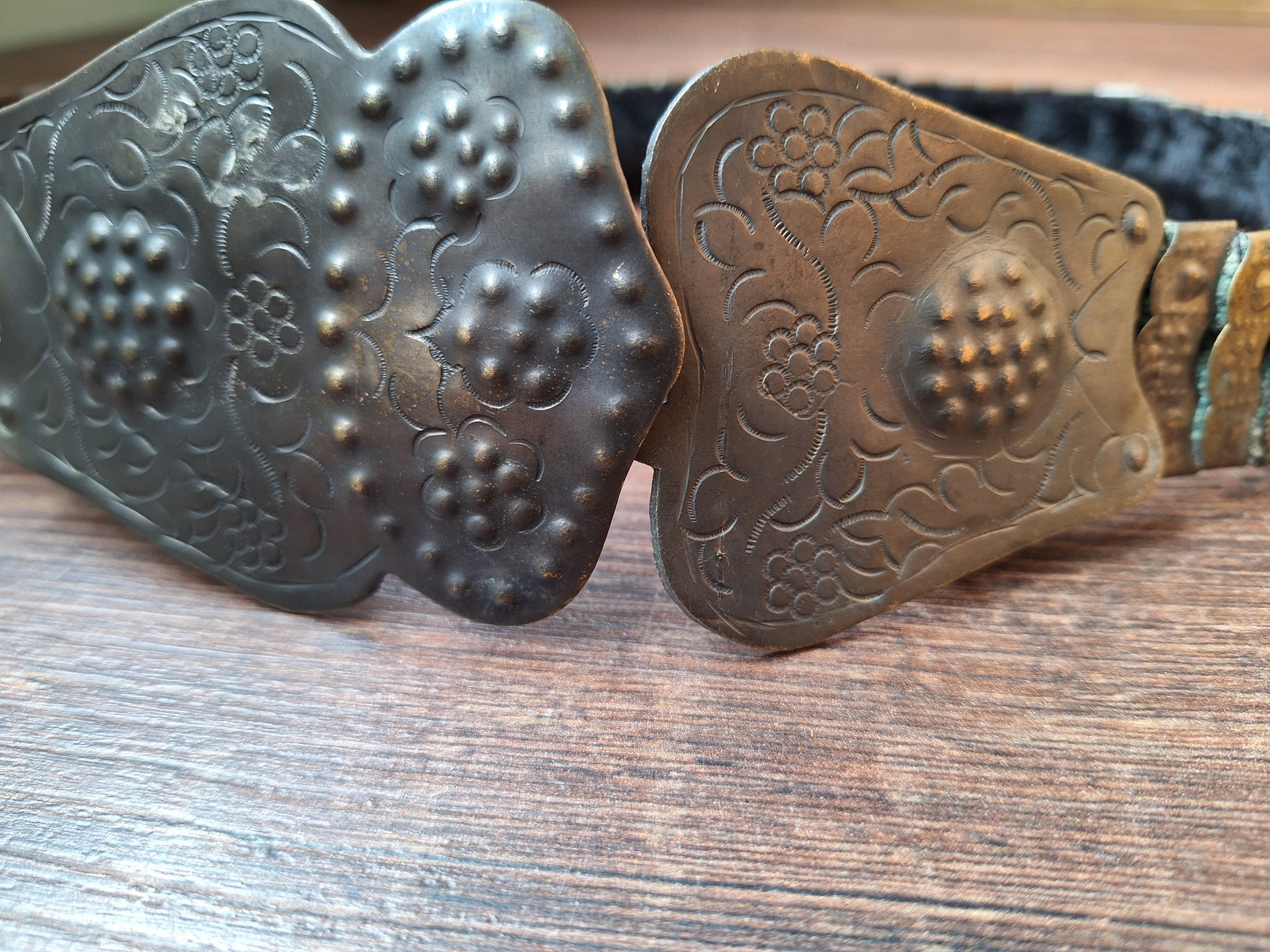 The belt consists of a chain of individual brass links, connected with each other on a base of black velvet lining. The belt closes with a hook and eye mechanism underneath the buckle. Chain links and buckle are very nicely decorated with embossing technique.