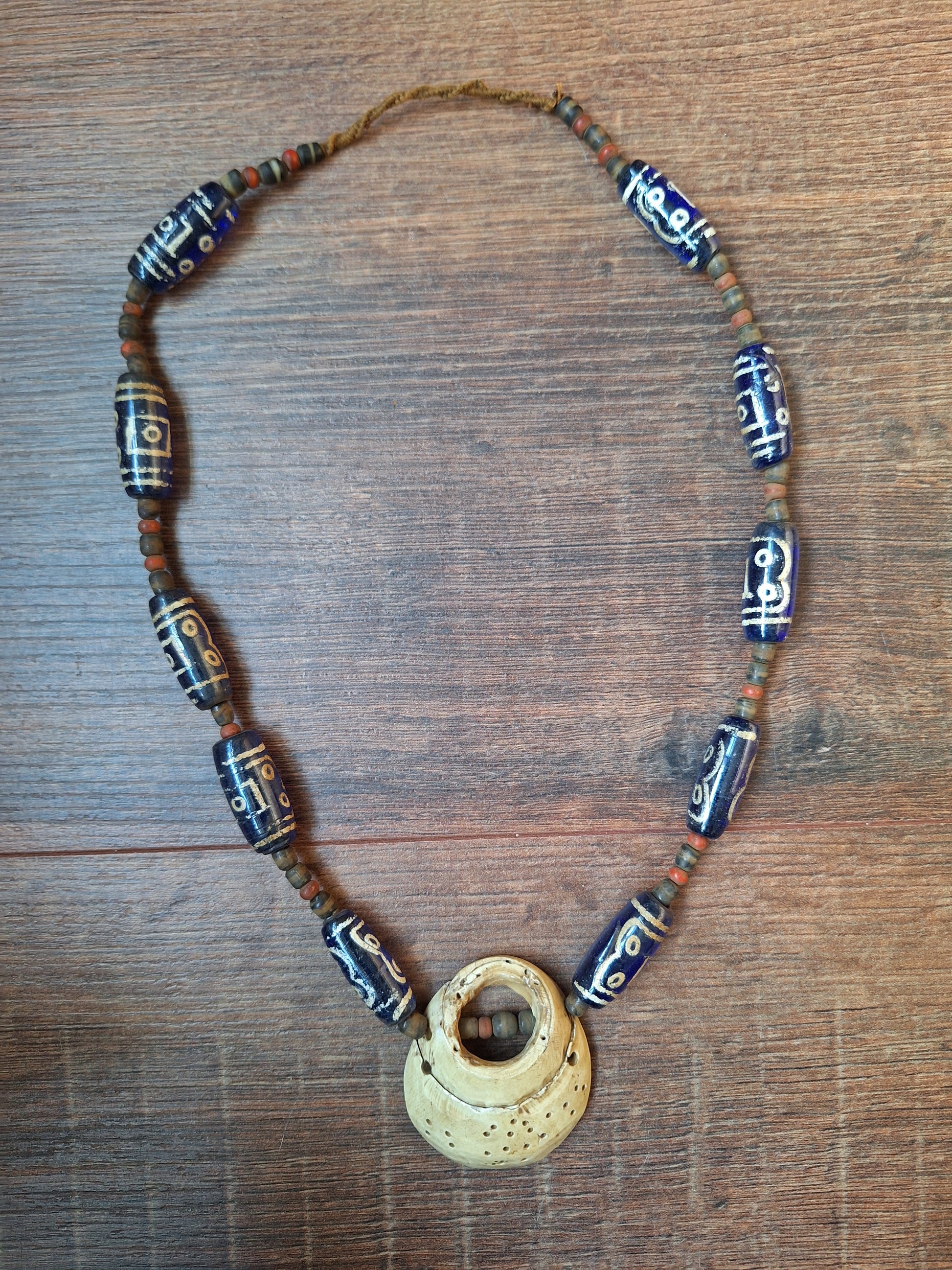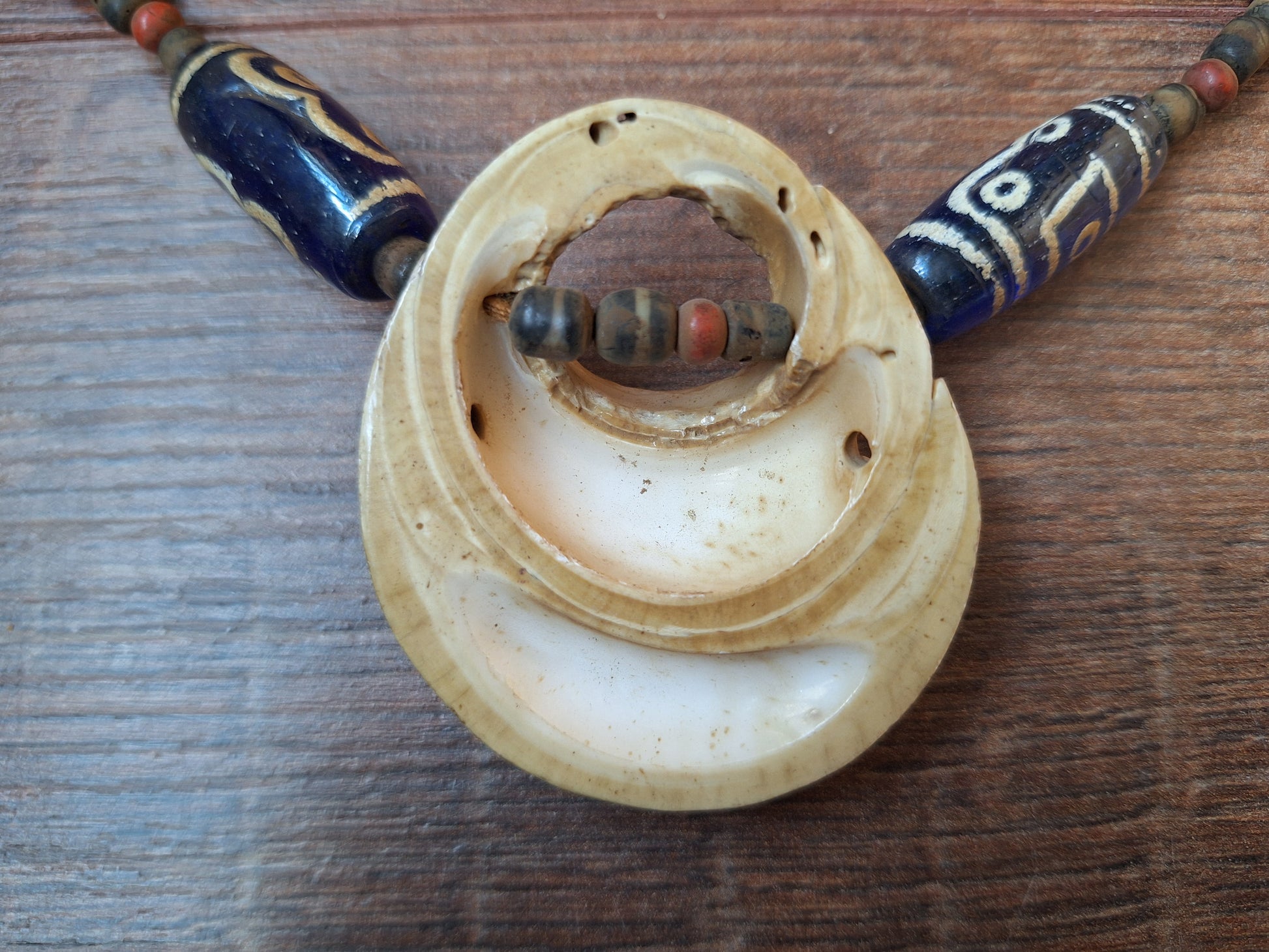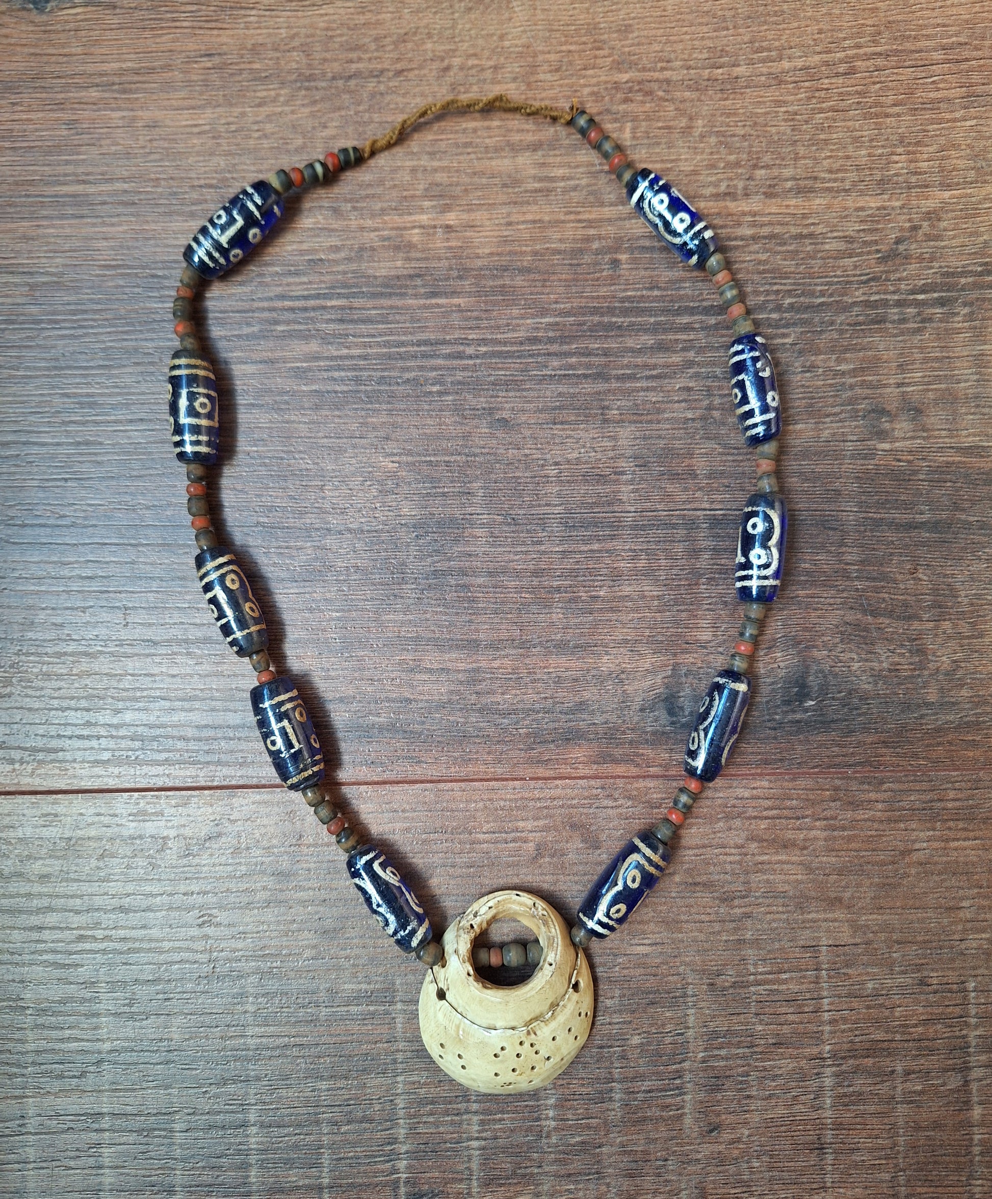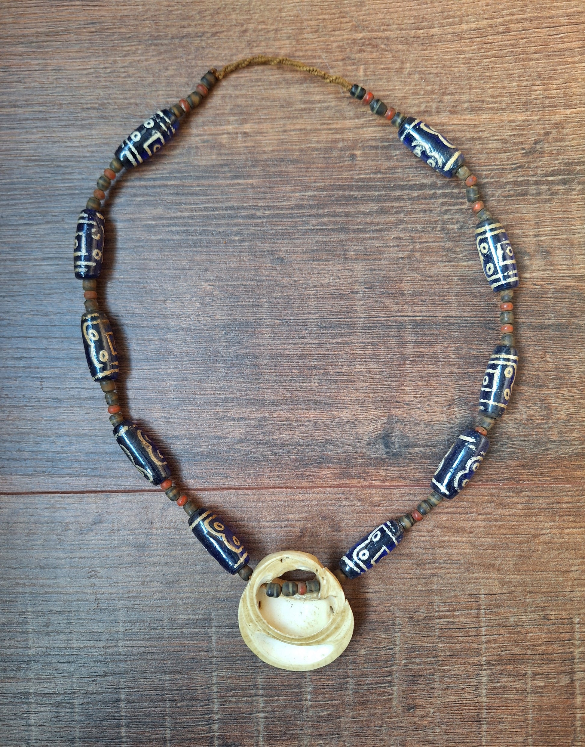 The blue glass beads have been strung on brown cotton cord, together with smaller-sized red and black & white glass beads. The centerpiece of the necklace is a beautiful piece of fossilized conch shell.
