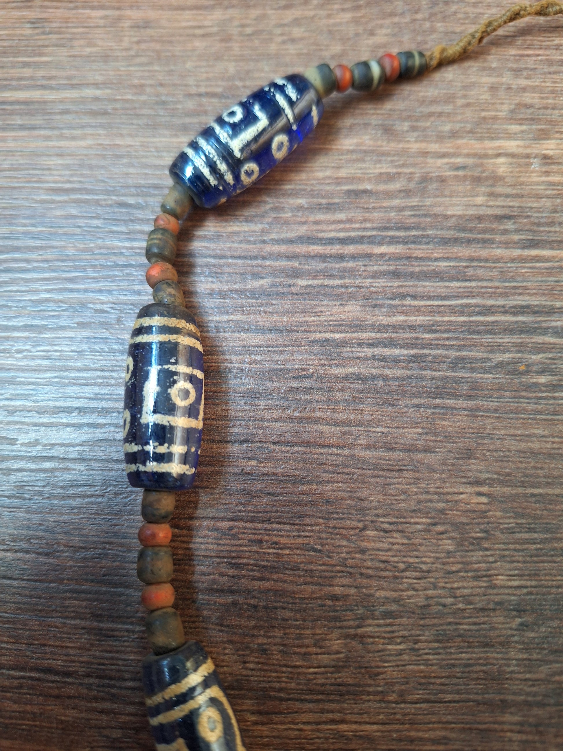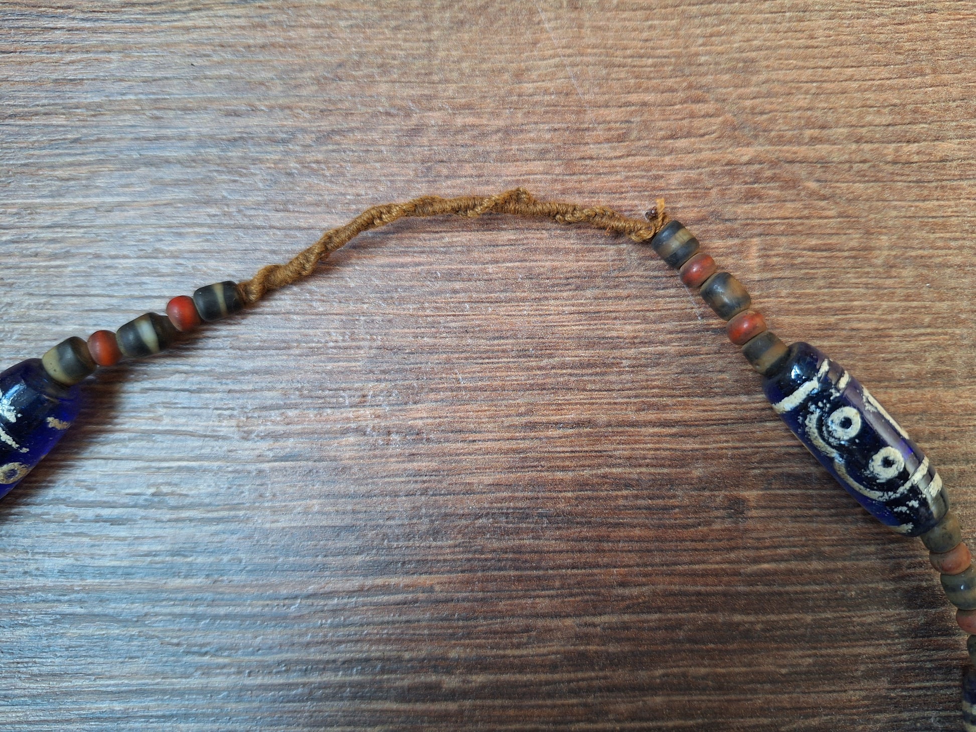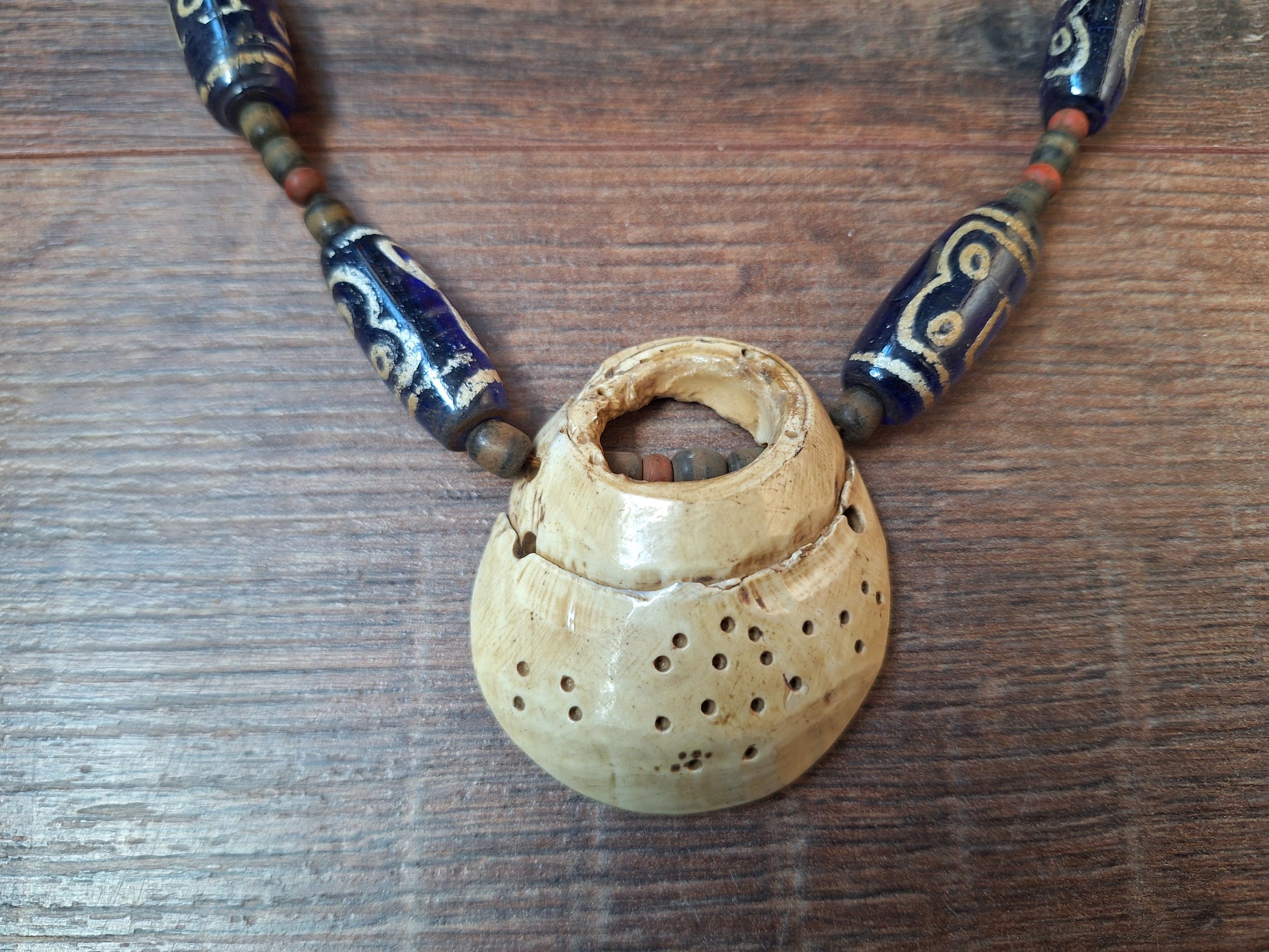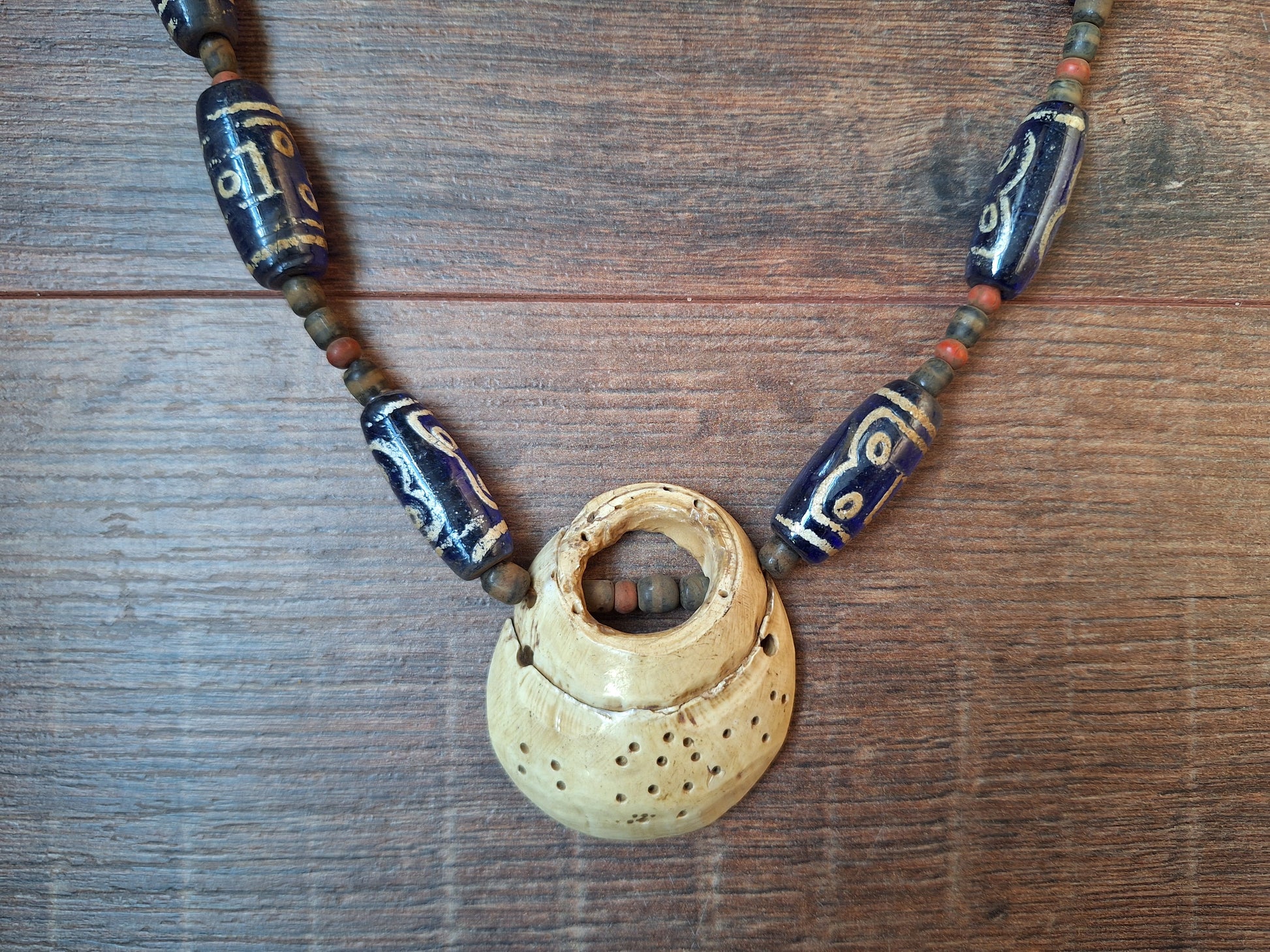 The blue glass beads have been strung on brown cotton cord, together with smaller-sized red and black & white glass beads. The centerpiece of the necklace is a beautiful piece of fossilized conch shell.
