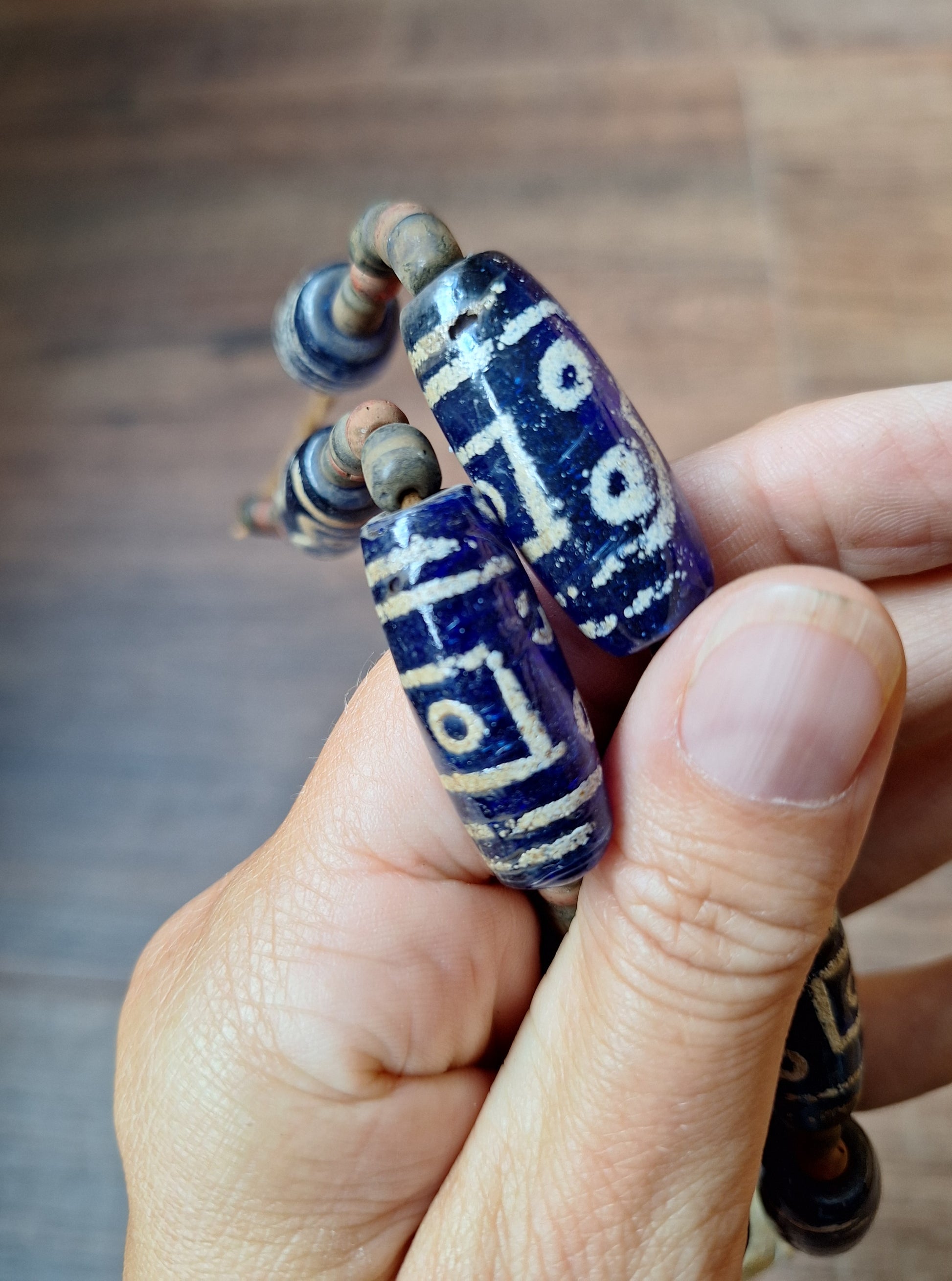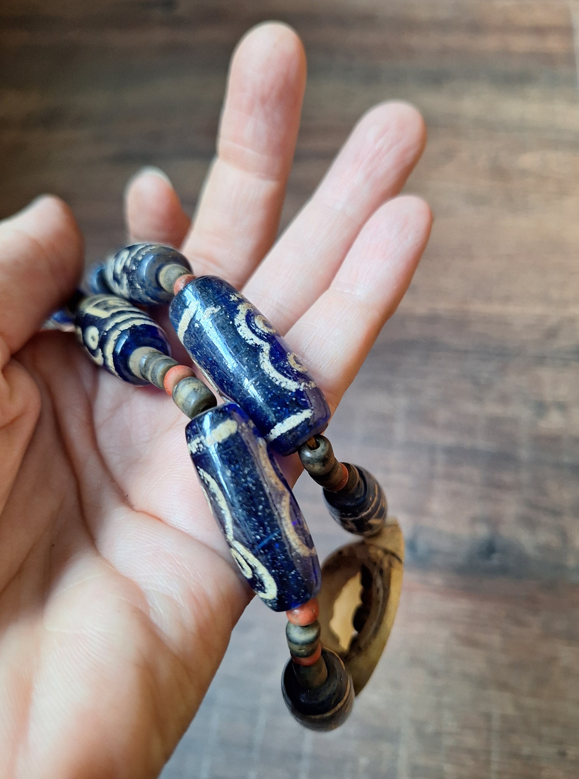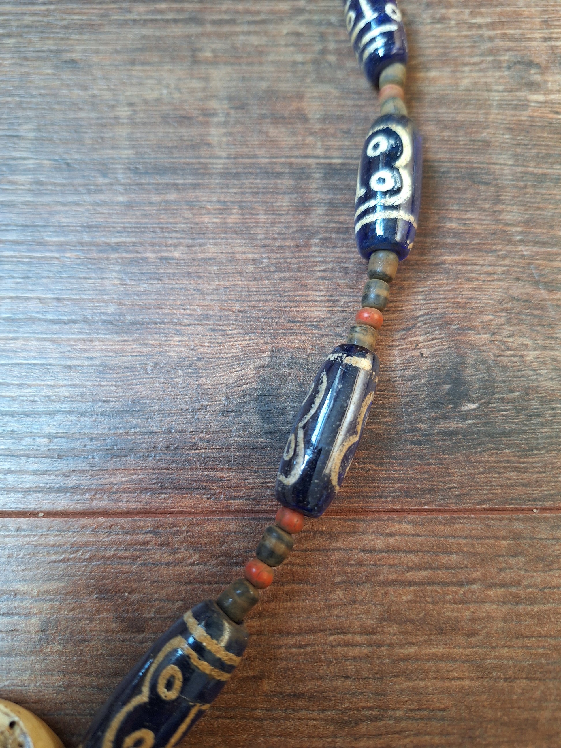 This Naga tribal necklace has been made with transparent blue glass beads handpainted to resemble the well-known Tibetan dzi beads, in the style of 5-eye dzi beads (associated with wealth, prosperity and good fortune. Read all about the symbolism of dzi beads in general and the 5 eye pattern in specific in our Dzi Bead collection elsewhere in our webshop).