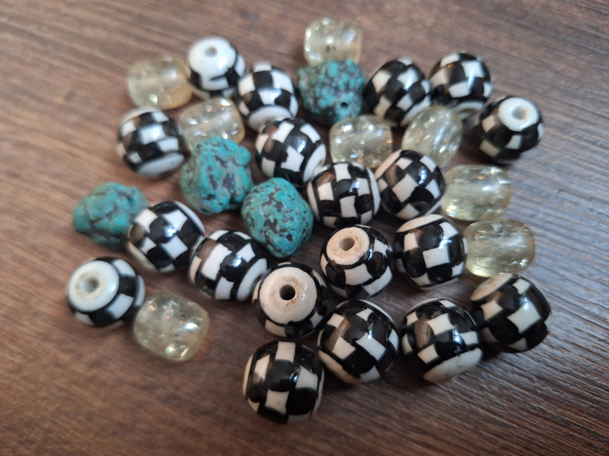 - 19 glazed porcelain beads, handpainted with geometric black & white patterns; 15 millimeters diameter with a 3 millimeters hole.