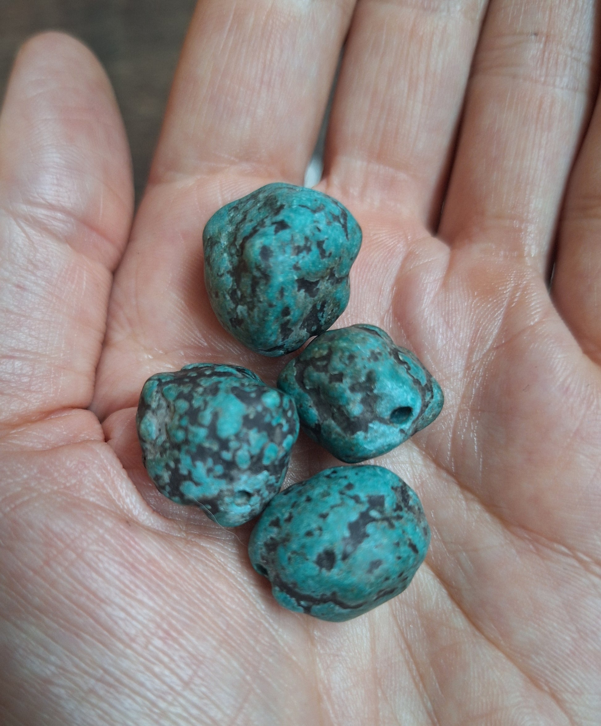 - 4 turquoise colored howlite beads with a diameter of roughly 17-18 millimeters and a 2 millimeters hole.