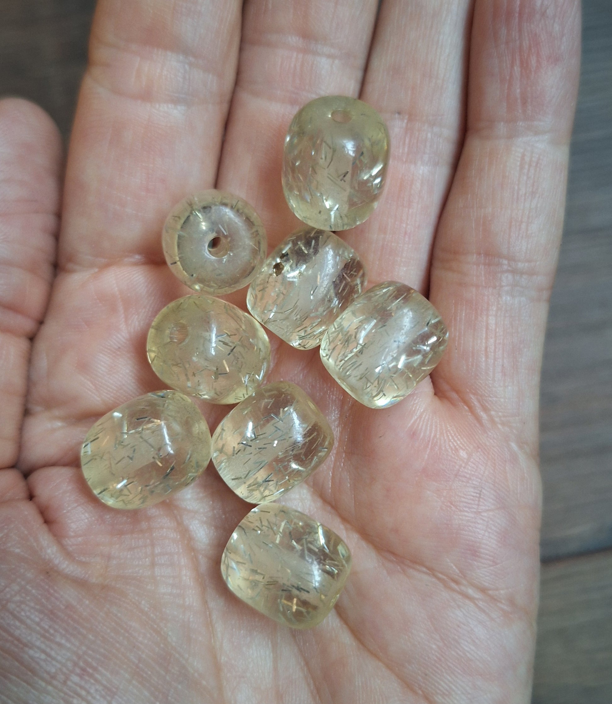 - 8 tubular shaped transparent synthetic beads with silver colored confetti; 13 millimeters long, 11 millimeters diameter and with a 3 millimeters hole.