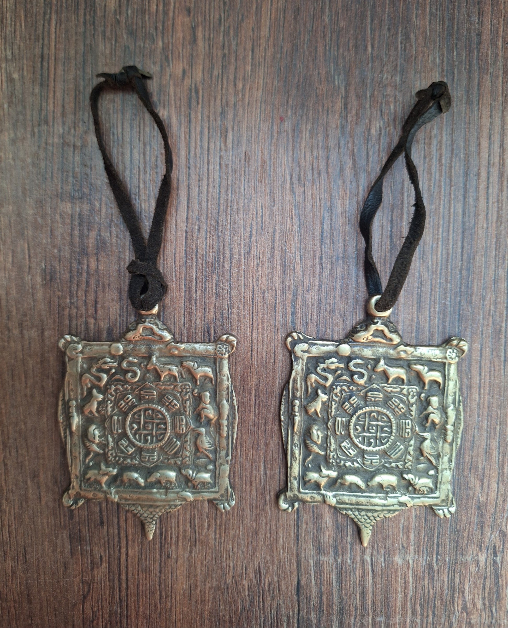 Vintage brass mirrors from Nepal. In Nepal, mirrors such as these are called 'melong'. They are traditionally often worn on the belt, instead of around the neck.
