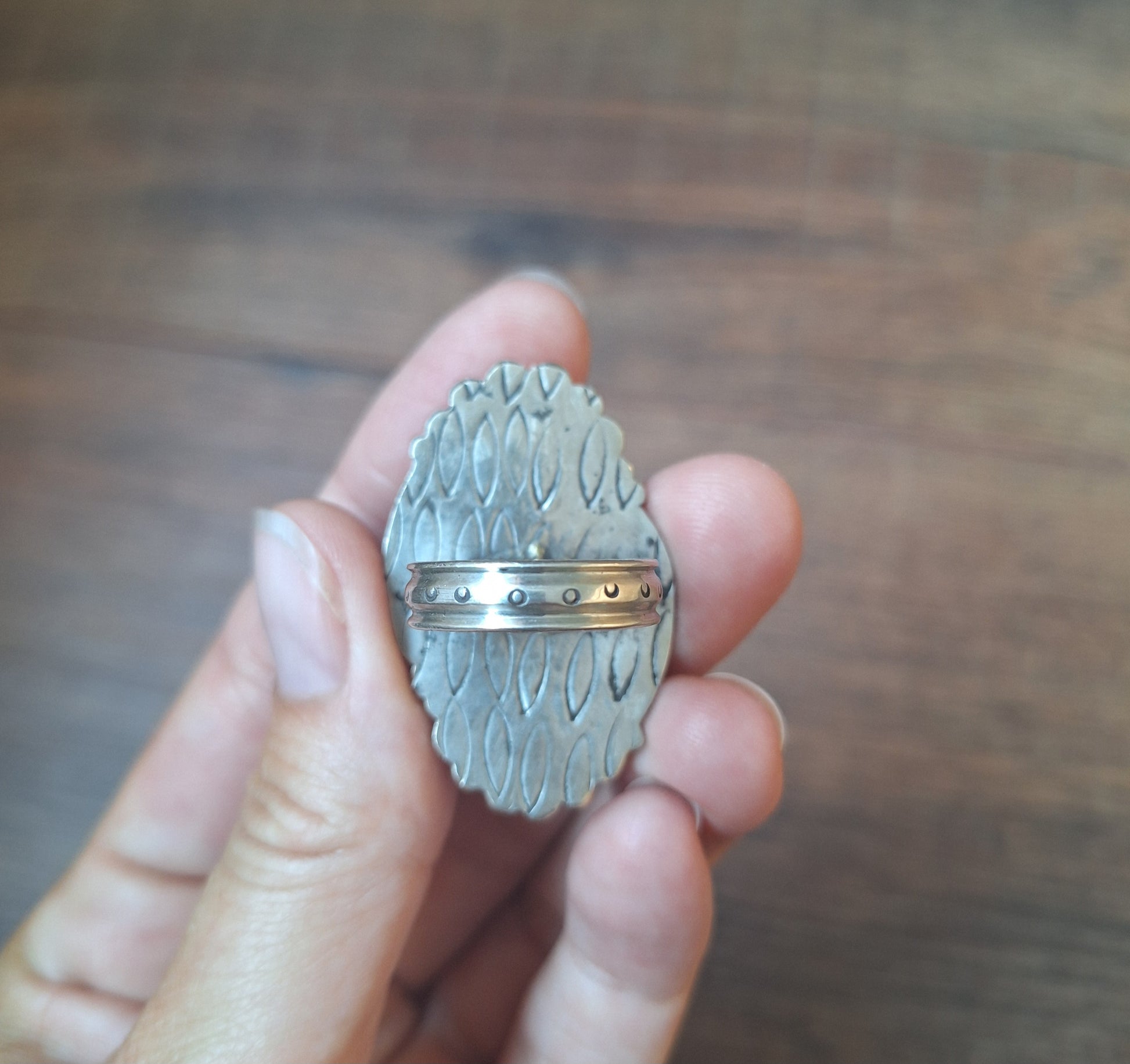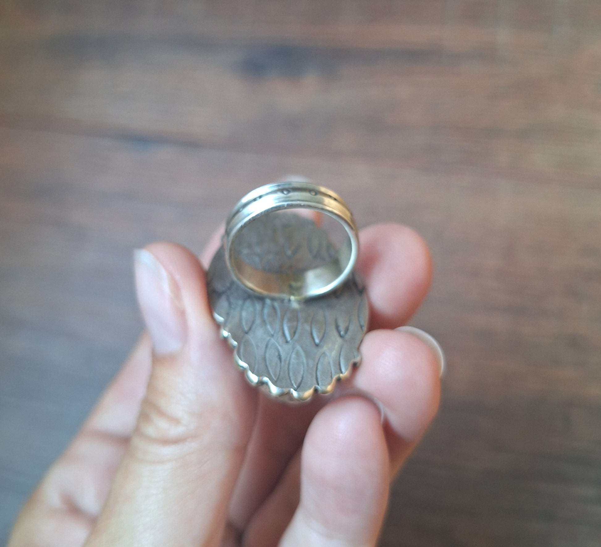 Very nice Tibetan silver ring with turquoise inlay. Beautiful vintage statement piece from Nepal, in great condition.