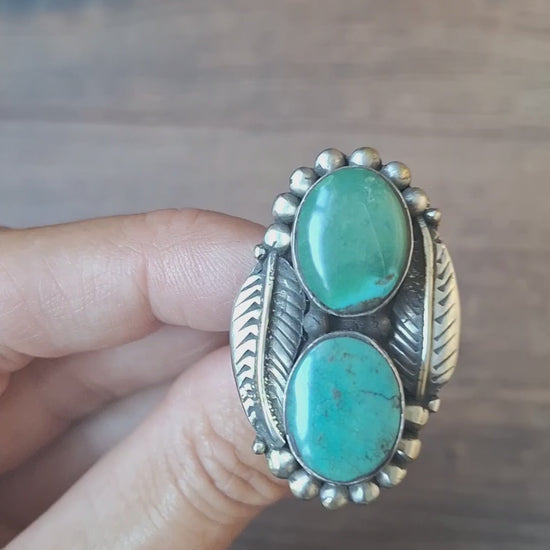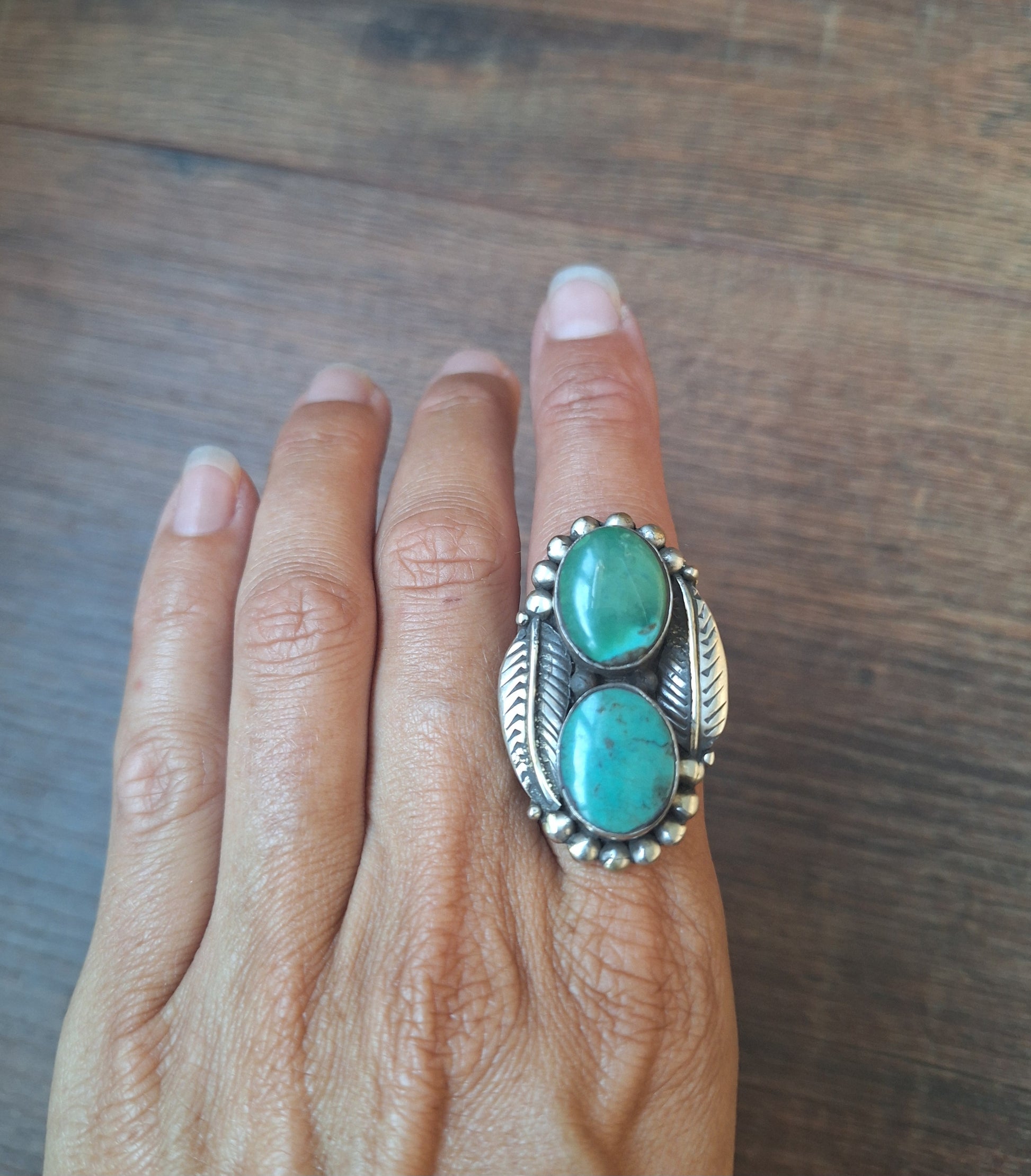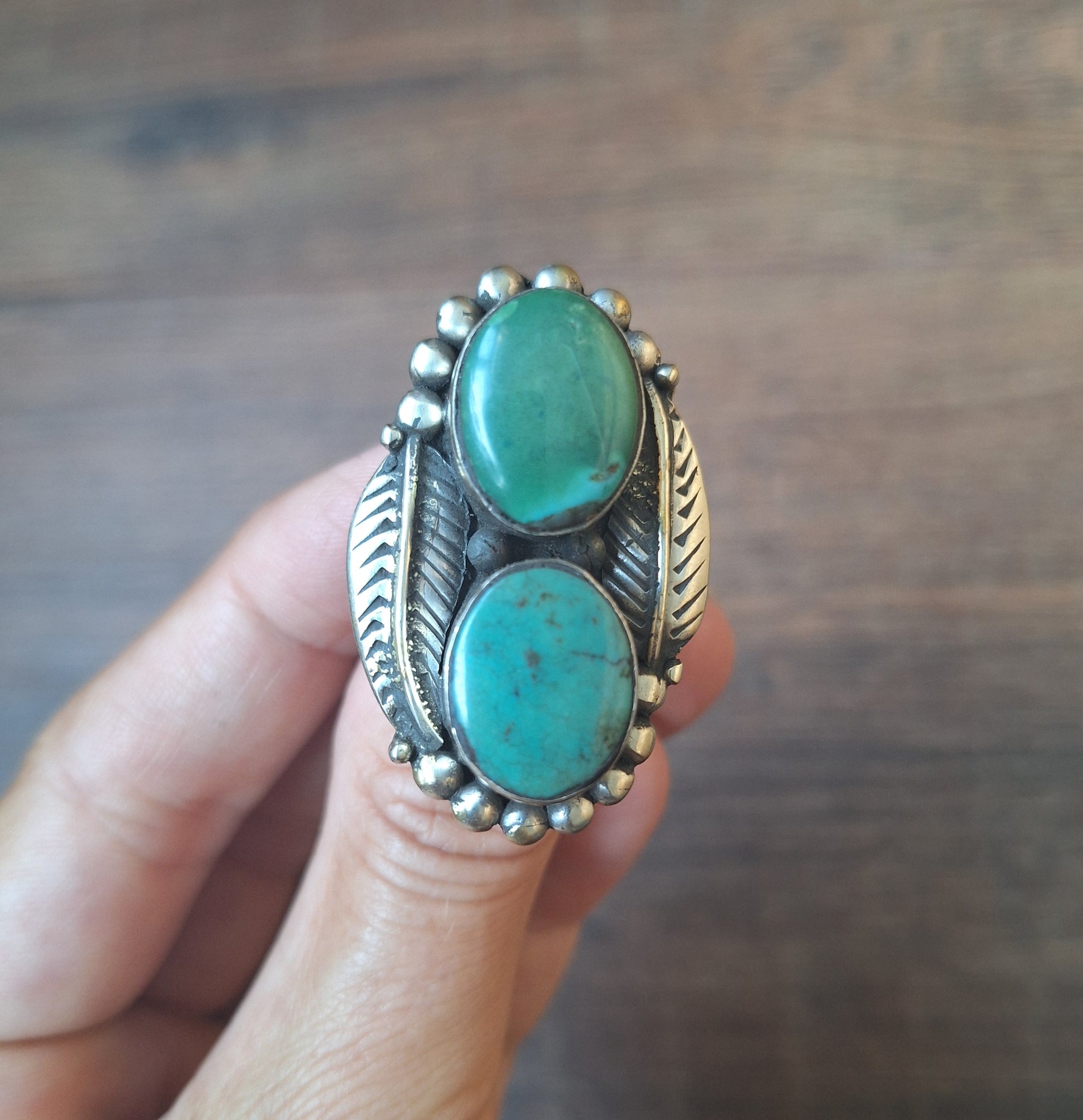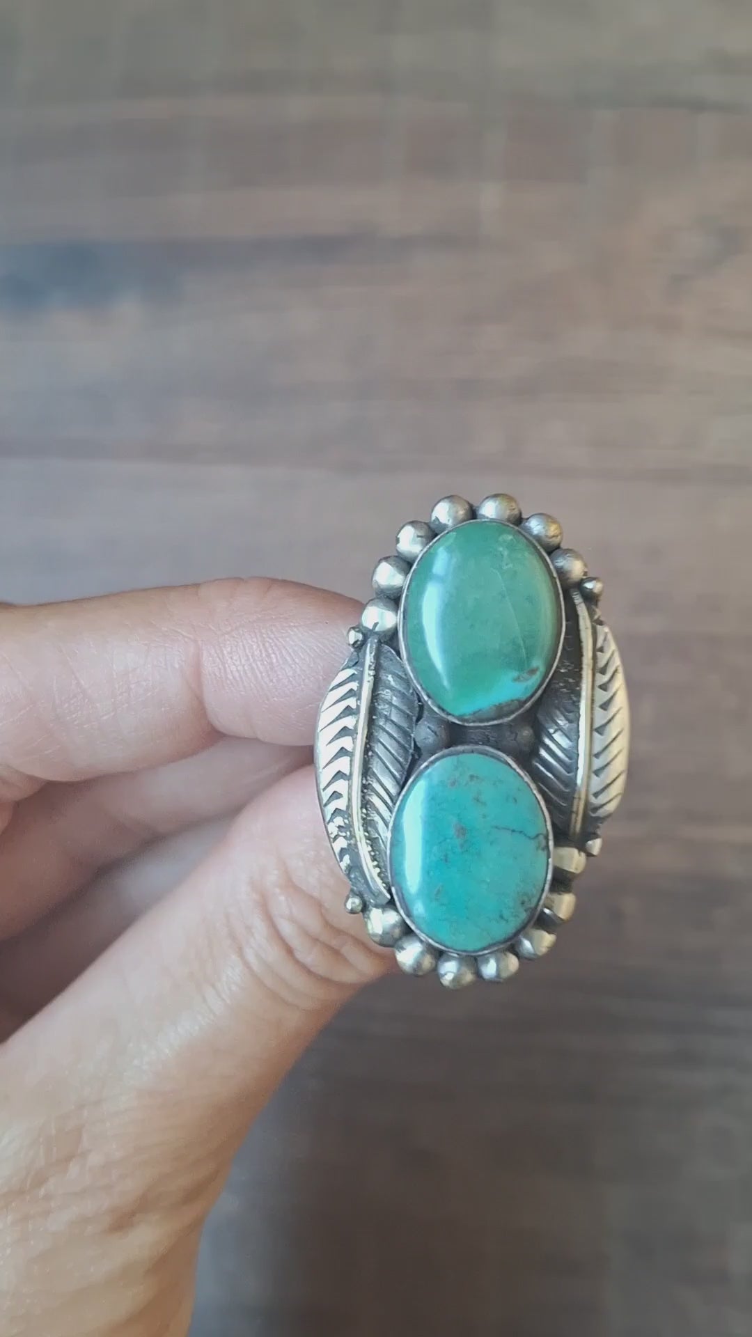 Sizes; approximately 4 centimeters long and 2,6 centimeters wide. The two (real) turquoise stones are each approximately 1,5 x 1 centimeters. The ring has a wearable size of 18 millimeters diameter.