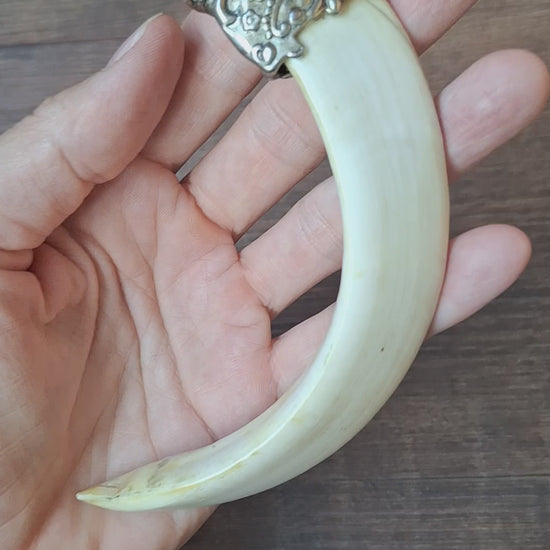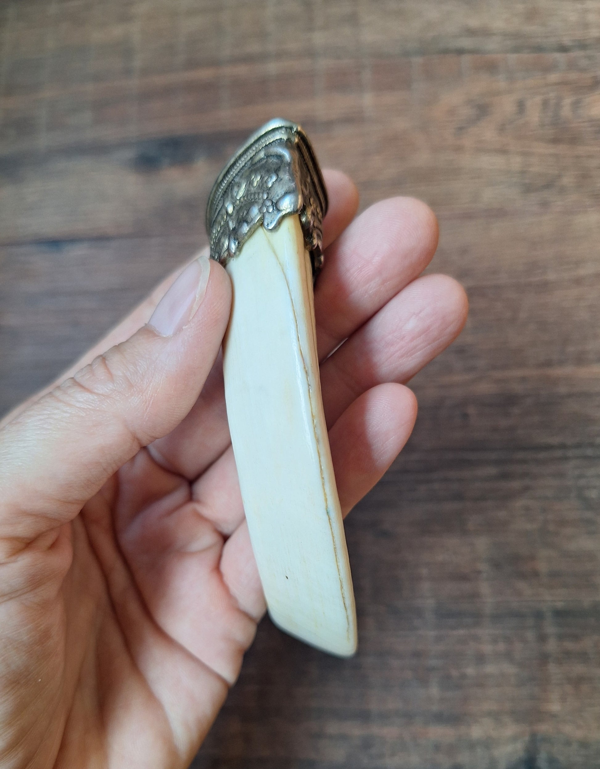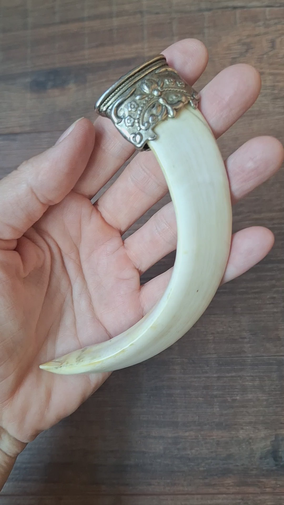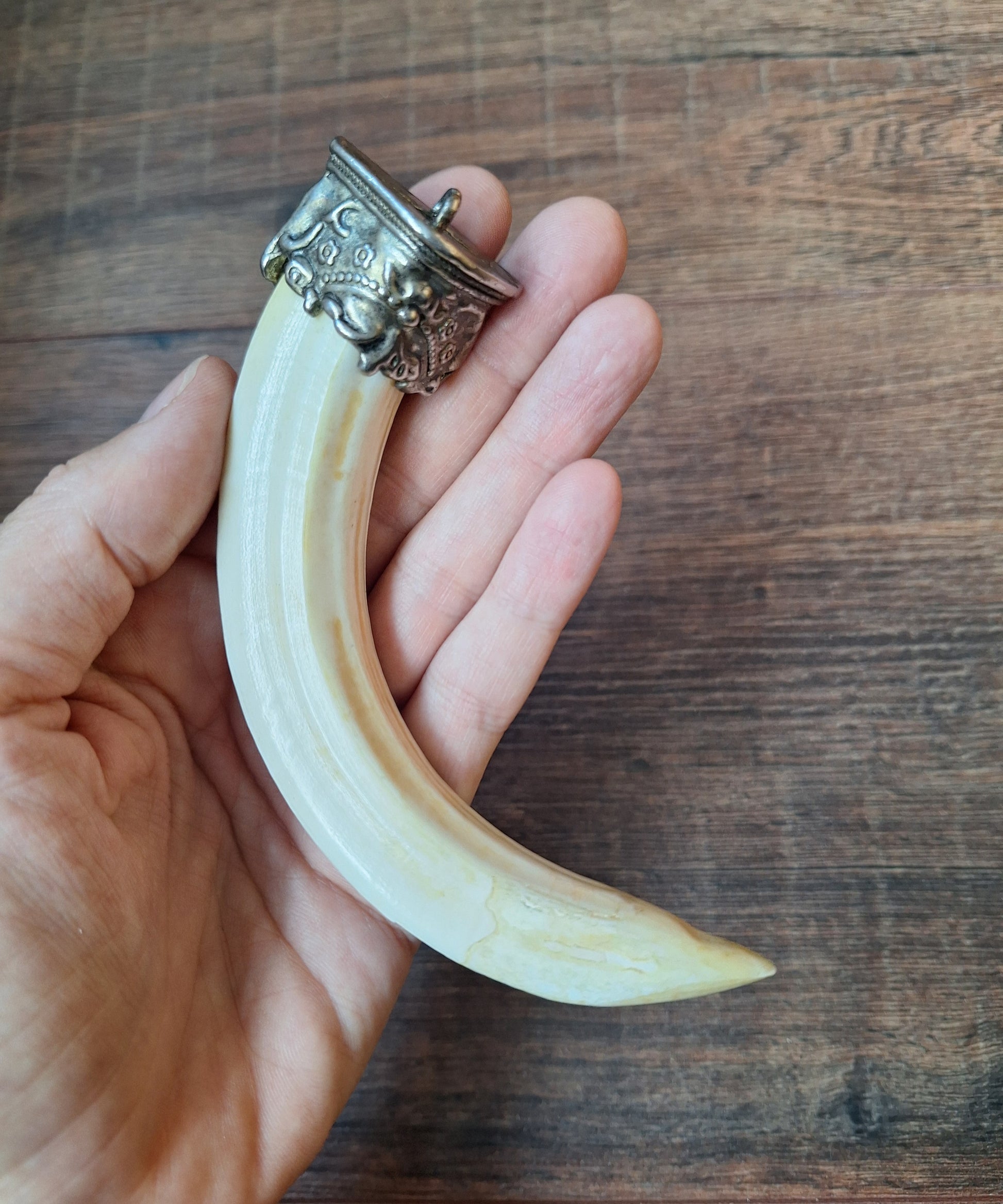 Very nice vintage Nepalese pendant made with a large wild boar tusk set into a Tibetan silver setting.