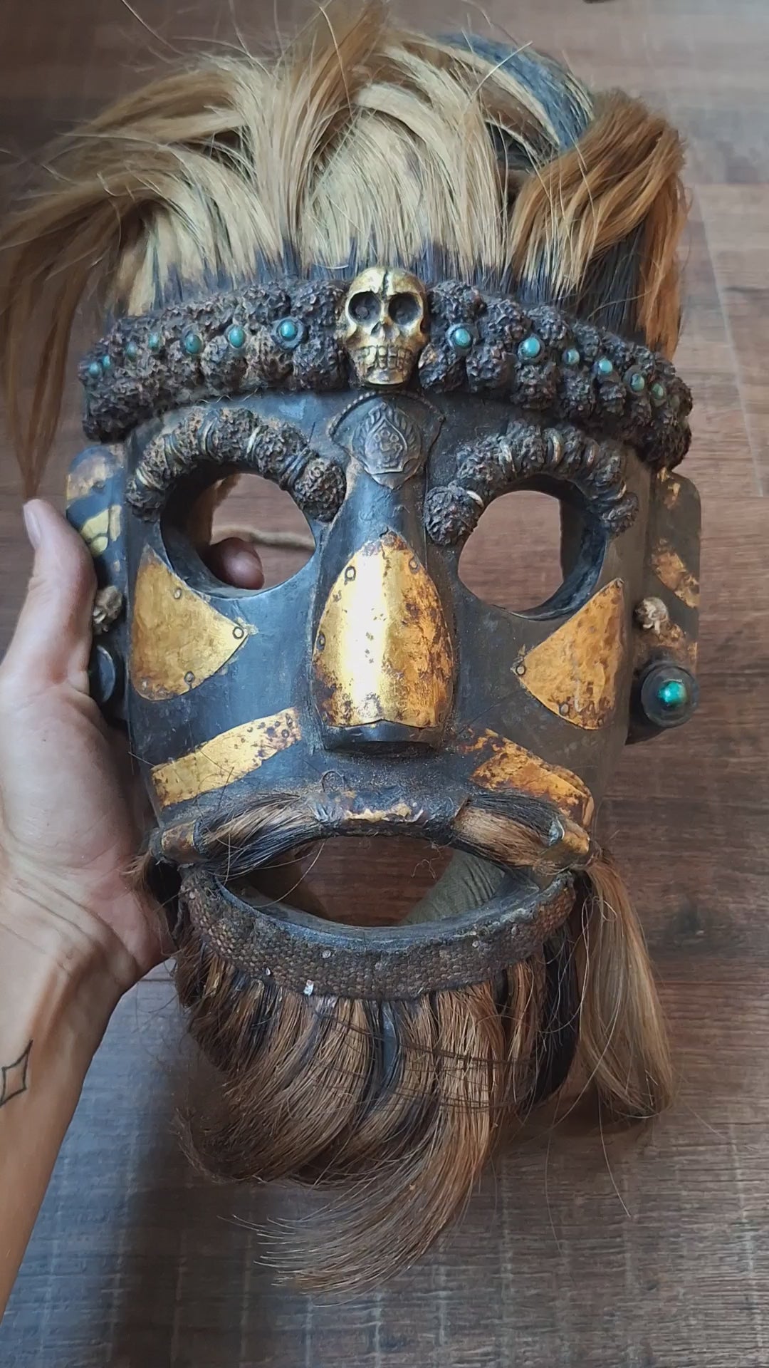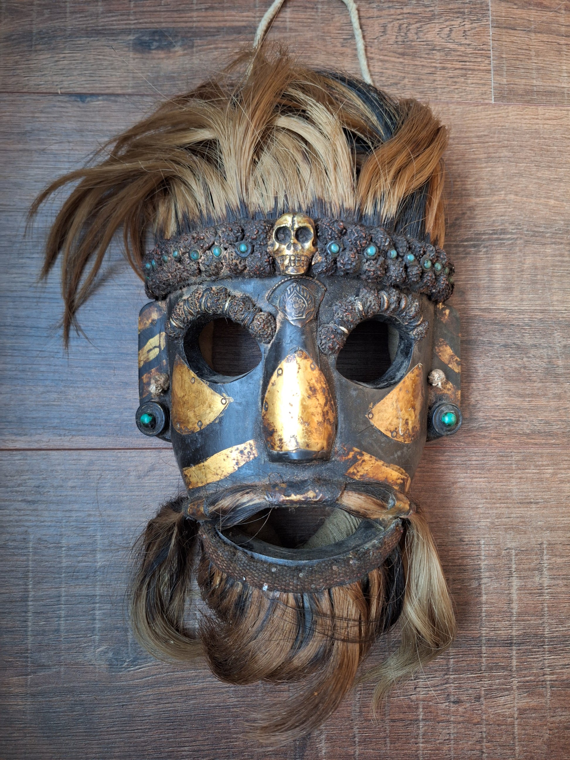 This absolutely excquisite mask comes from Nepal. It has been made from a natural dark hard wood, which has been treated with natural pigments to attain an even darker color. It has been decorated with rudraksha and (faux) gemstone beads, bundles of yak hair, gold painted accents and brass plating.