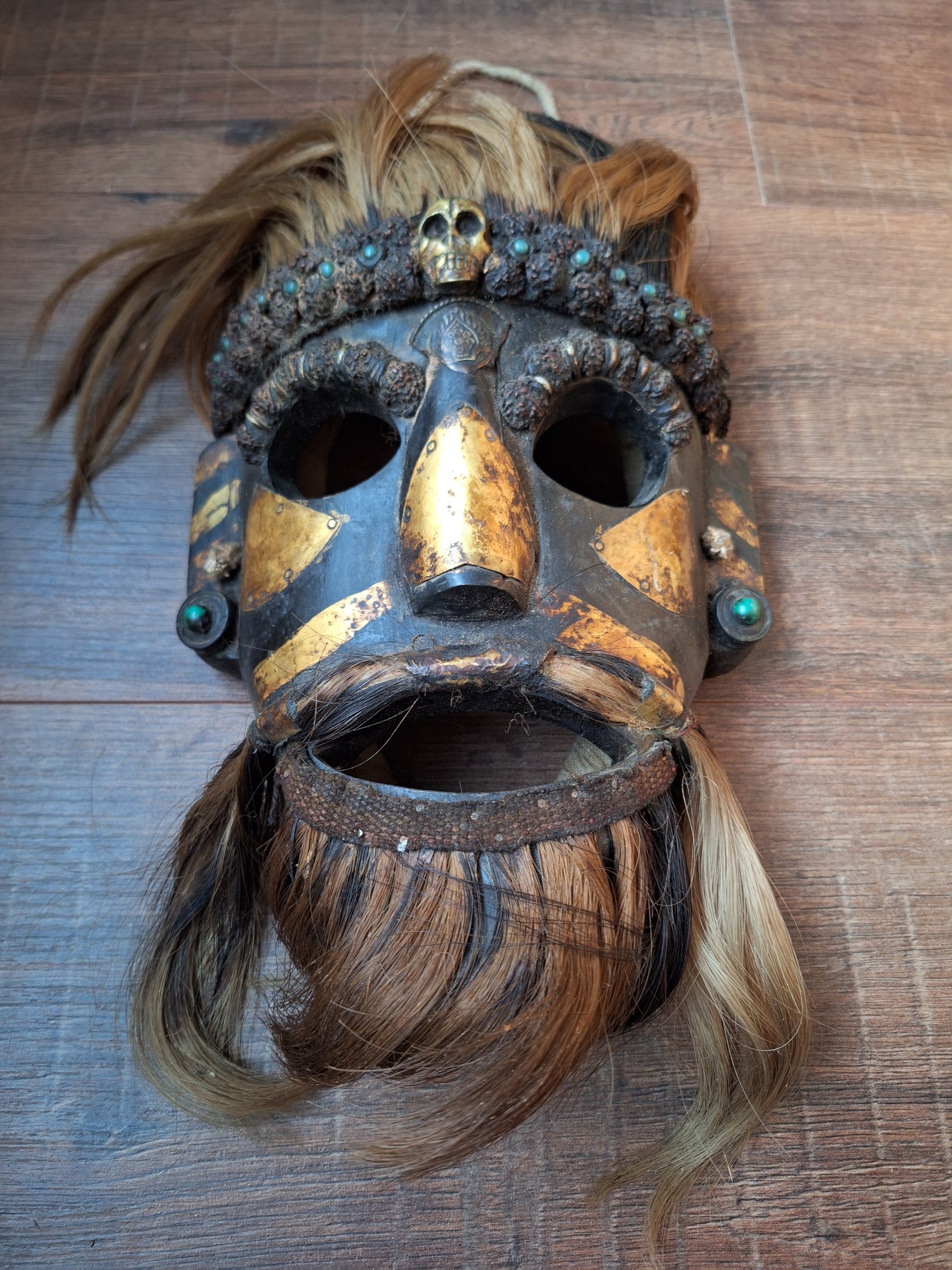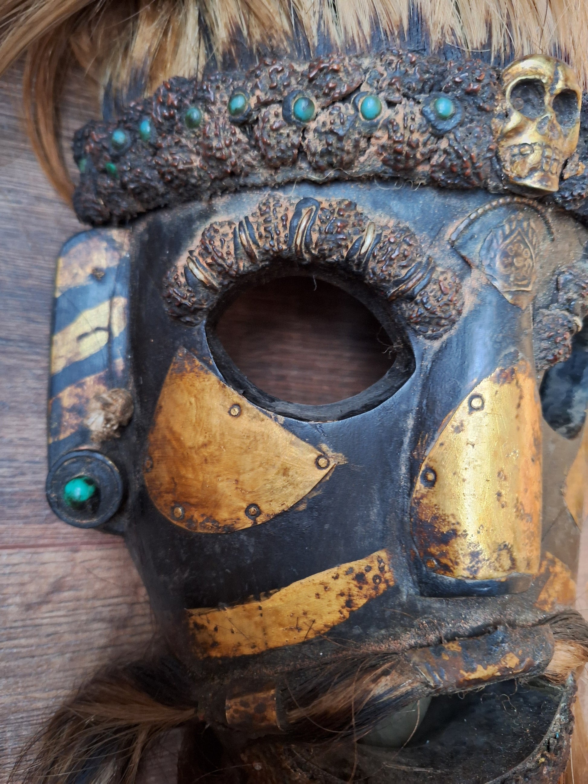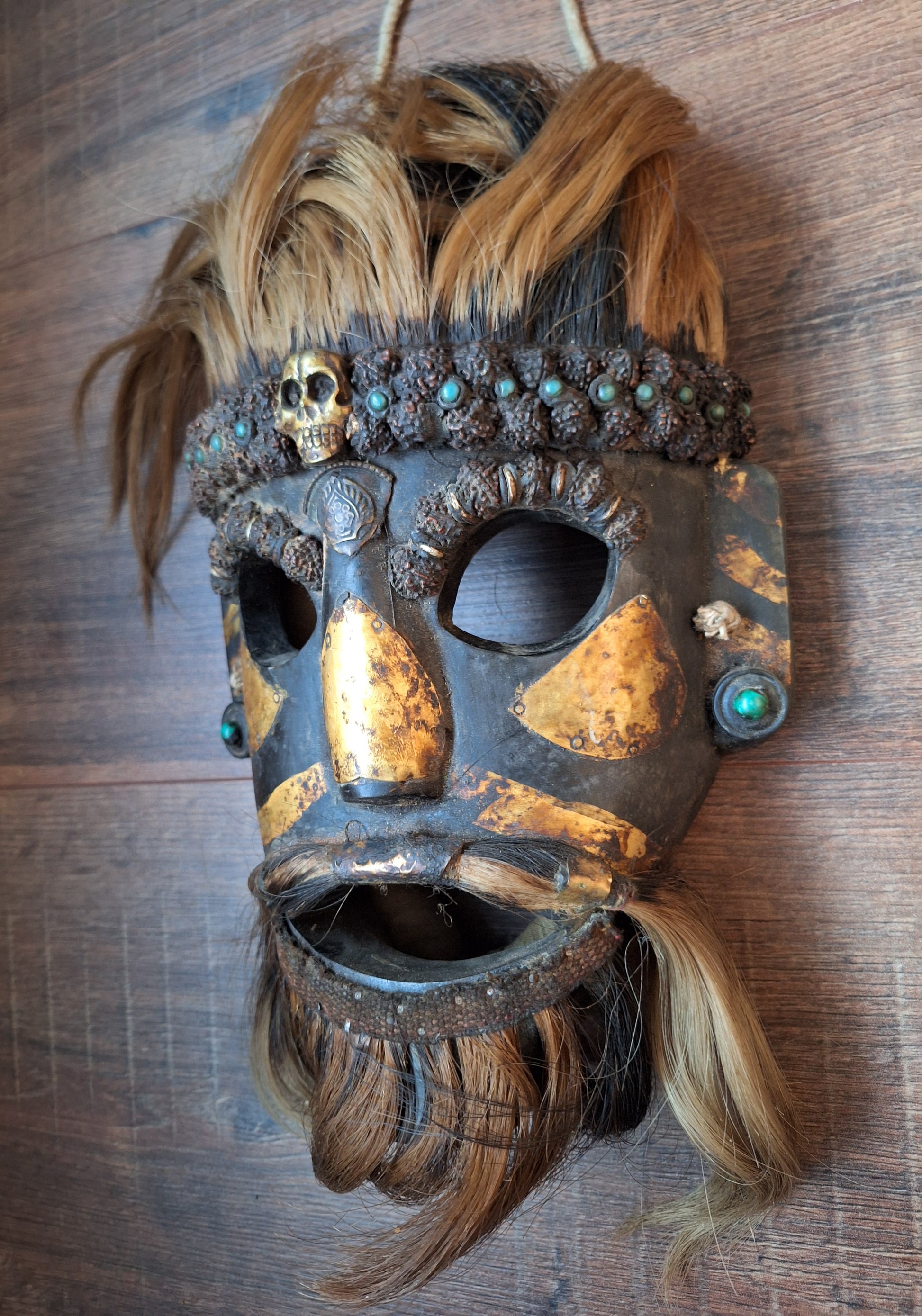 Vintage wooden wrathful spirit mask with metal plating, beads and yak hair