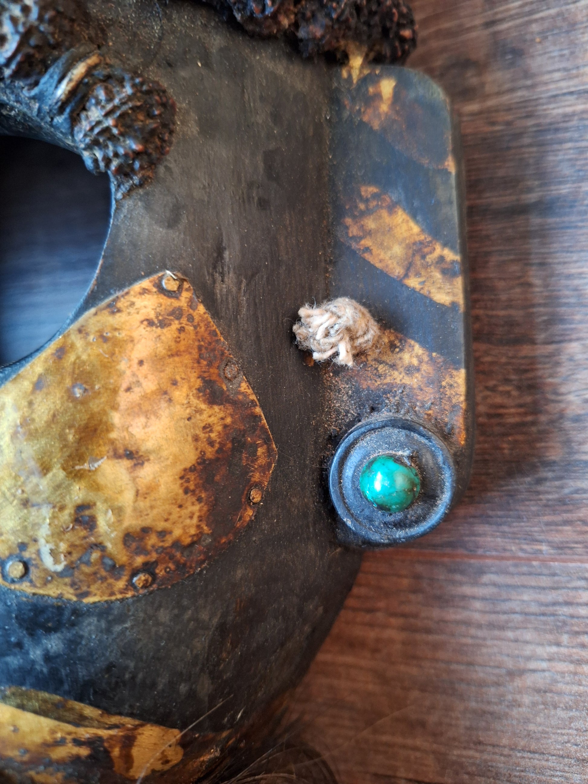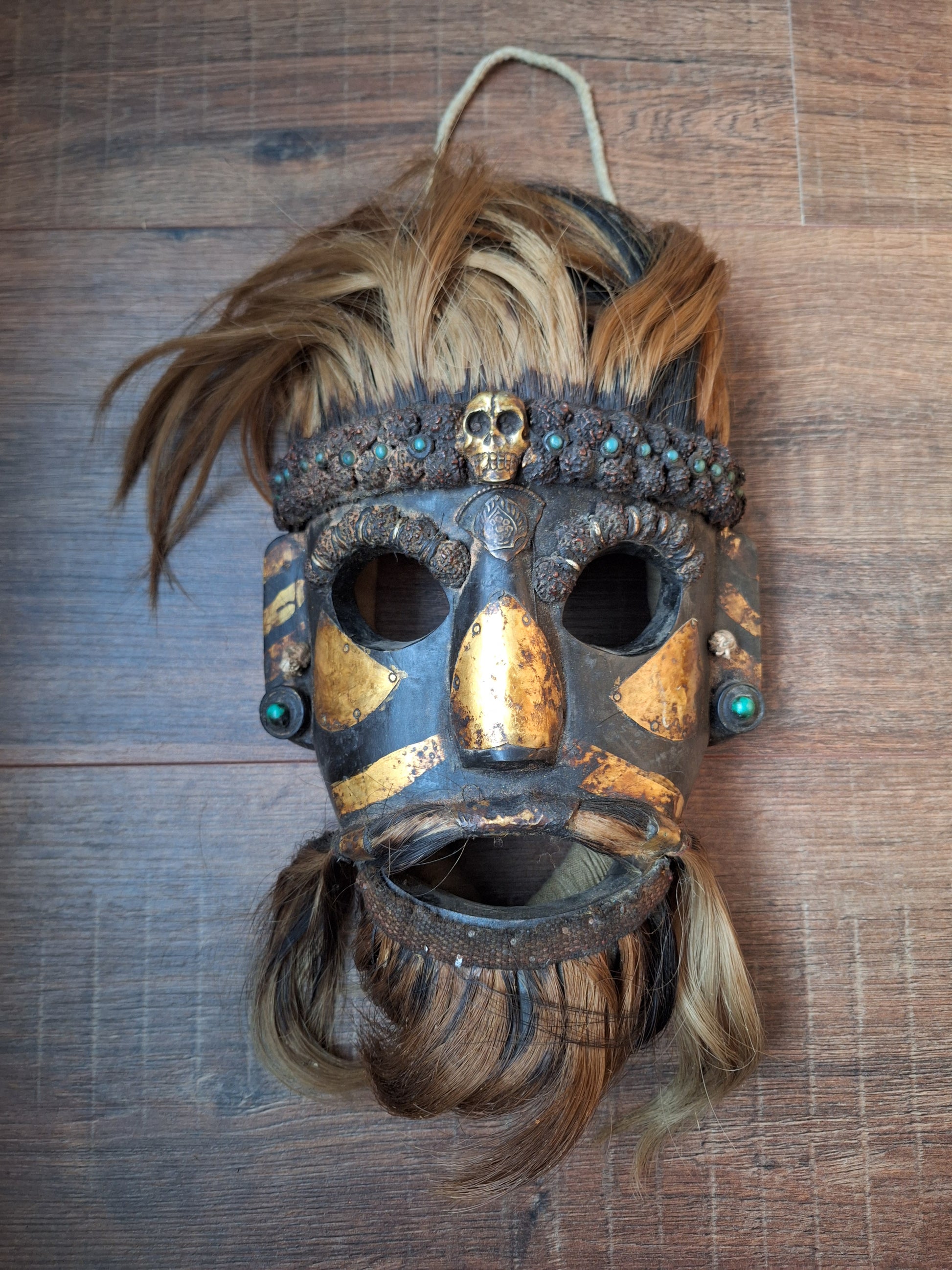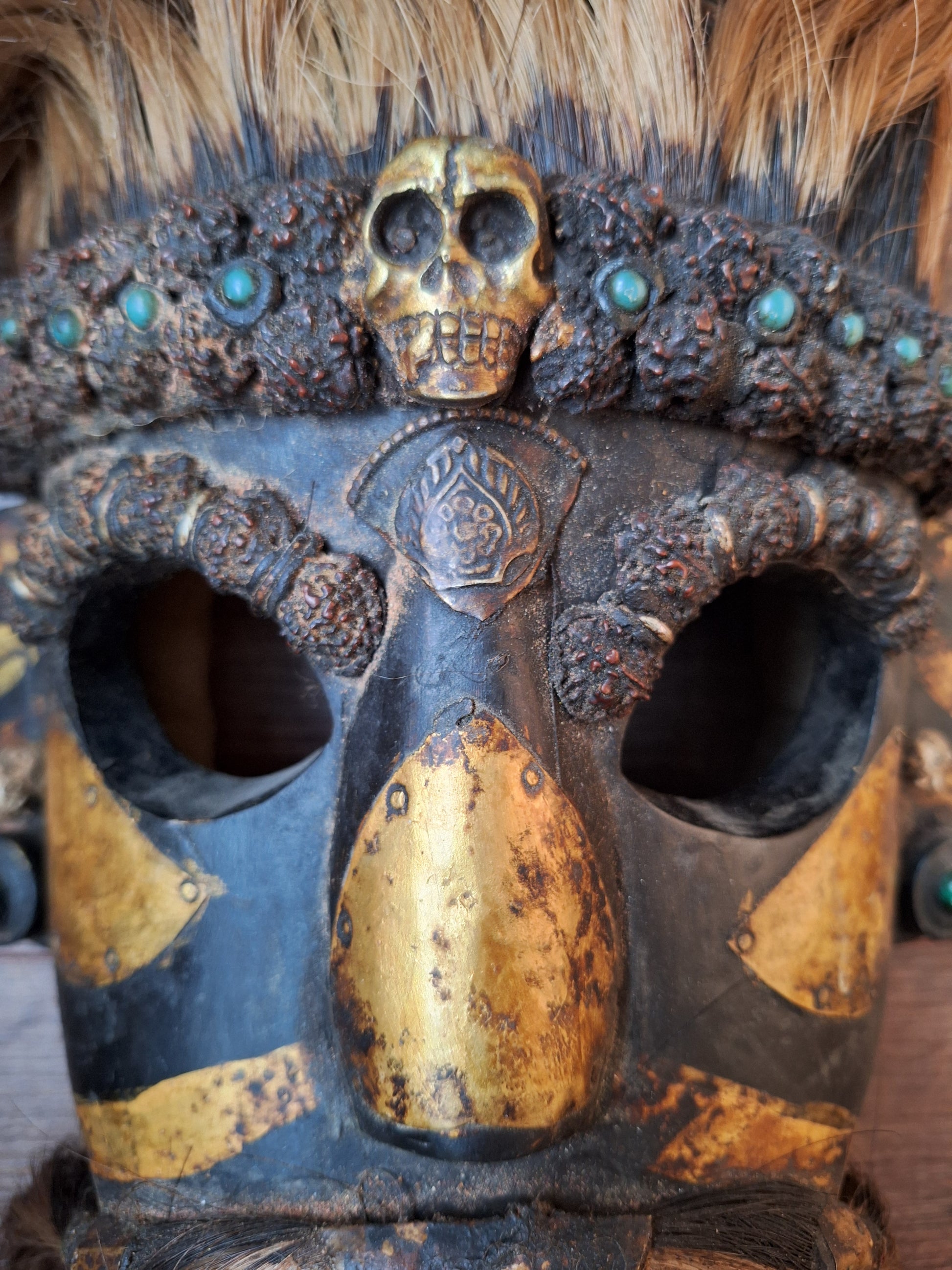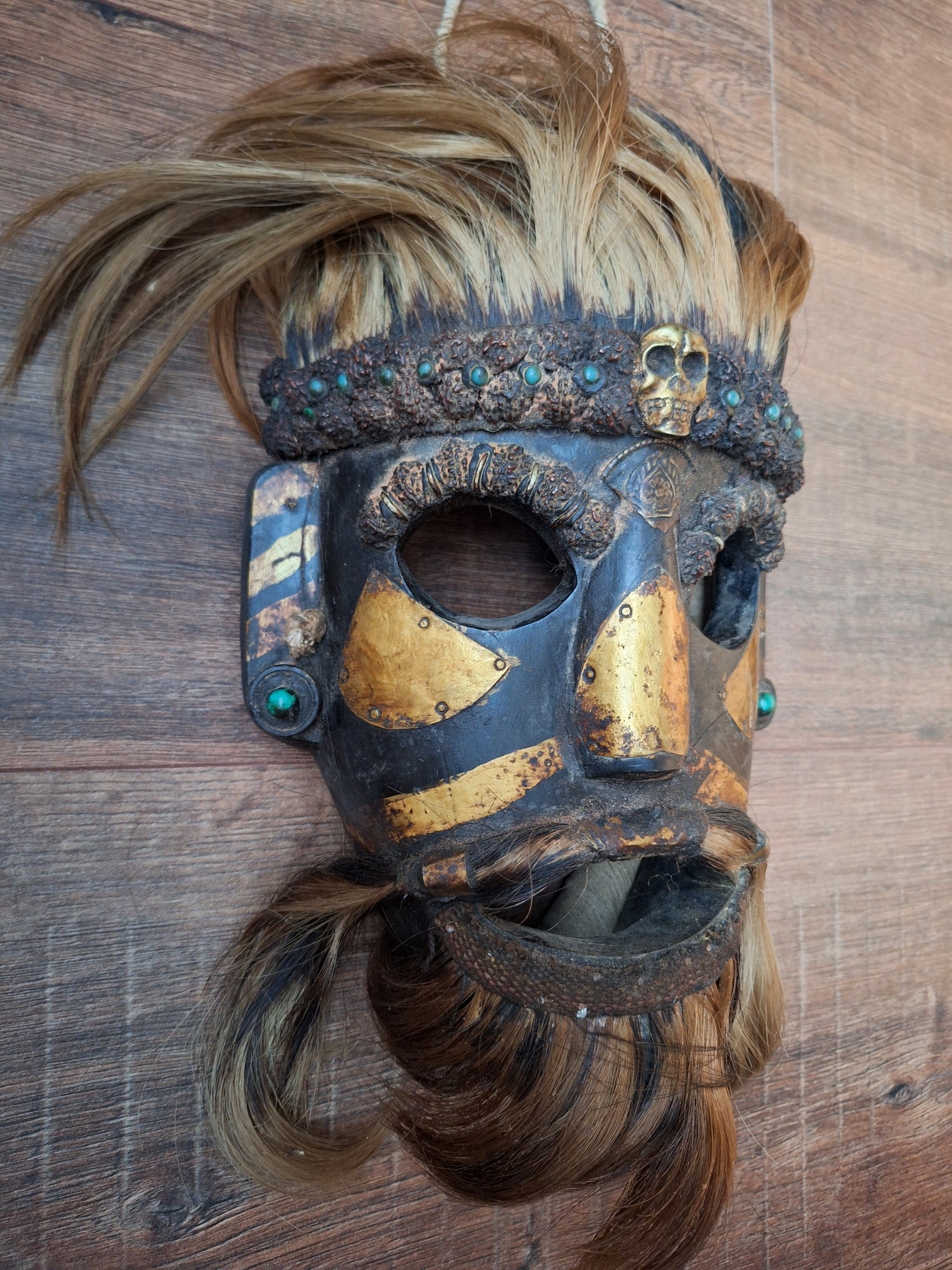 Vintage wooden wrathful spirit mask with metal plating, beads and yak hair