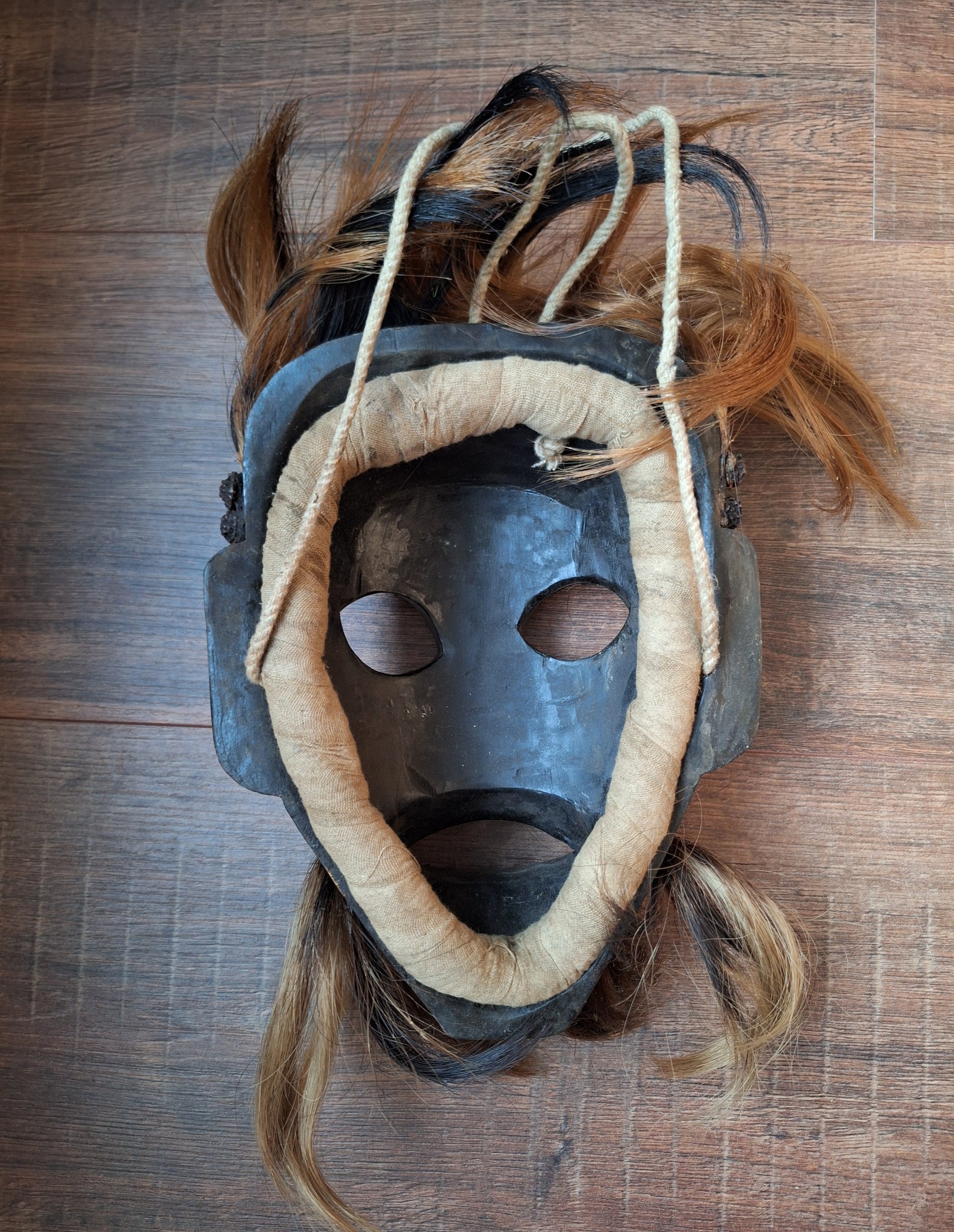 Sizes; approximately 28 centimeters high and 21 centimeters wide (measured only the wood, without the hair). It weighs 855 grams. This mask is from vintage origin and shows some signs of its age and previous usage, but overall it is in good condition.