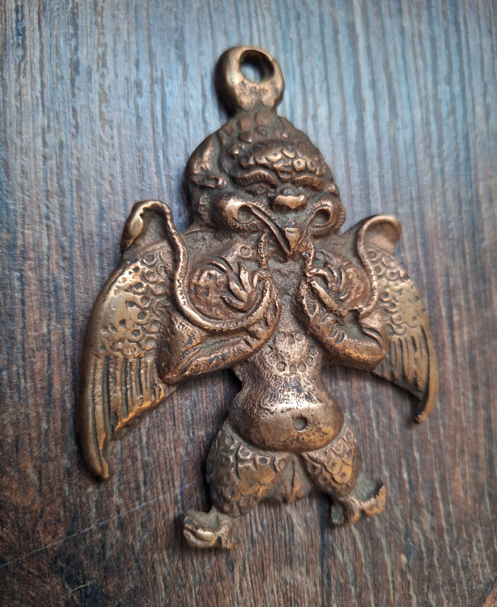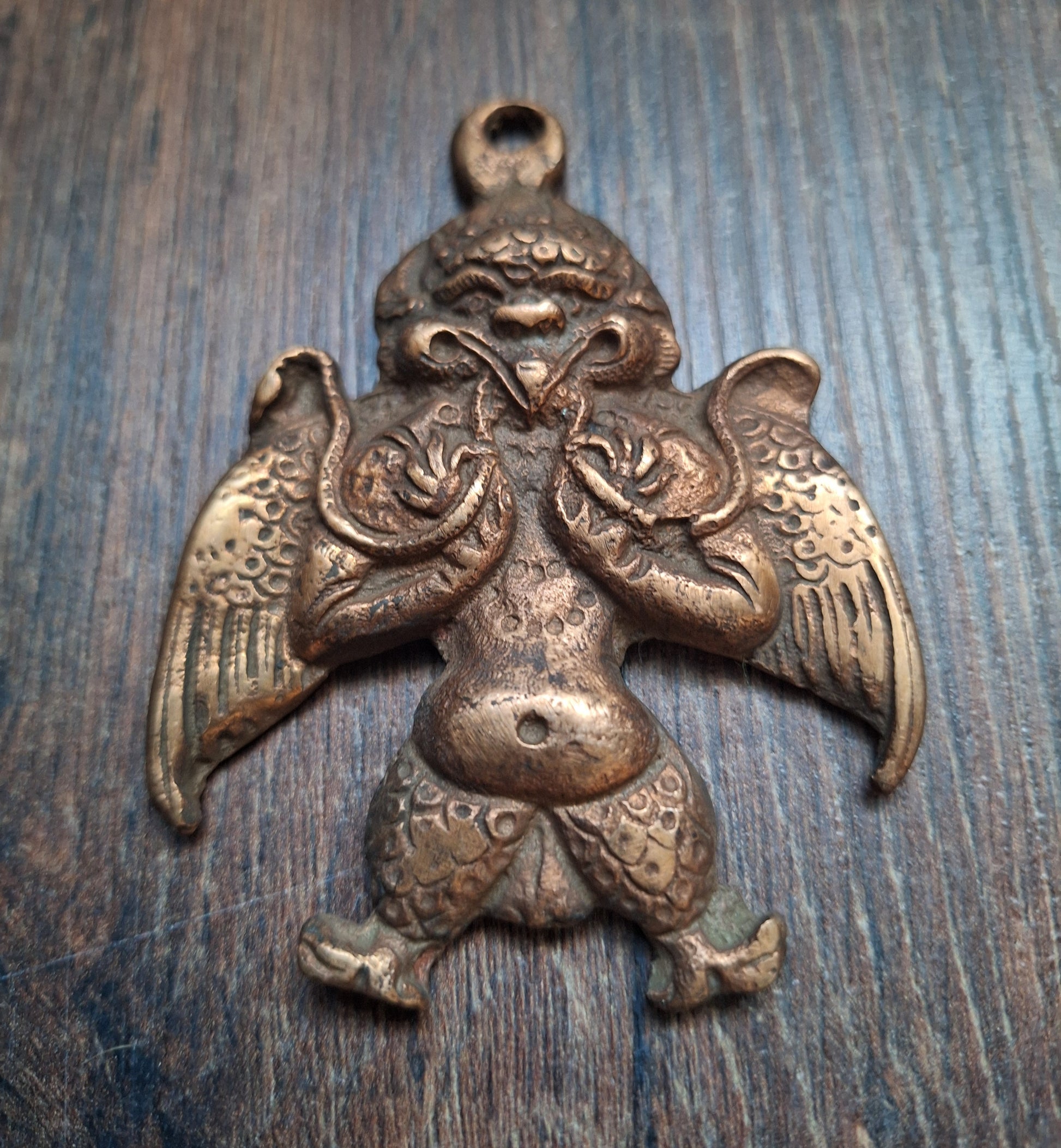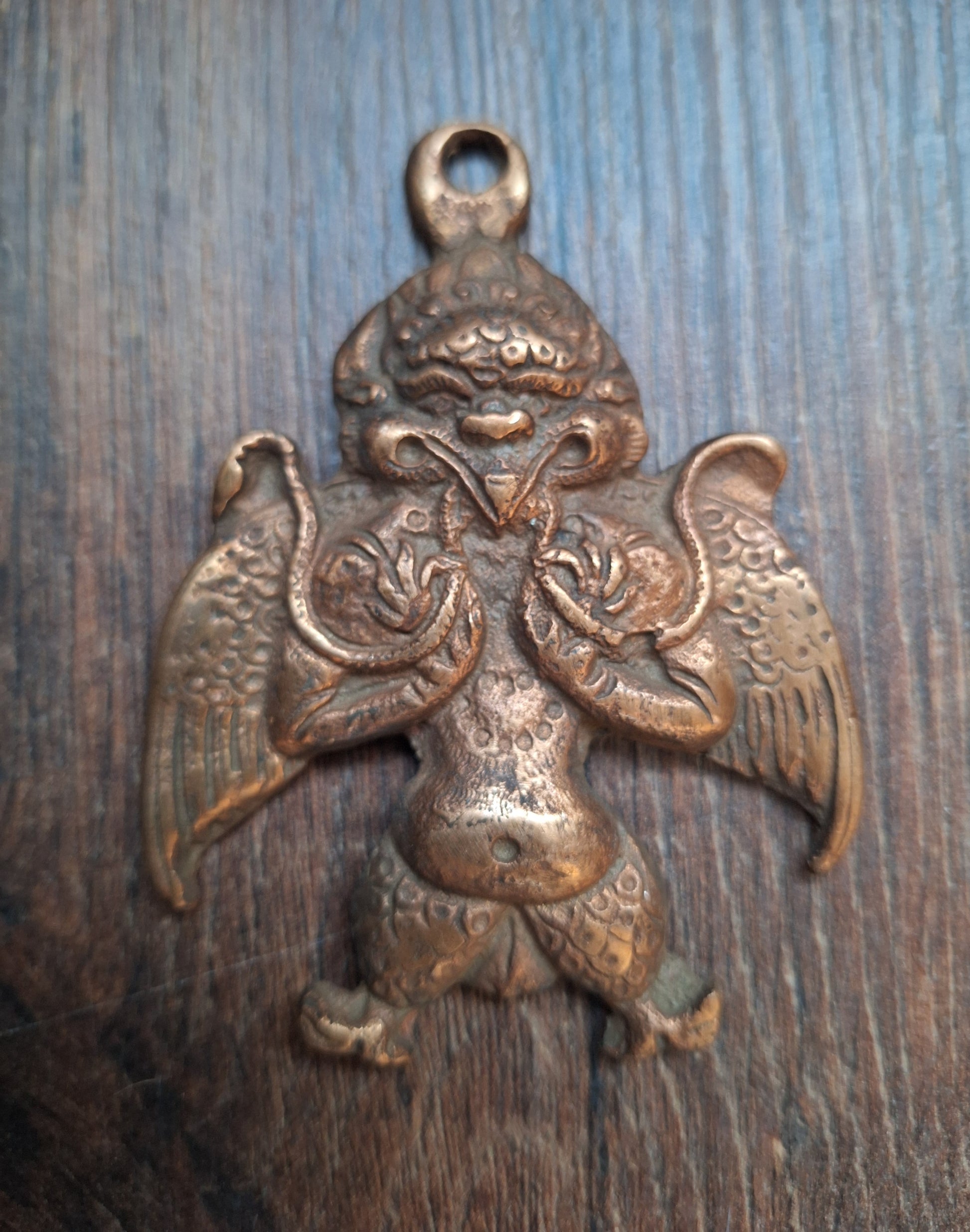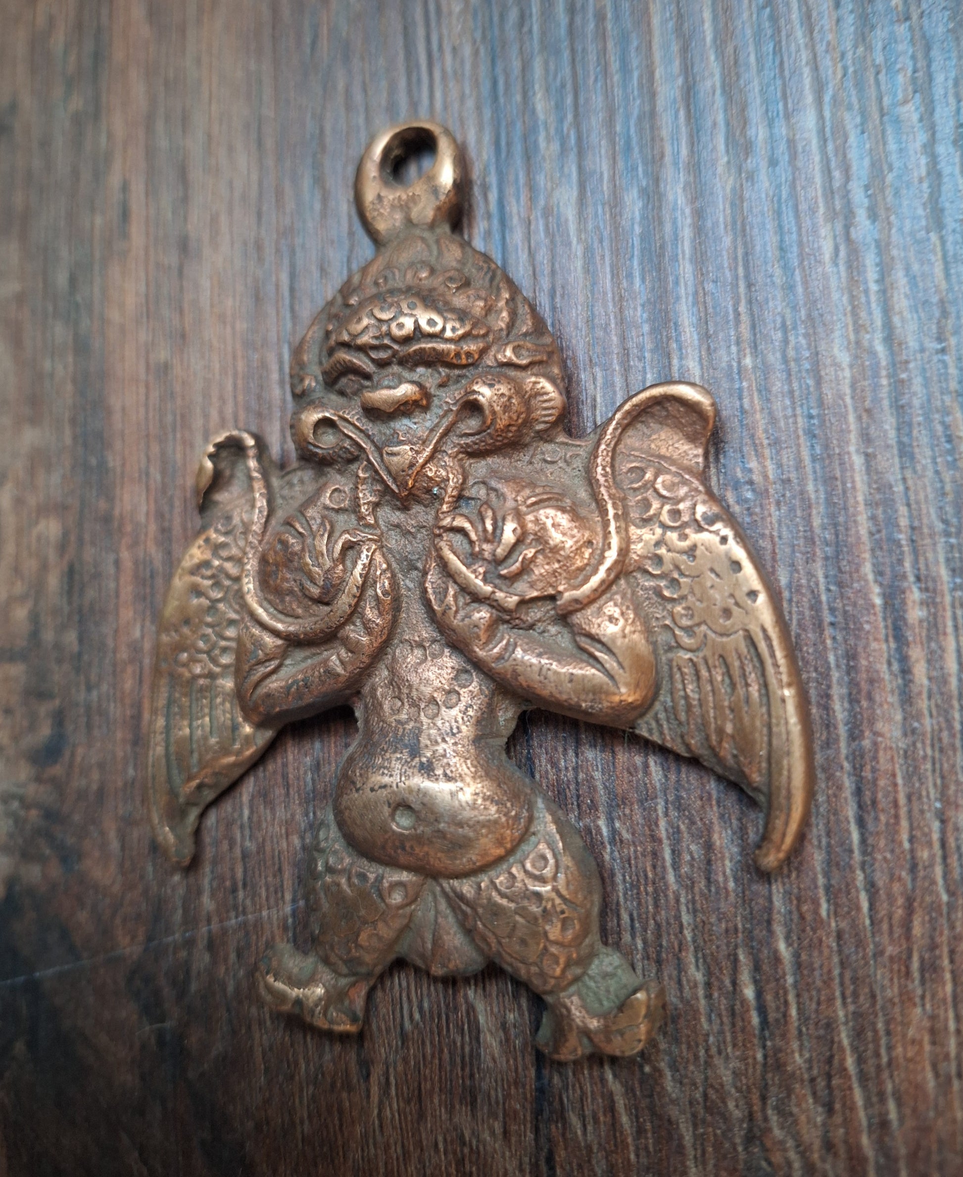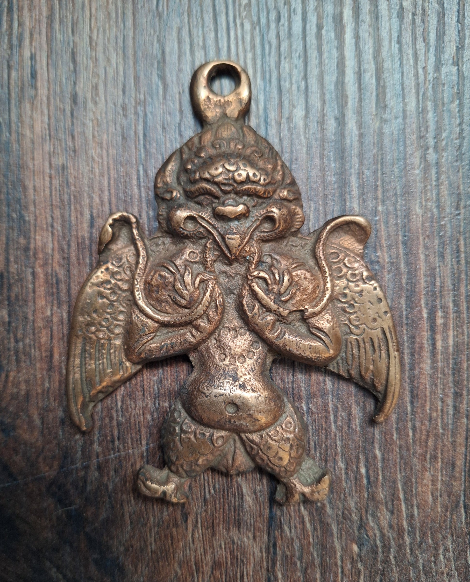 This Garuda pendant is from vintage origin. It comes from Nepal and is made from red copper. Due to its age and previous usage, of course some minor imperfections and damages might be seen, but overall this pendant is in very good condition.