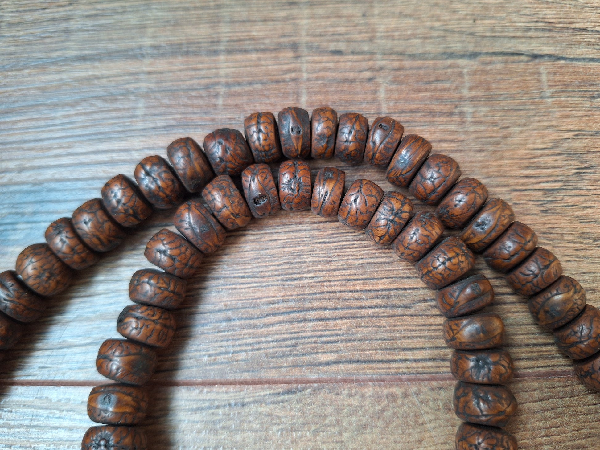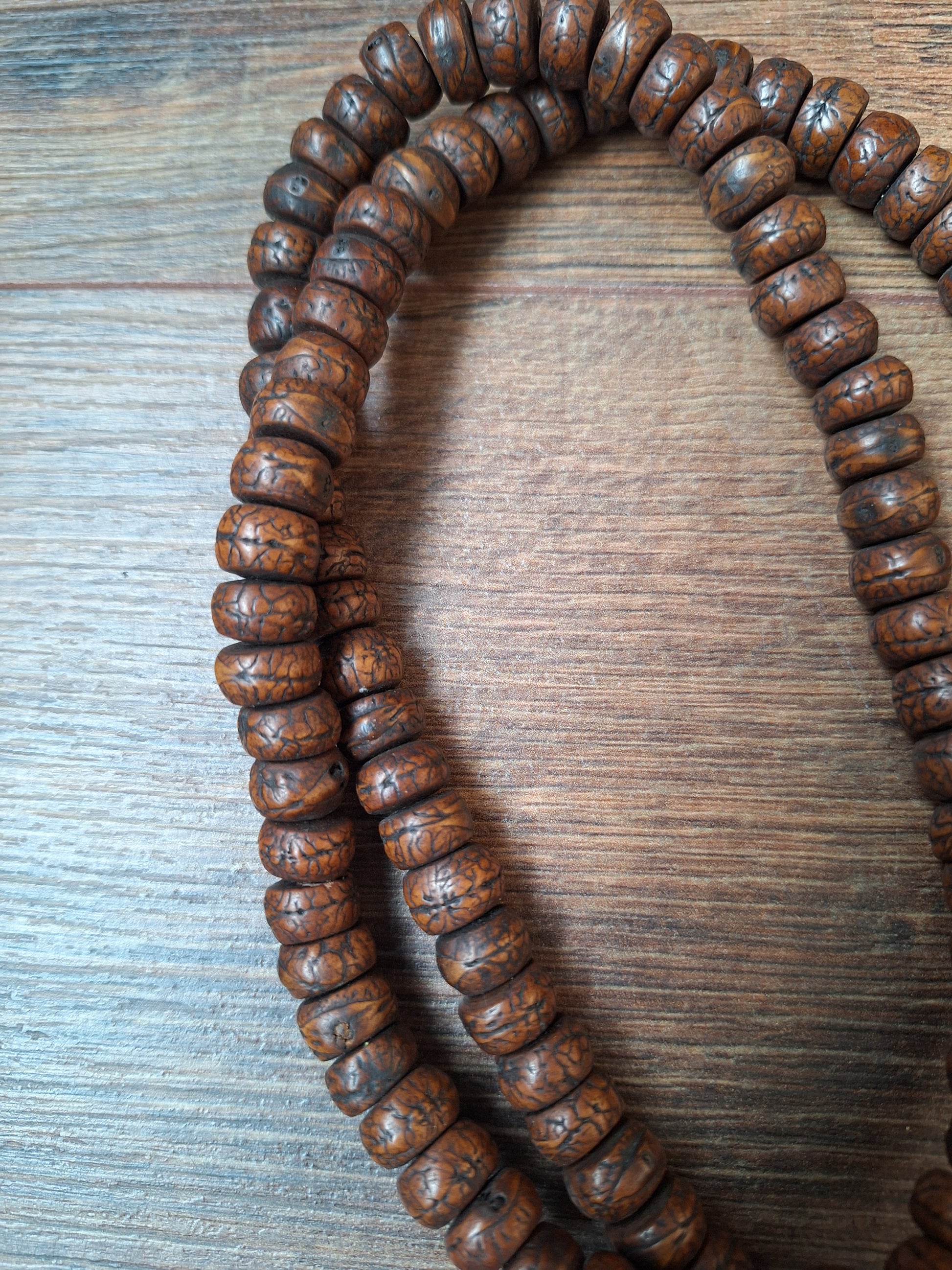 Vintage Nepalese rudraksha mala. The rudraksha beads have been sliced into flat beads and polished and oiled to make them feel smooth to the touch.