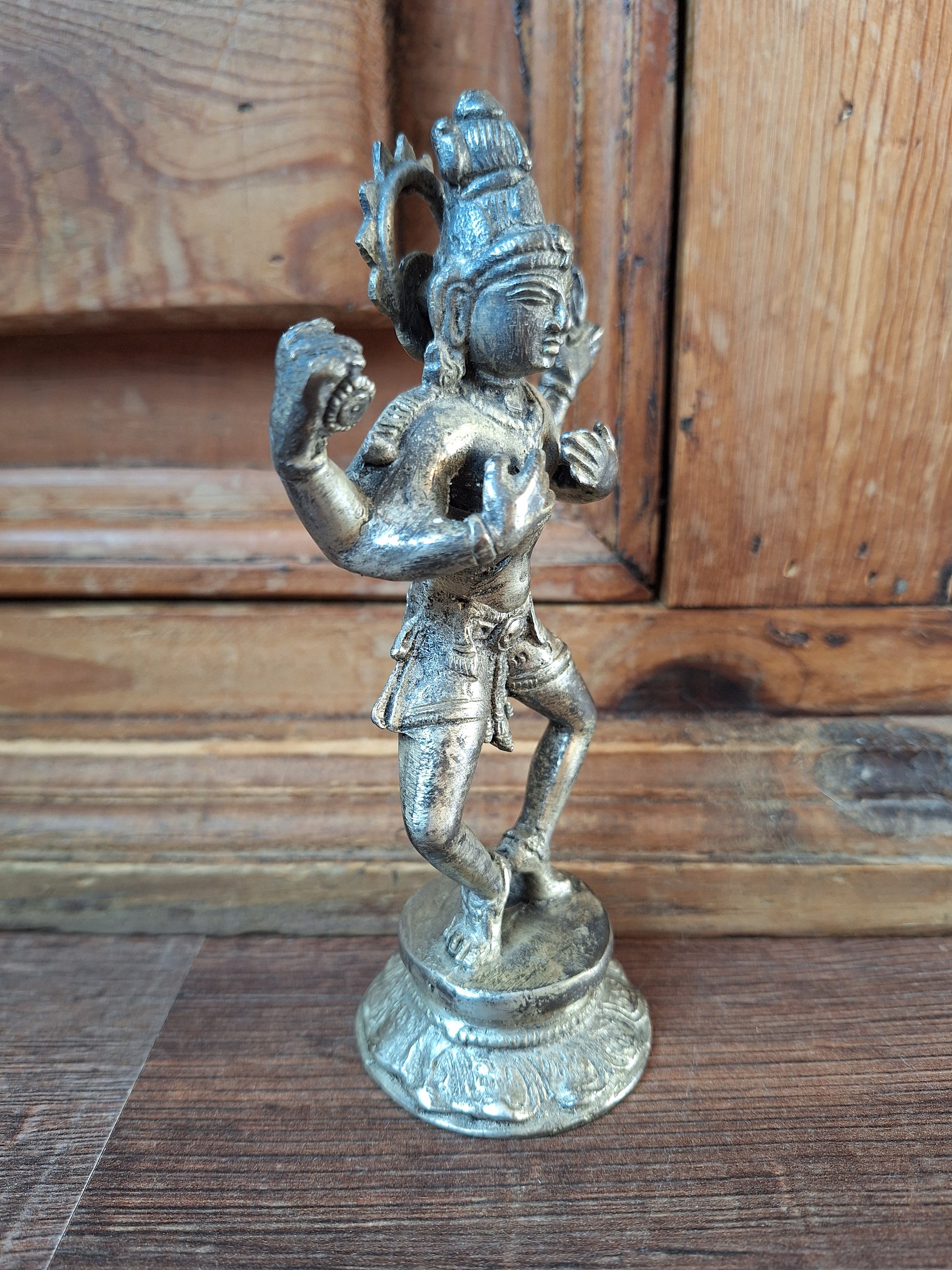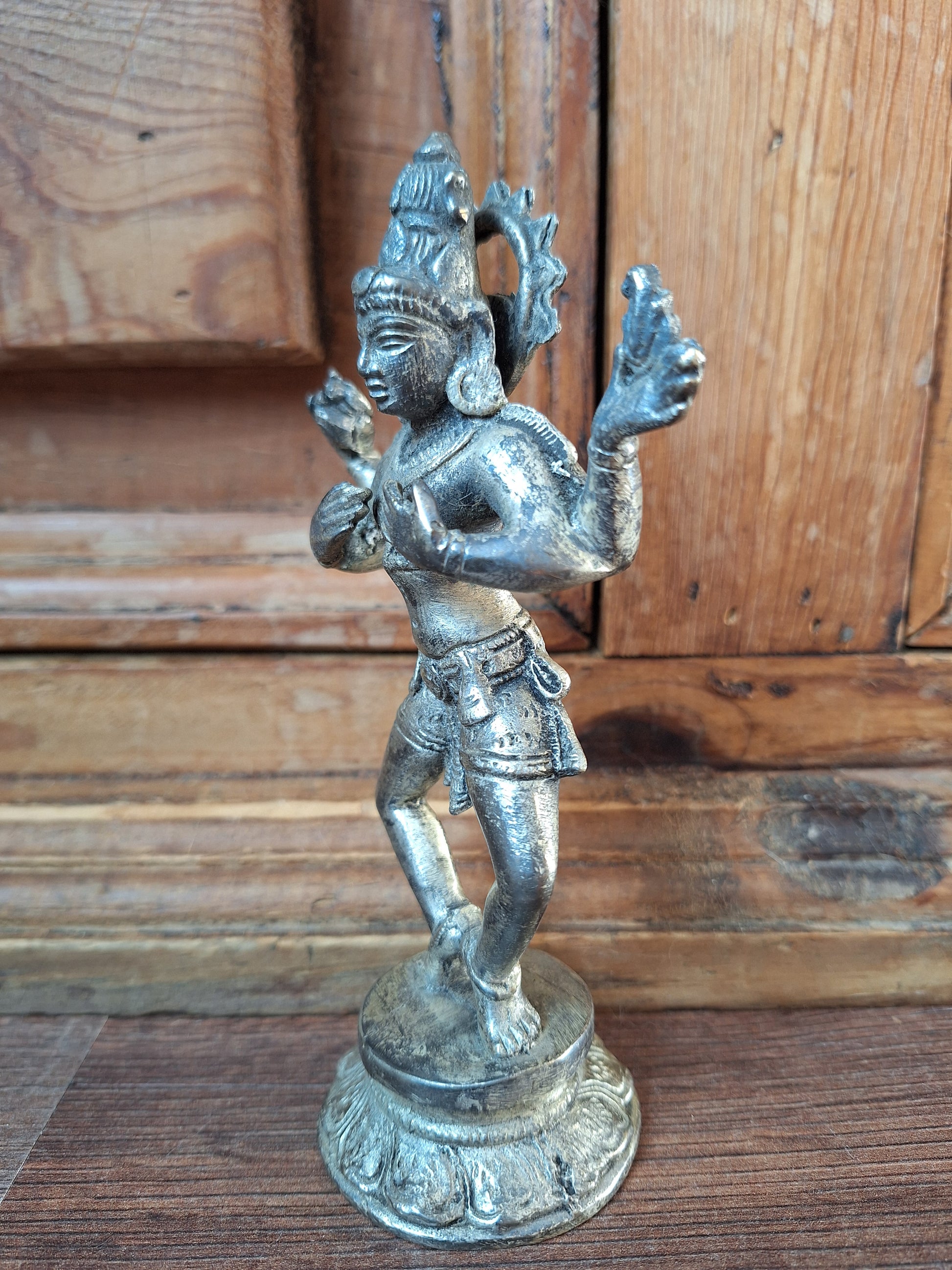 Vintage silver bronze figurine depicting the Hindu deity Shiva in one of his most famous manifestations; Nataraja, the divine cosmic dancer.