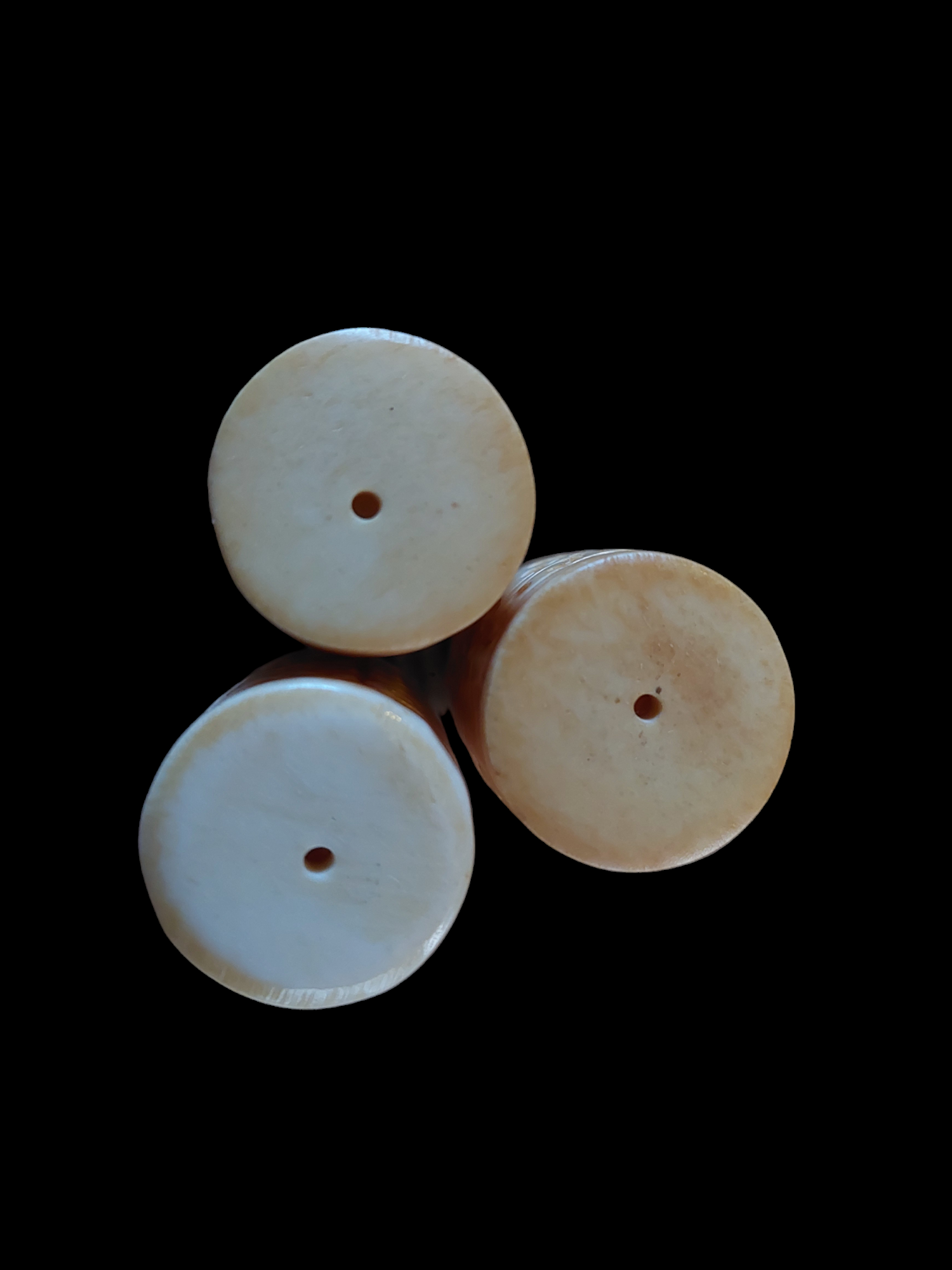 Beautiful, big, cylinder shaped beads, handcarved from yak bone. The bone has been completely hollowed out on the inside, after which a cap has been glued to both ends (with of course a small hole for the thread).