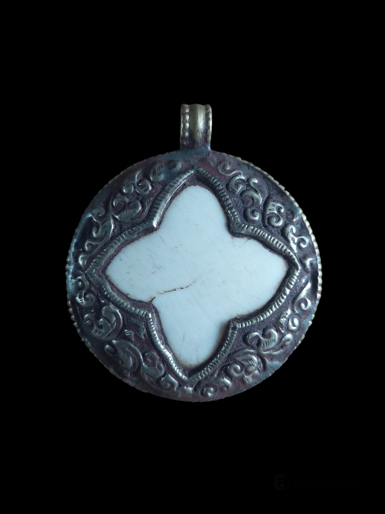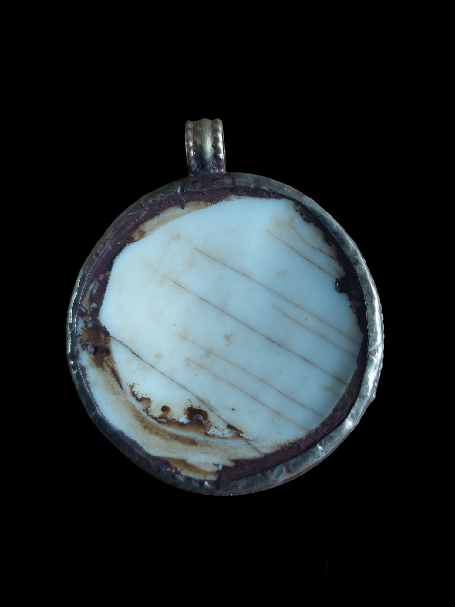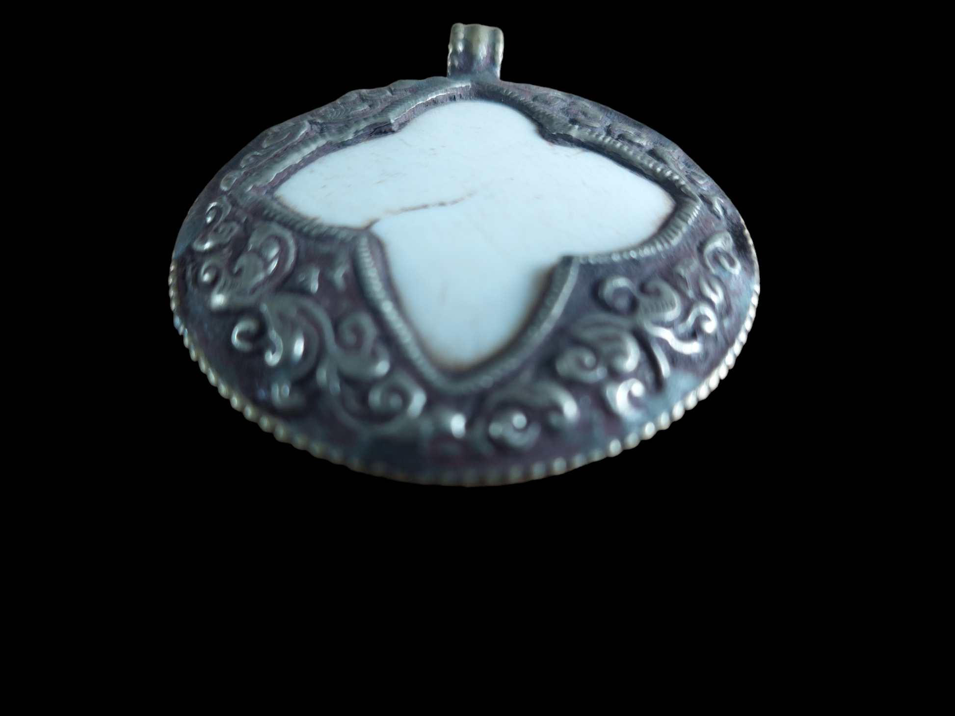 Very nice vintage Tibetan silver pendant featuring a piece of conch shell.