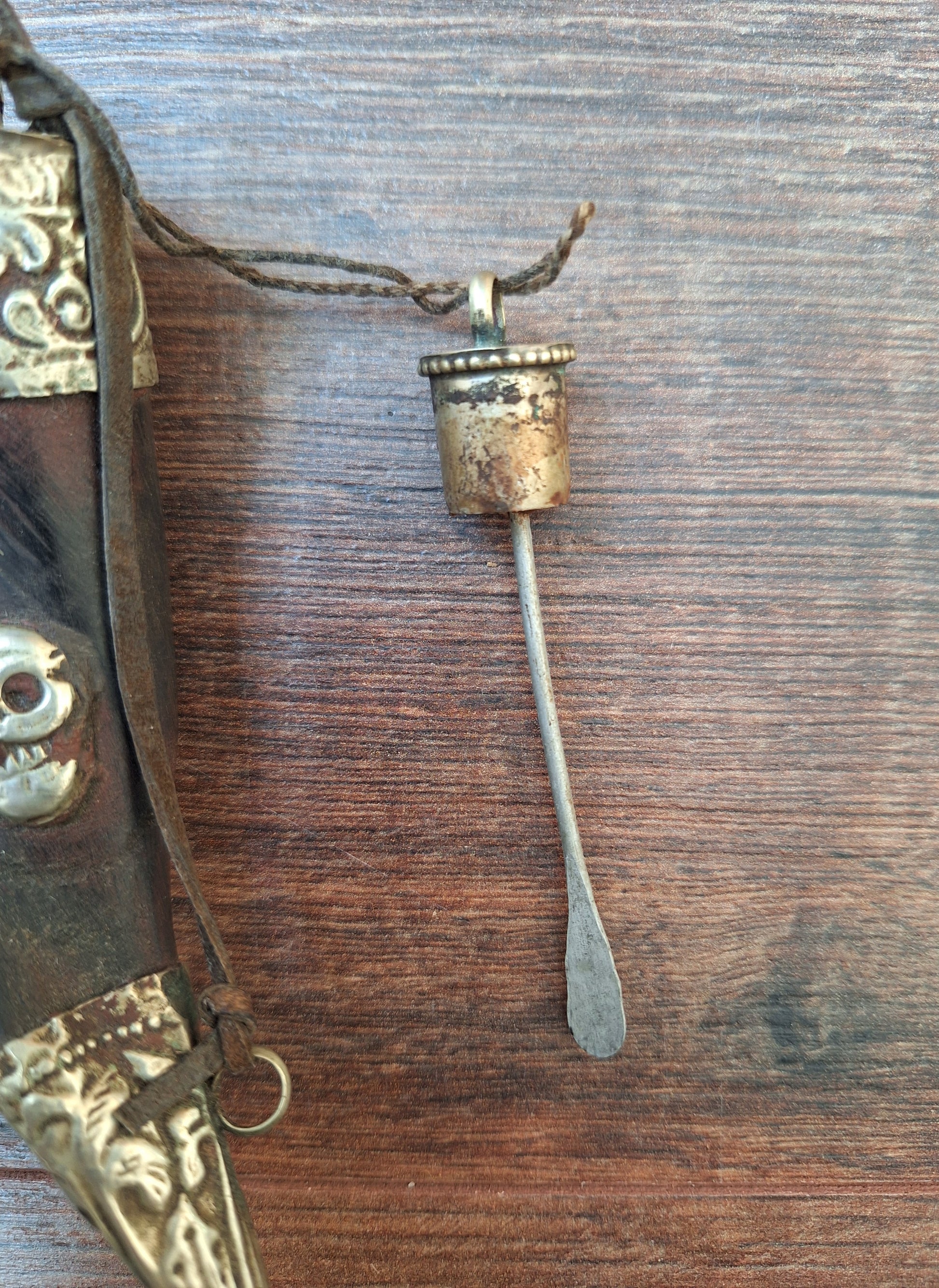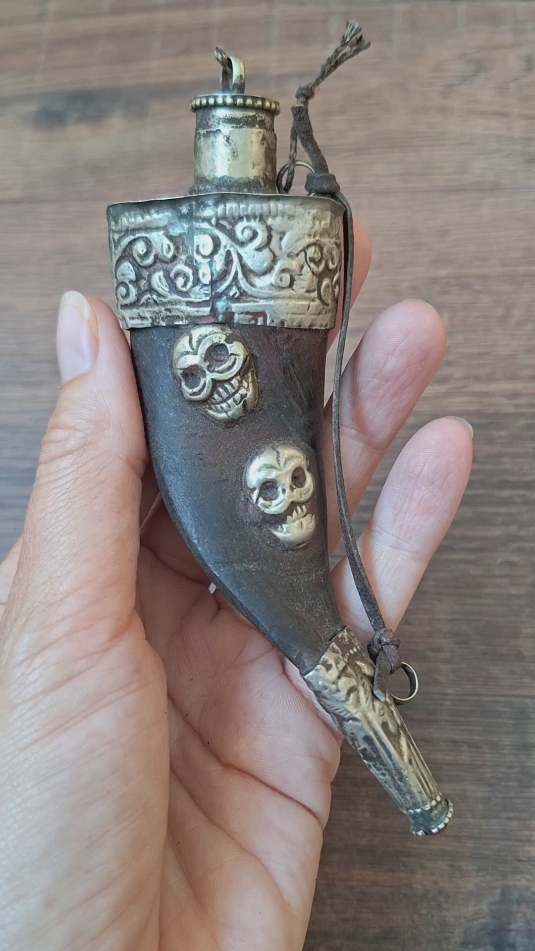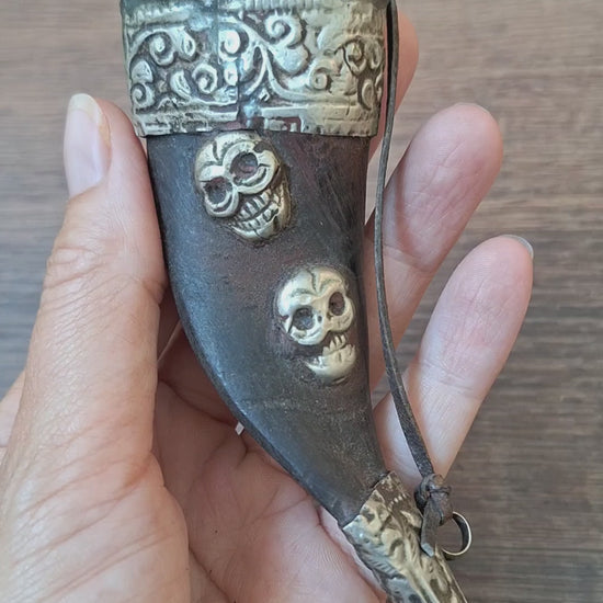Beautiful Tibetan snuff or medicine bottle made from a cow's horn, decorated with Tibetan silver plating, skull appliques and some (faux) gemstone cabochons. From vintage origin, but overall in good condition.