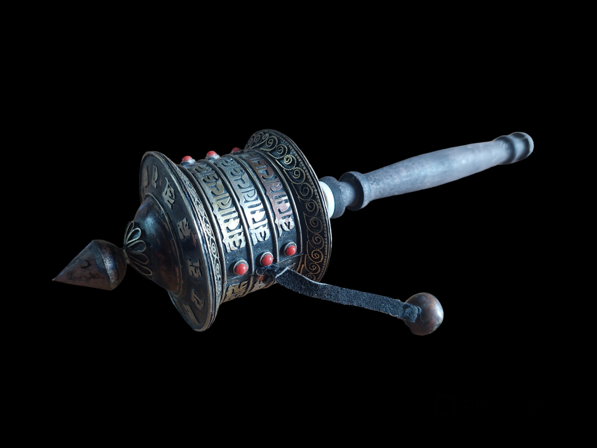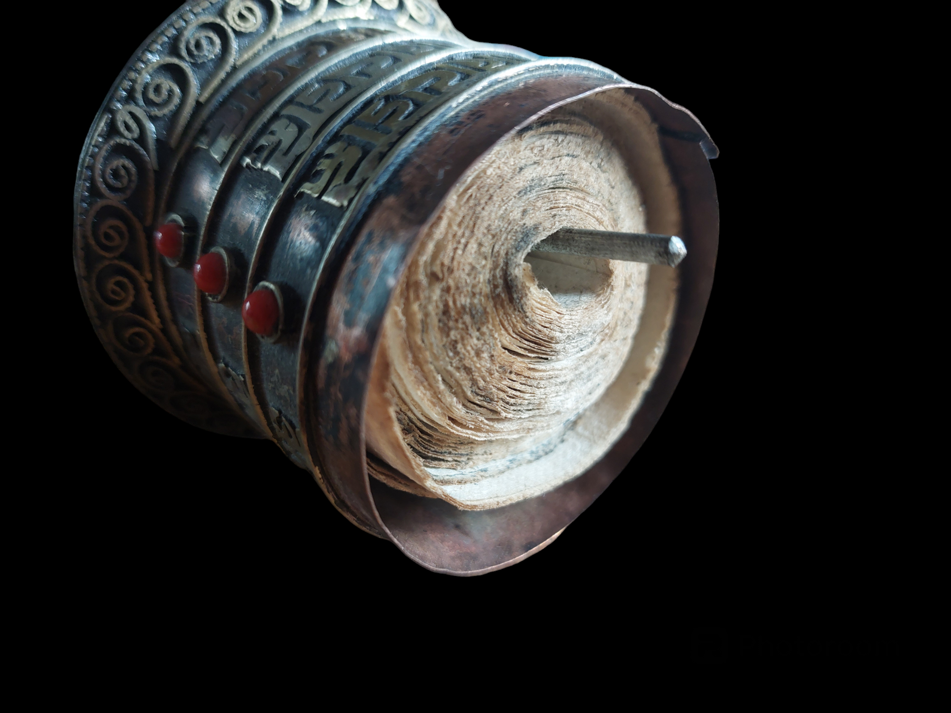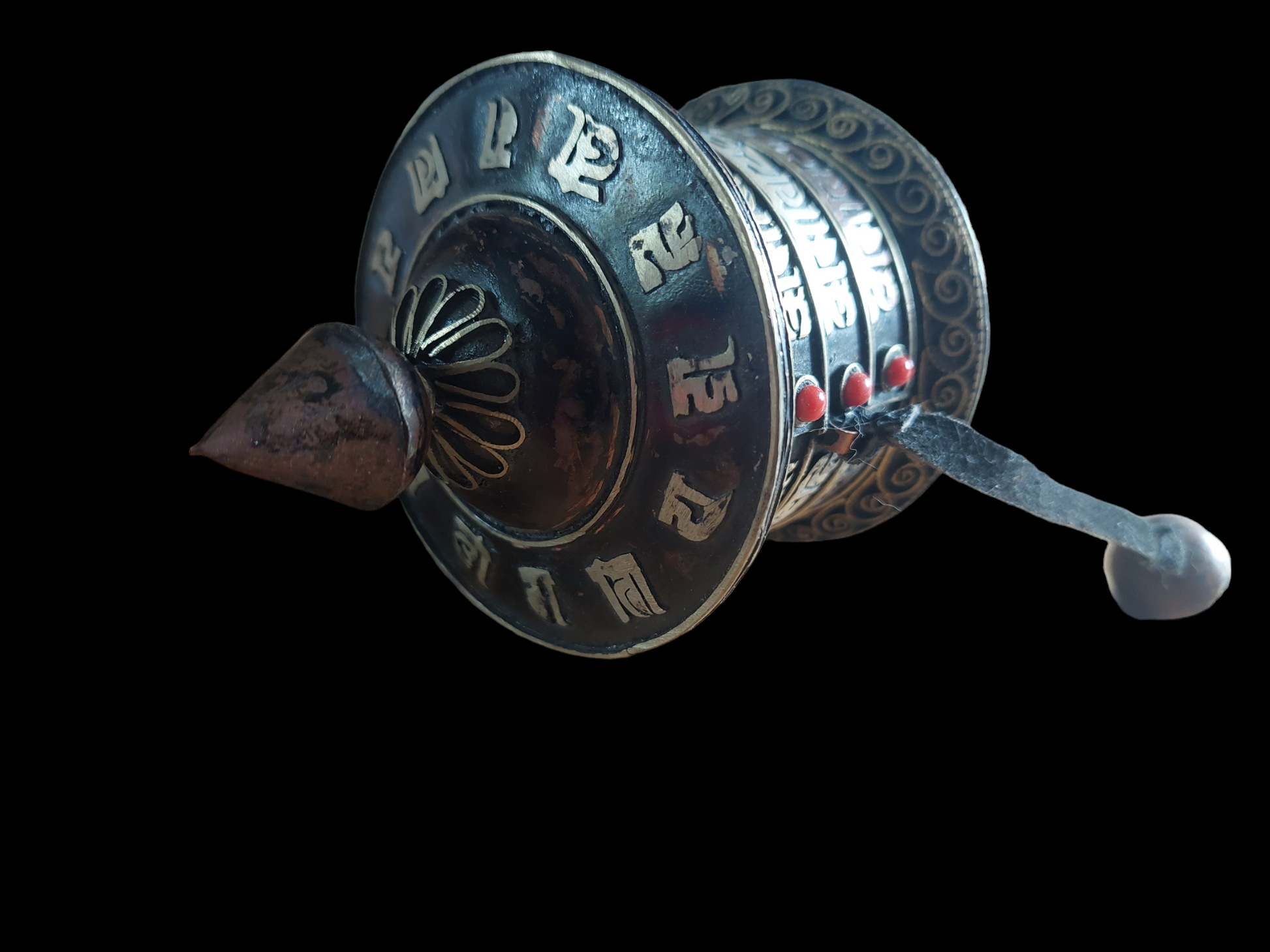 A prayer wheel (also called ‘mani wheel’) is a common device in Tibetan Buddhism, consisting of a cylindrical wheel spinning around an axis. A mantra, most often “Om Mani Padme Hum”, can be written both on the outside of the wheel and on a paper scroll inside the cylinder.