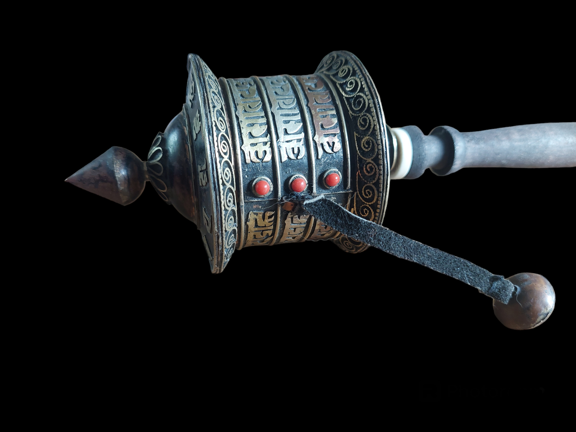 This Tibetan hand held prayer wheel here in our shop is from vintage origin, but still in good condition.