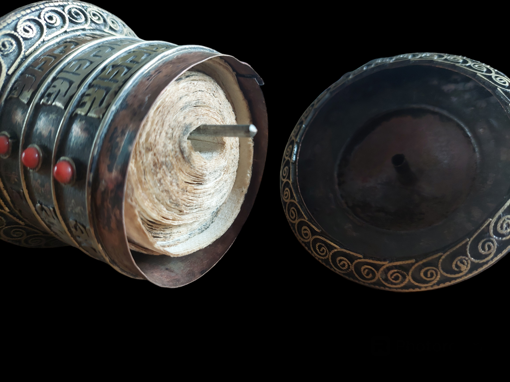 The use of prayer wheels can be traced back to 4th century CE Tibet and China. Its origin is often associated with the Indian monk and Mahayana Buddhist philosopher Nagarjuna. The prayer wheel is a physical manifestation of the Buddhist concept of how Buddha set the ‘Wheel of Dharma’ in motion when delivering his first teaching.