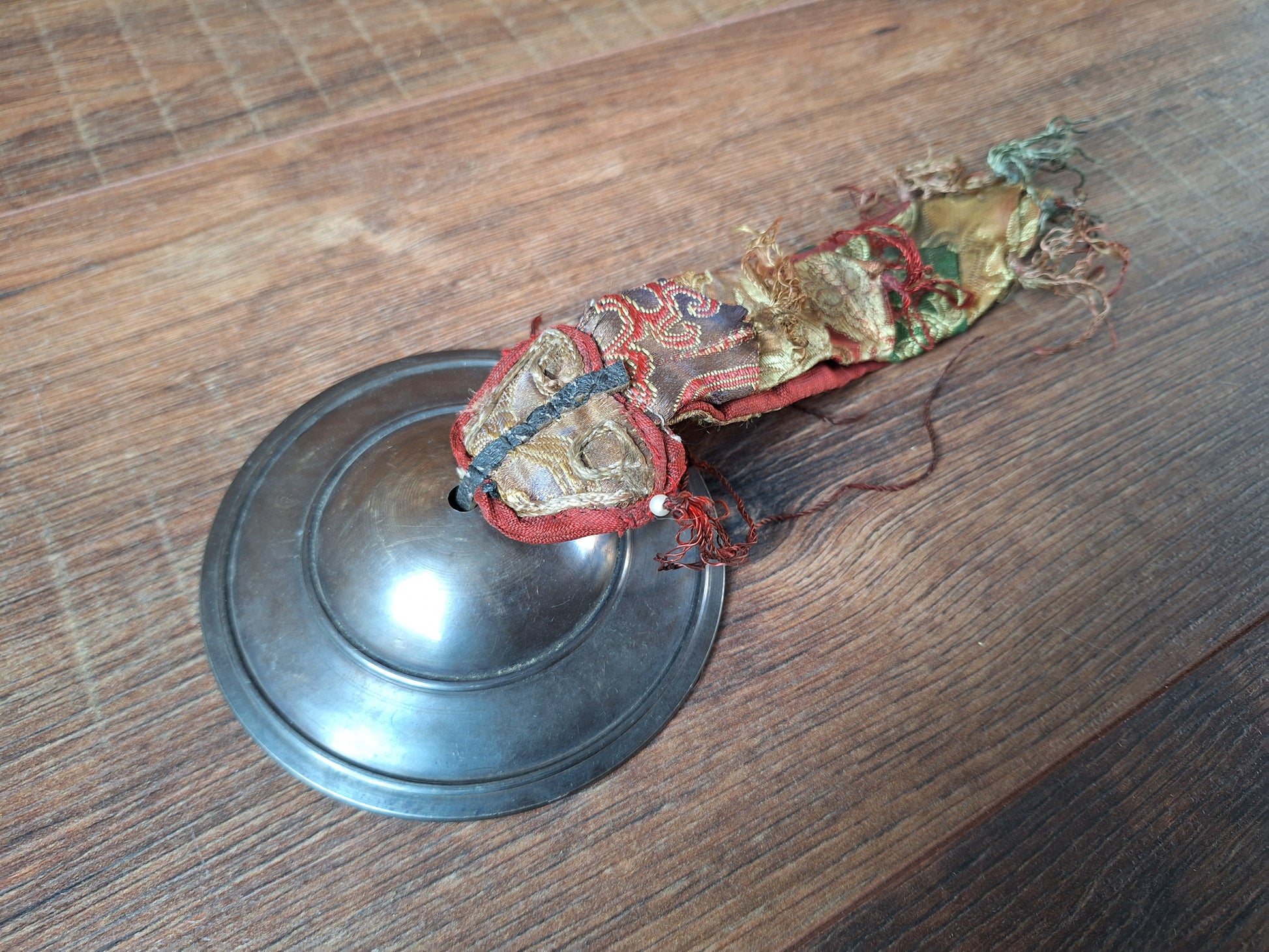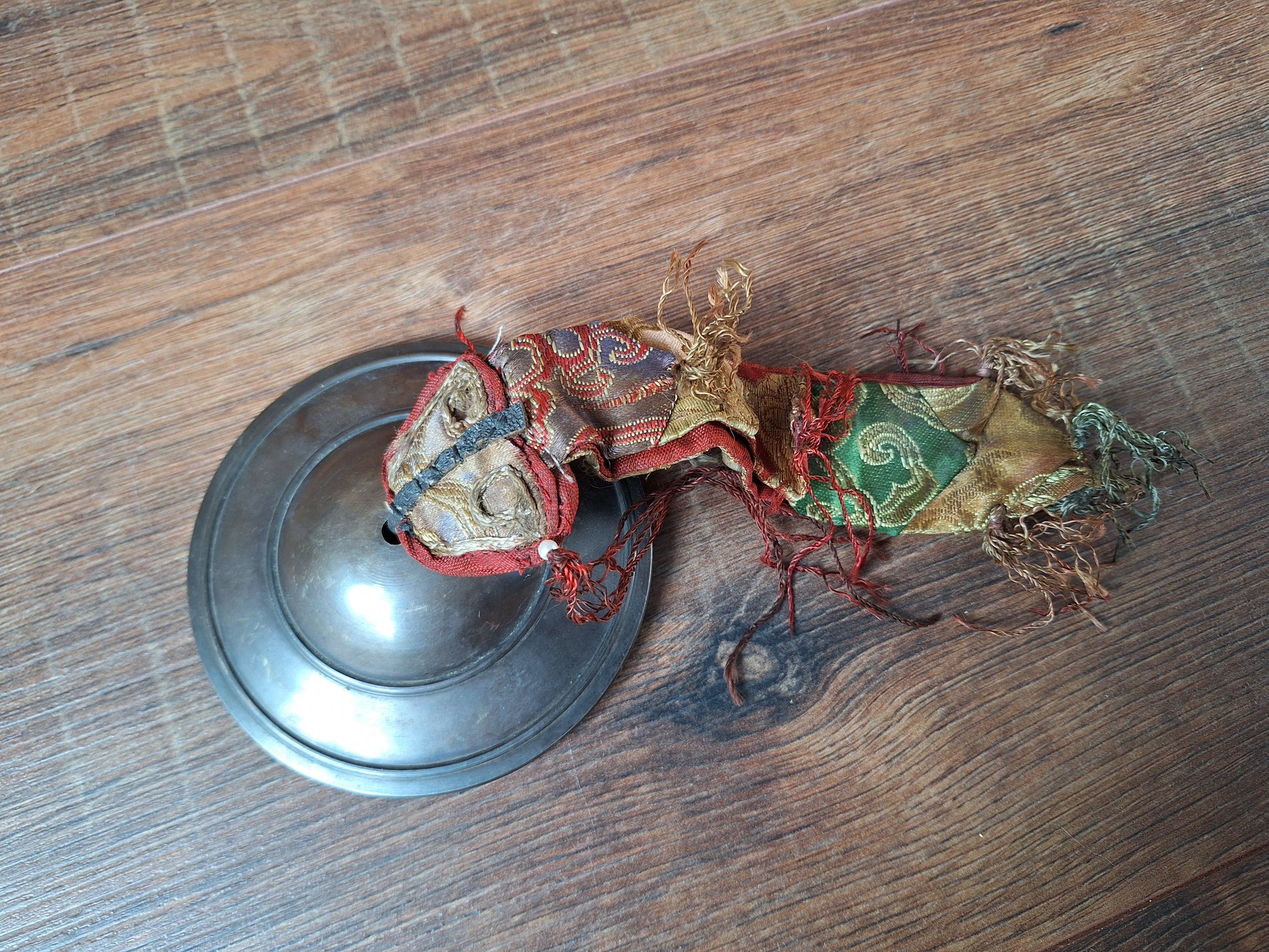 This shang bell has a diameter of 11 centimeters. For a handle, a 20 centimeters long banner of multi-layered silk brocade with tassels has been used. This typical style of fabric usage can be found in many different applications in Himalayan regions; varying from smaller sizes being used as handle for ritual attributes, to much bigger items such as the meters-long "shambu" wall decorations or the high "chukor" ceiling hangings in temples and monasteries. In all instances it symbolizes a similar meaning; The multi-colored, shiny and elaborate applique banner represents the auspicious blessings of the jewels of the dharma being sent forth as multi-colored rainbow light.