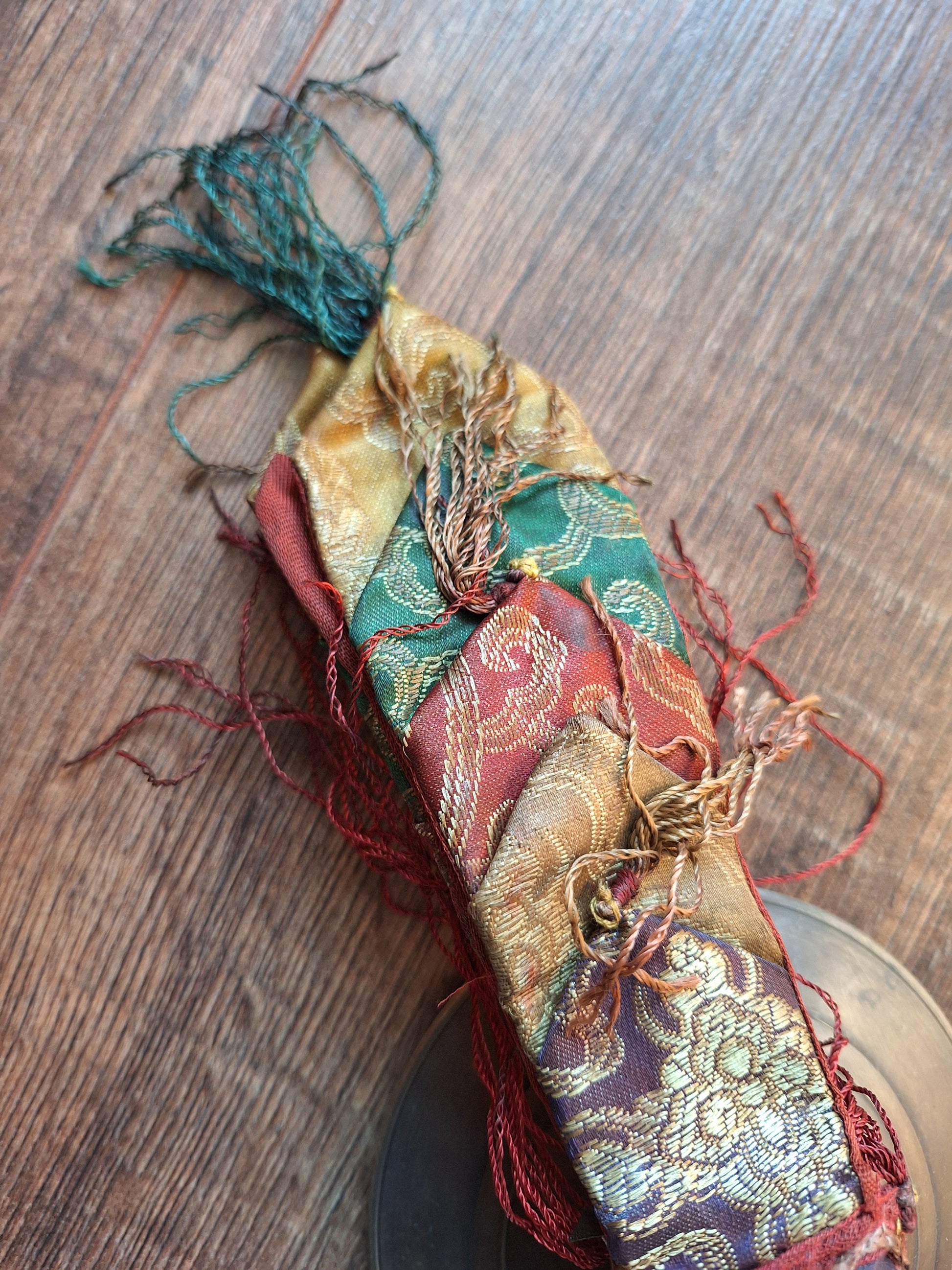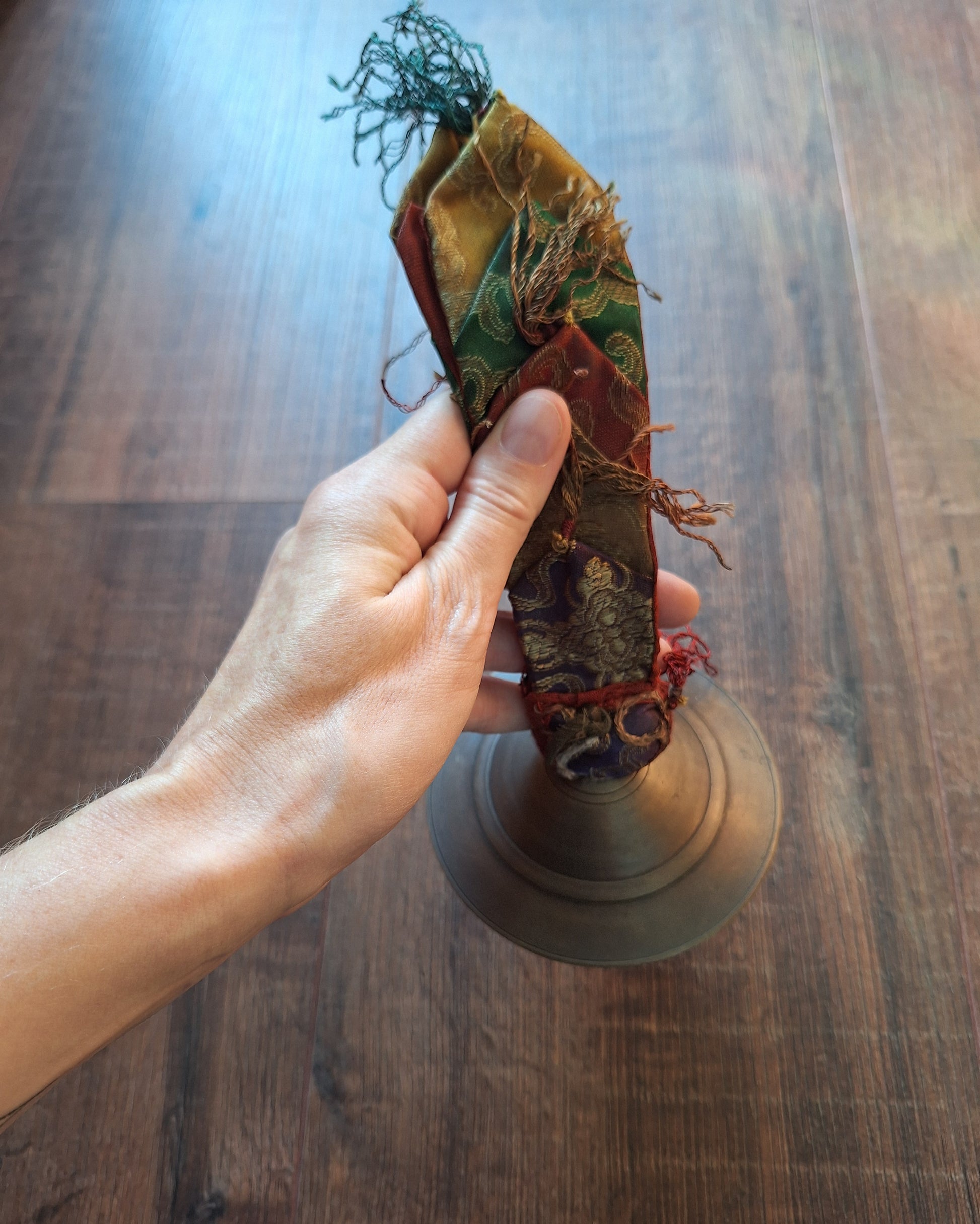 This shang bell has a diameter of 11,2 centimeters. For a handle, a 18,5 centimeters long banner of multi-layered silk brocade with tassels has been used. This typical style of fabric usage can be found in many different applications in Himalayan regions; varying from smaller sizes being used as handle for ritual attributes, to much bigger items such as the meters-long "shambu" wall decorations or the high "chukor" ceiling hangings in temples and monasteries. In all instances it symbolizes a similar meaning; The multi-colored, shiny and elaborate applique banner represents the auspicious blessings of the jewels of the dharma being sent forth as multi-colored rainbow light.