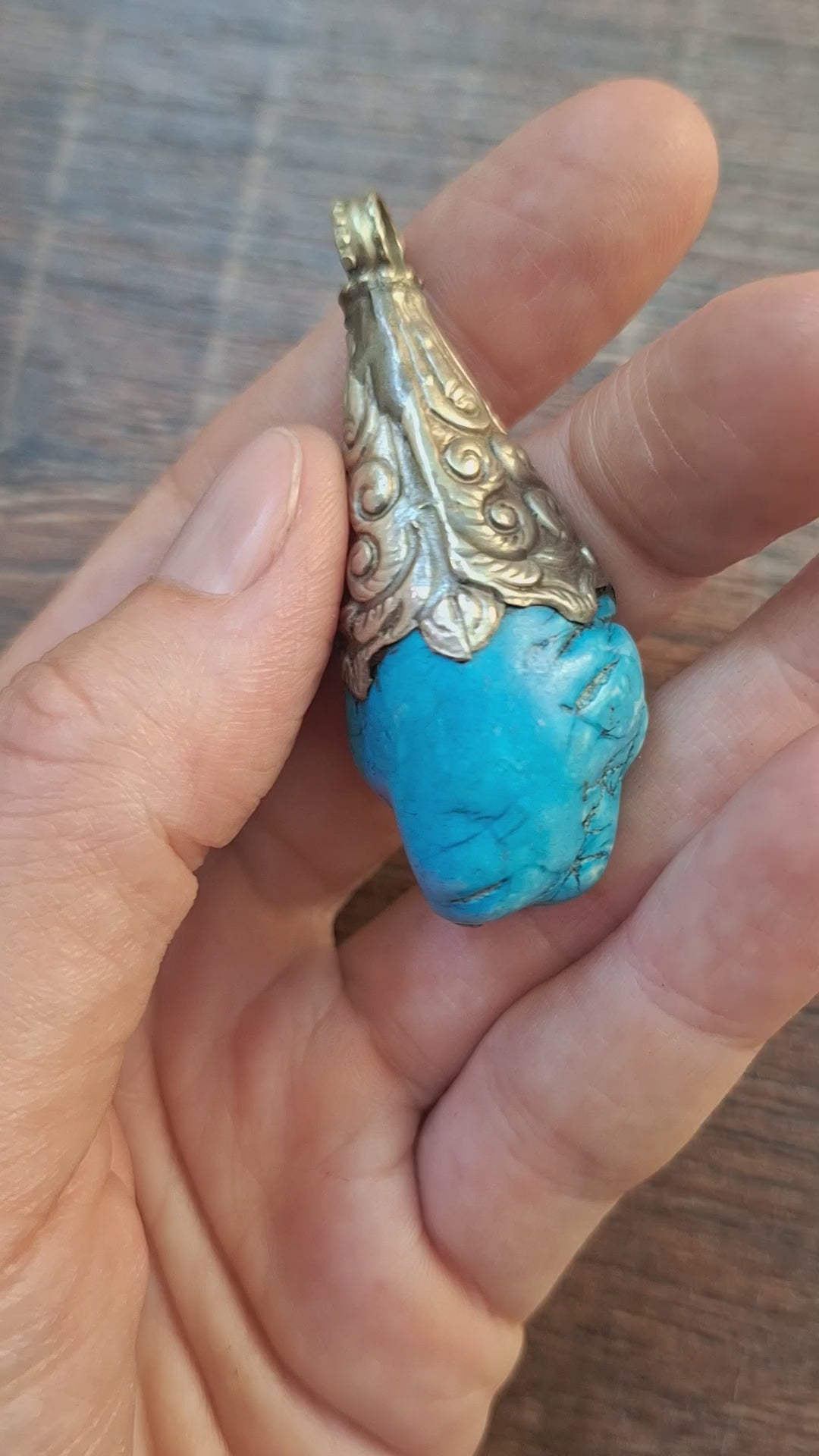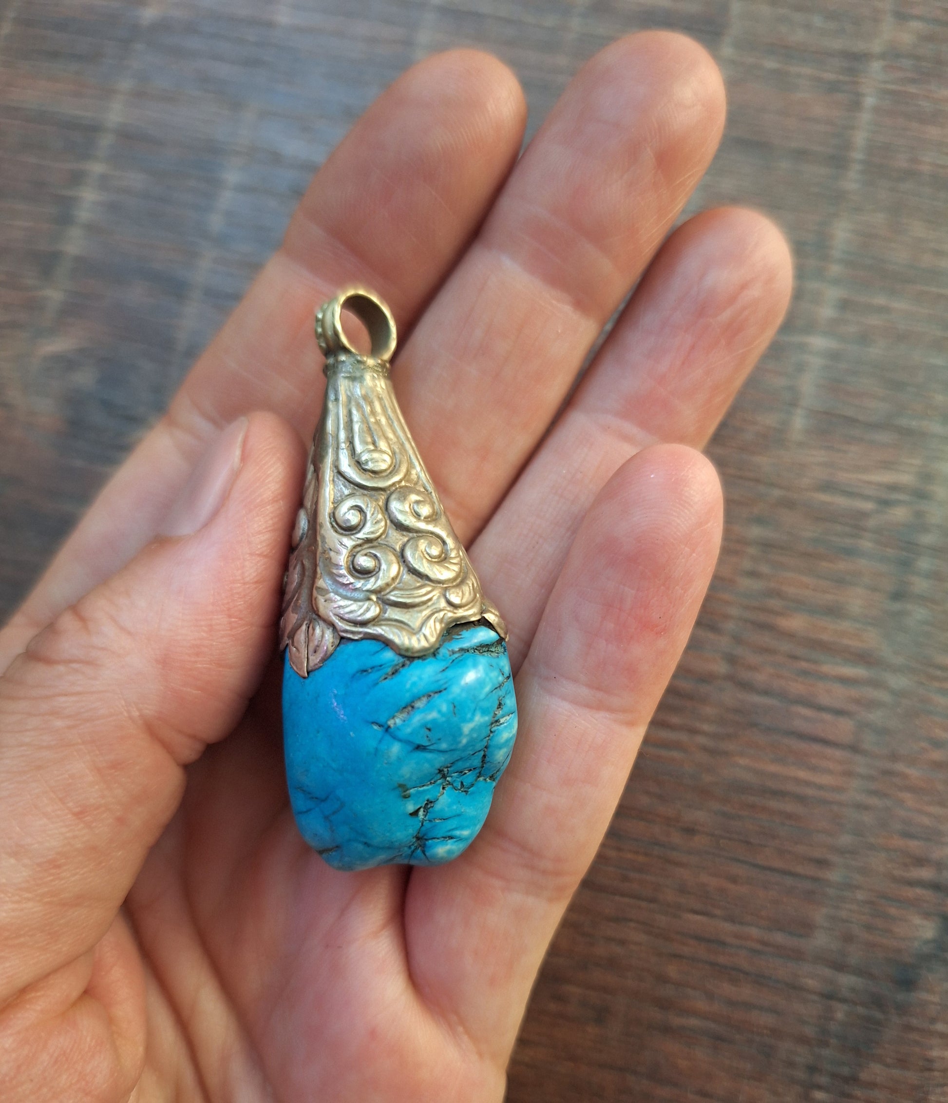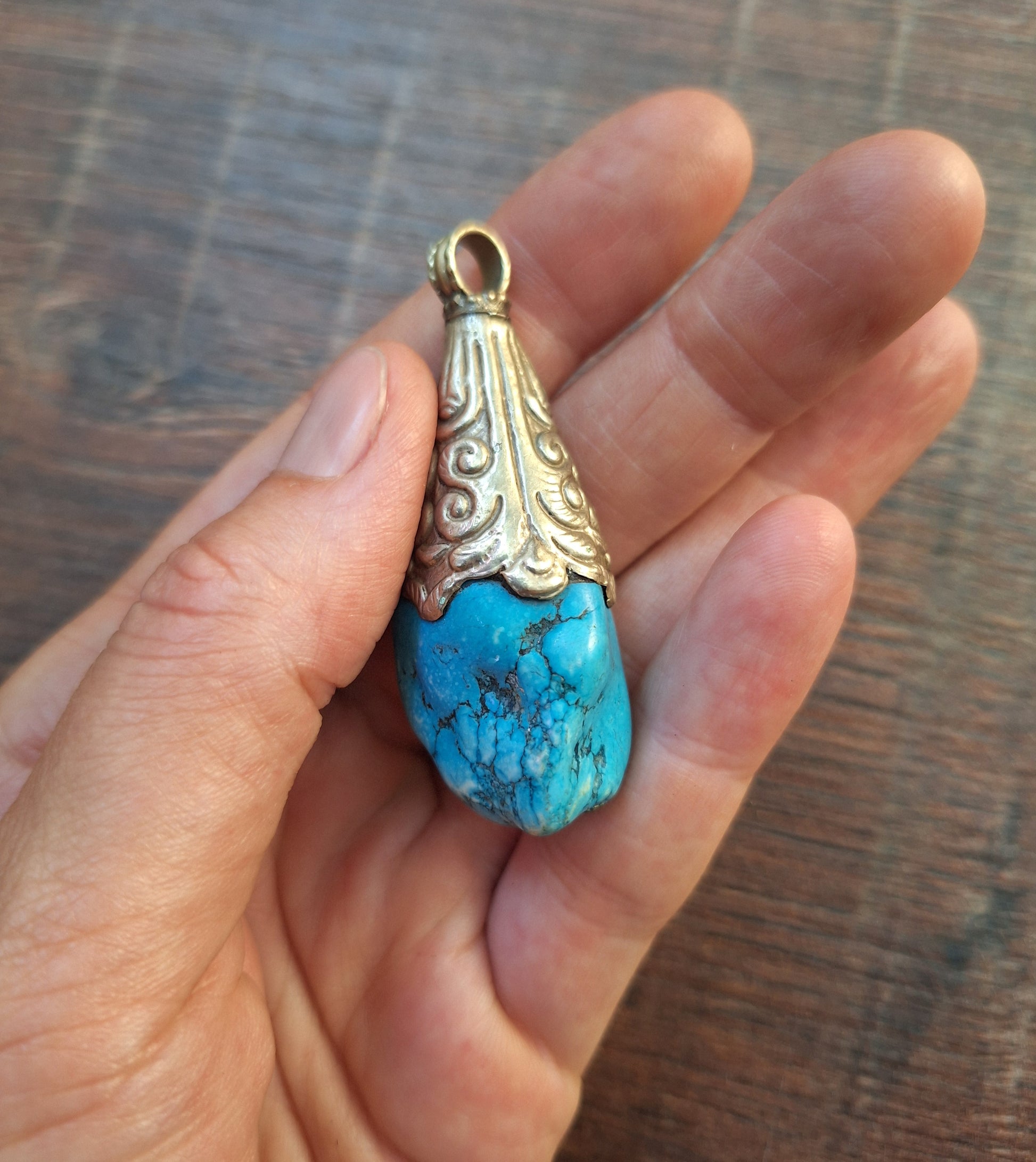 Vintage Tibetan silver pendant featuring a piece of turquoise colored howlite. In good condition.
