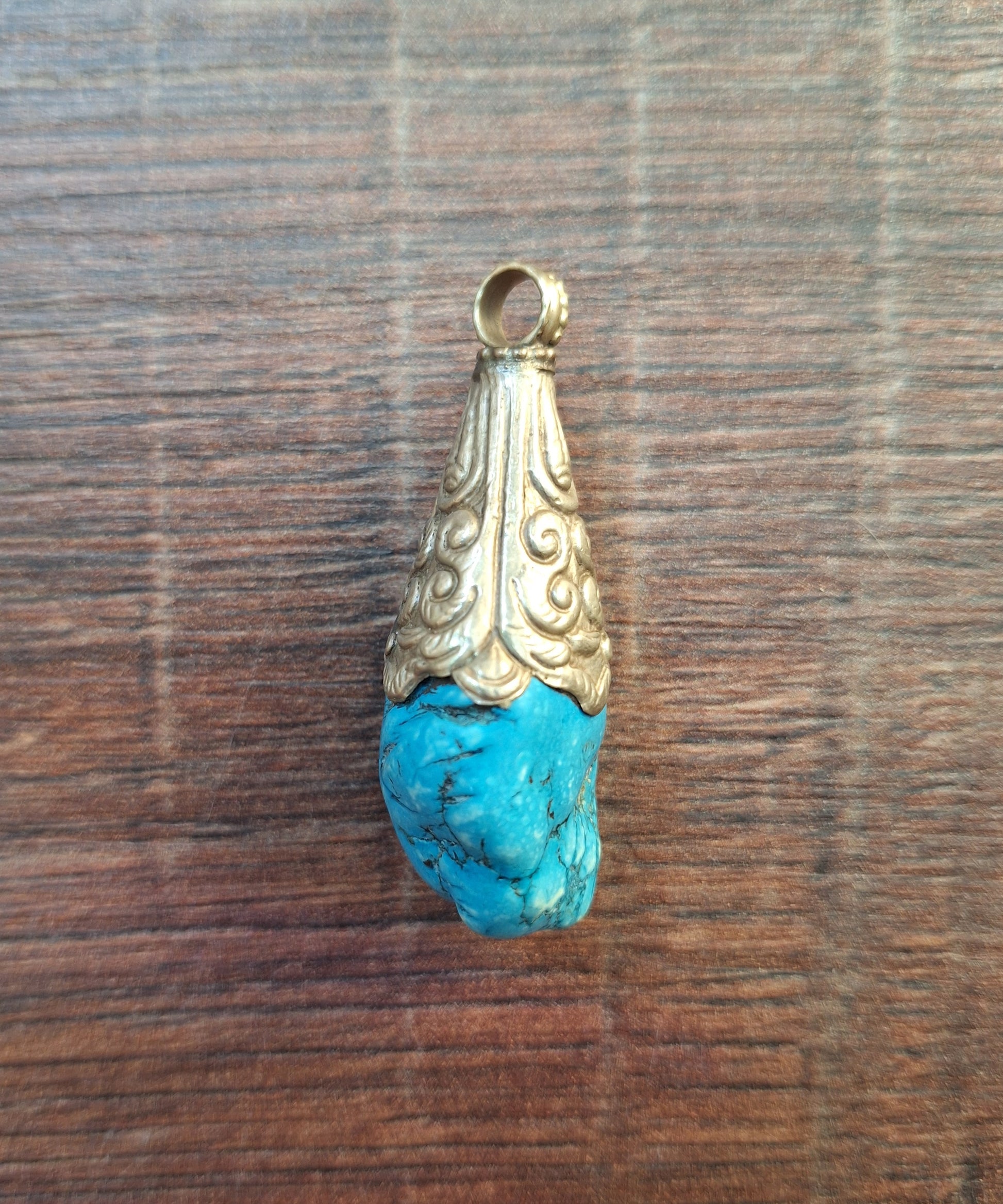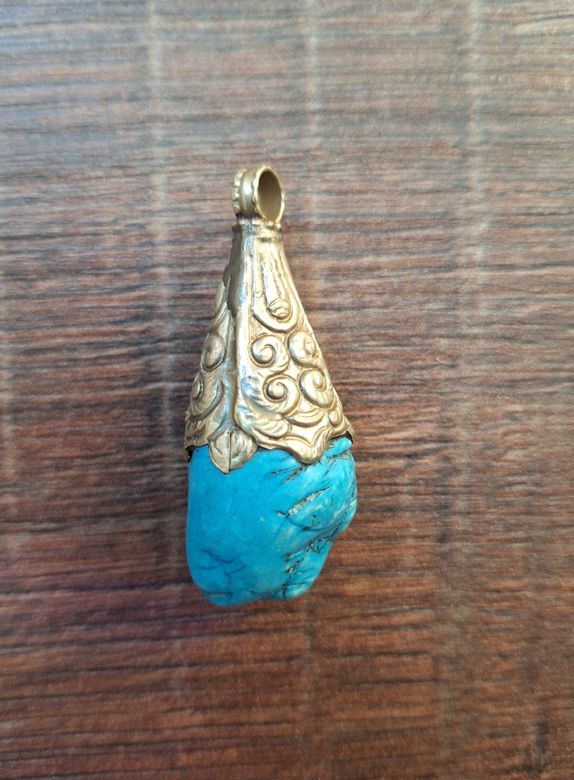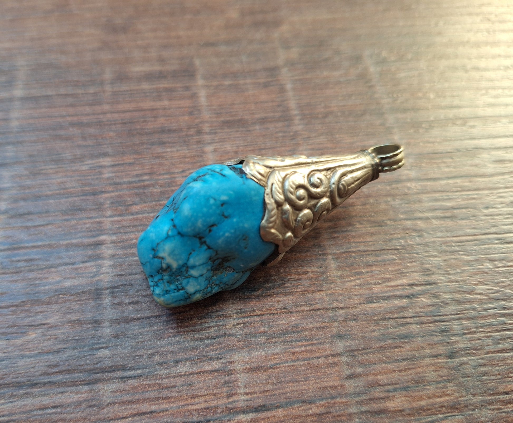 Vintage Tibetan silver pendant featuring a piece of turquoise colored howlite. In good condition.