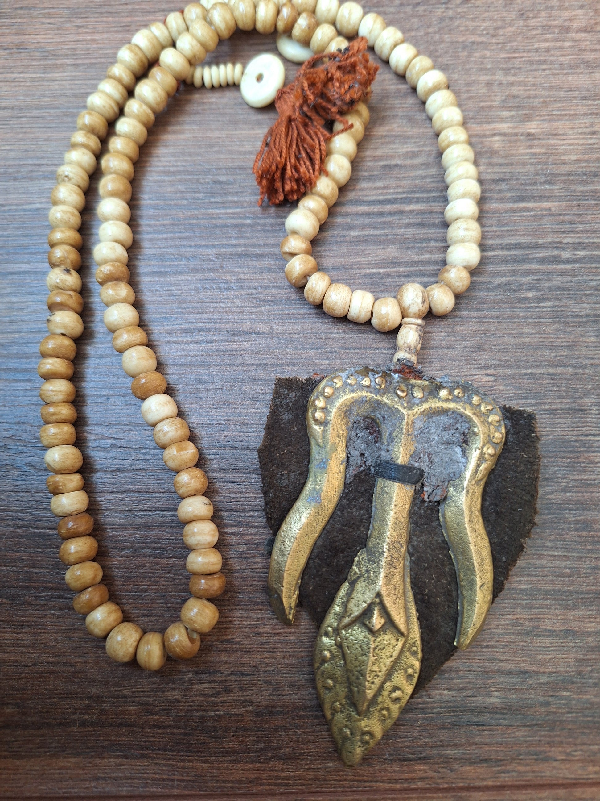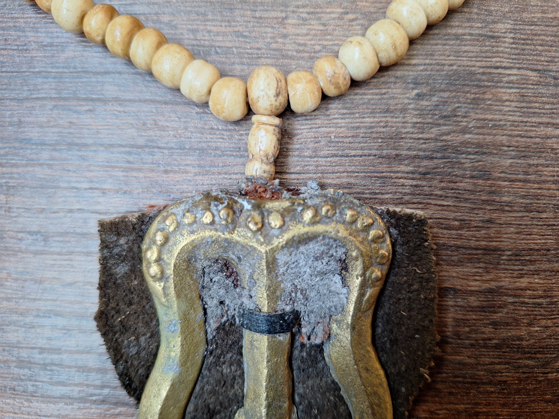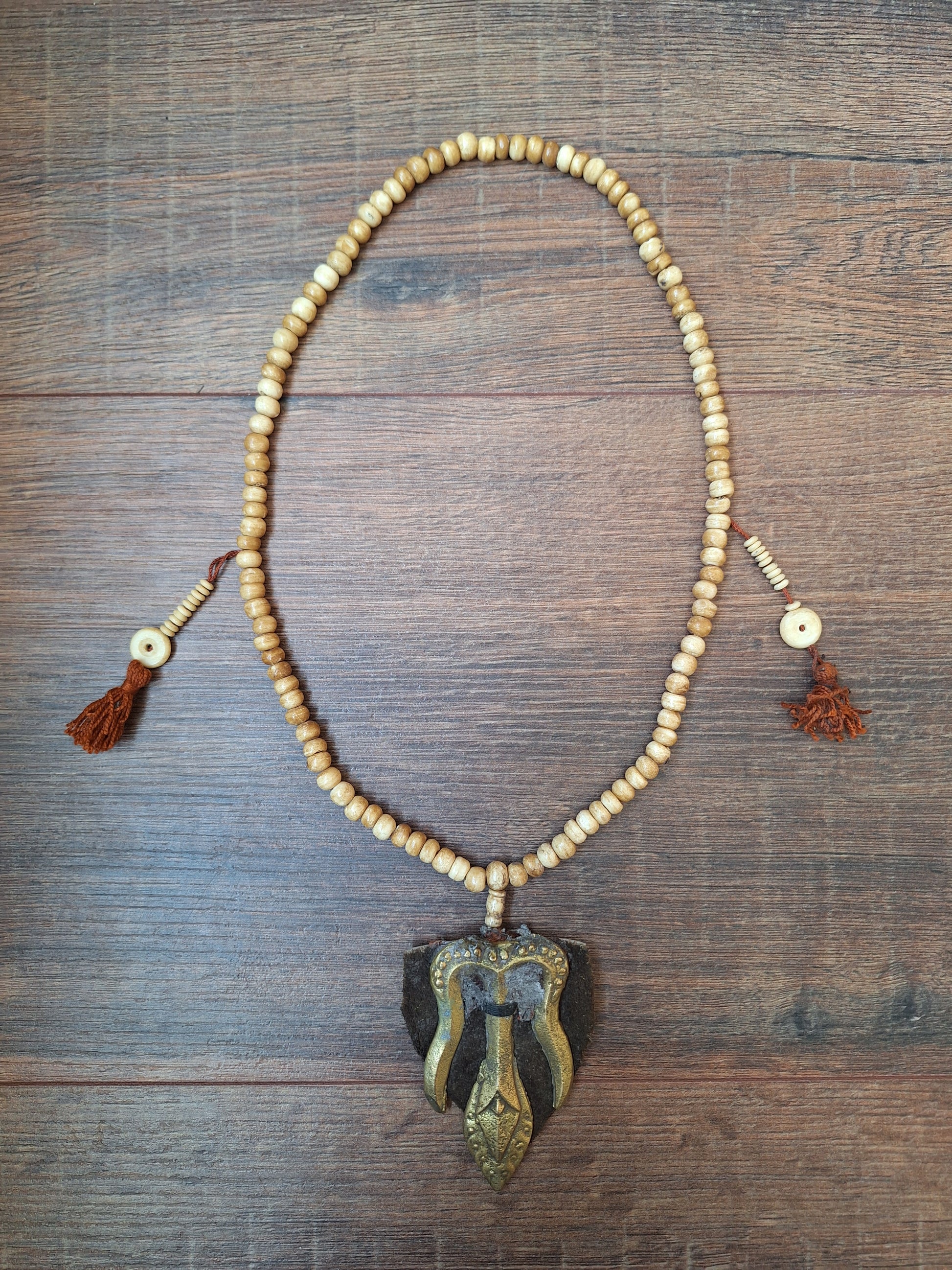 The centerpiece for this mala is a brass pendant of a trident, attached to a piece of leather fabric. This pendant is approximately 9,5 centimeters high. As can be seen on the pictures, the pendant has been made rather roughly and has traces of glue and some sort of clay (?) on it.
