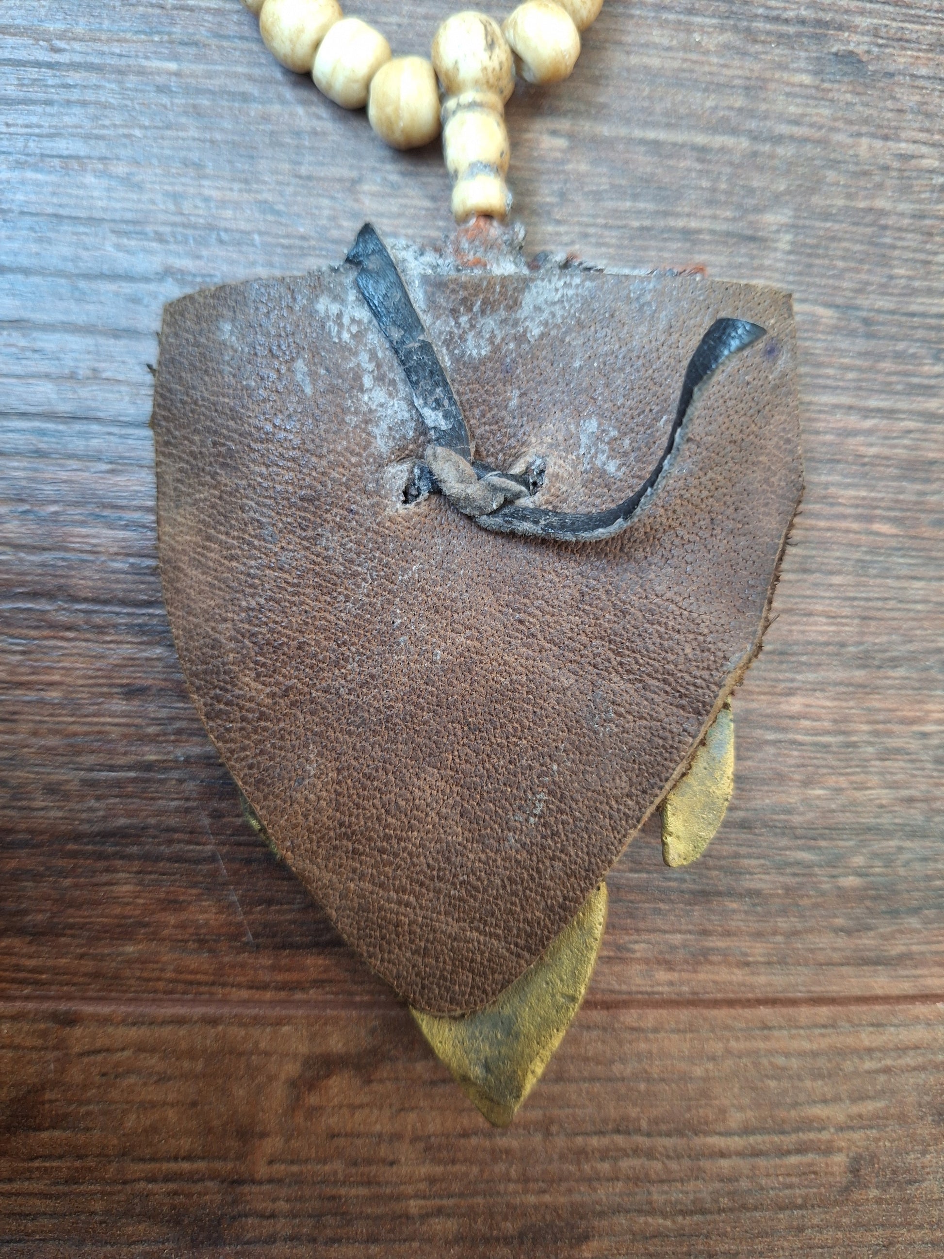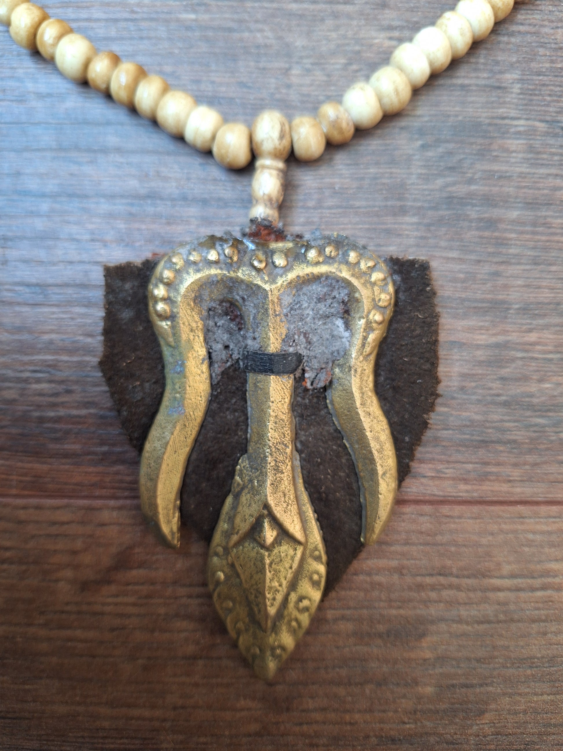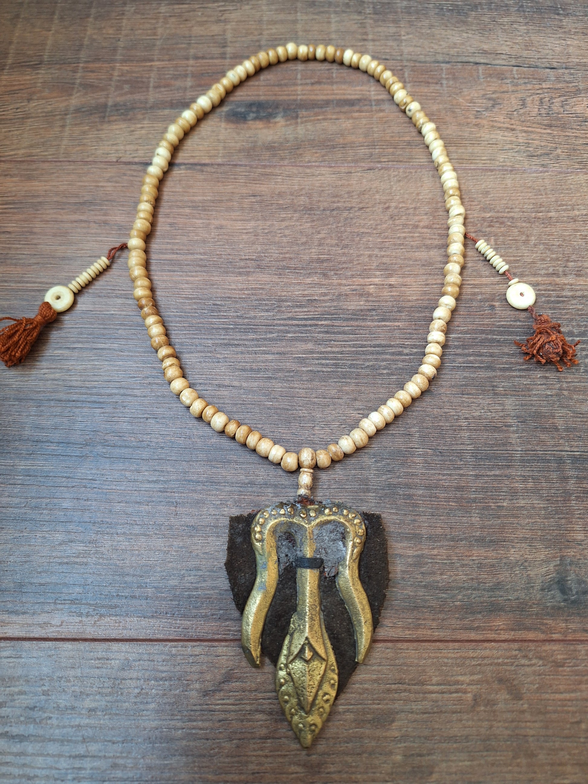 The centerpiece for this mala is a brass pendant of a trident, attached to a piece of leather fabric. This pendant is approximately 9,5 centimeters high. As can be seen on the pictures, the pendant has been made rather roughly and has traces of glue and some sort of clay (?) on it.
