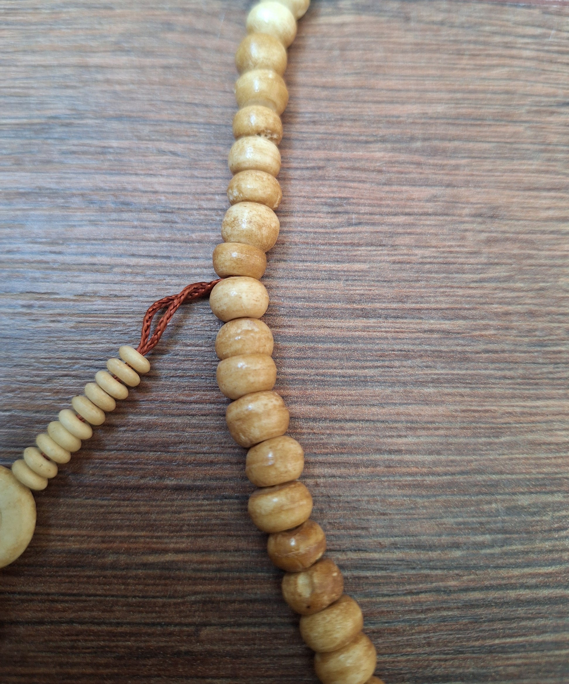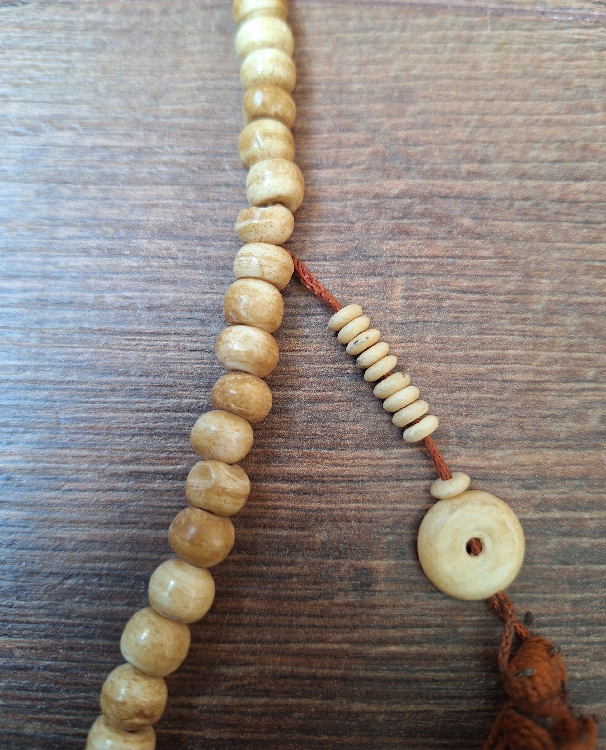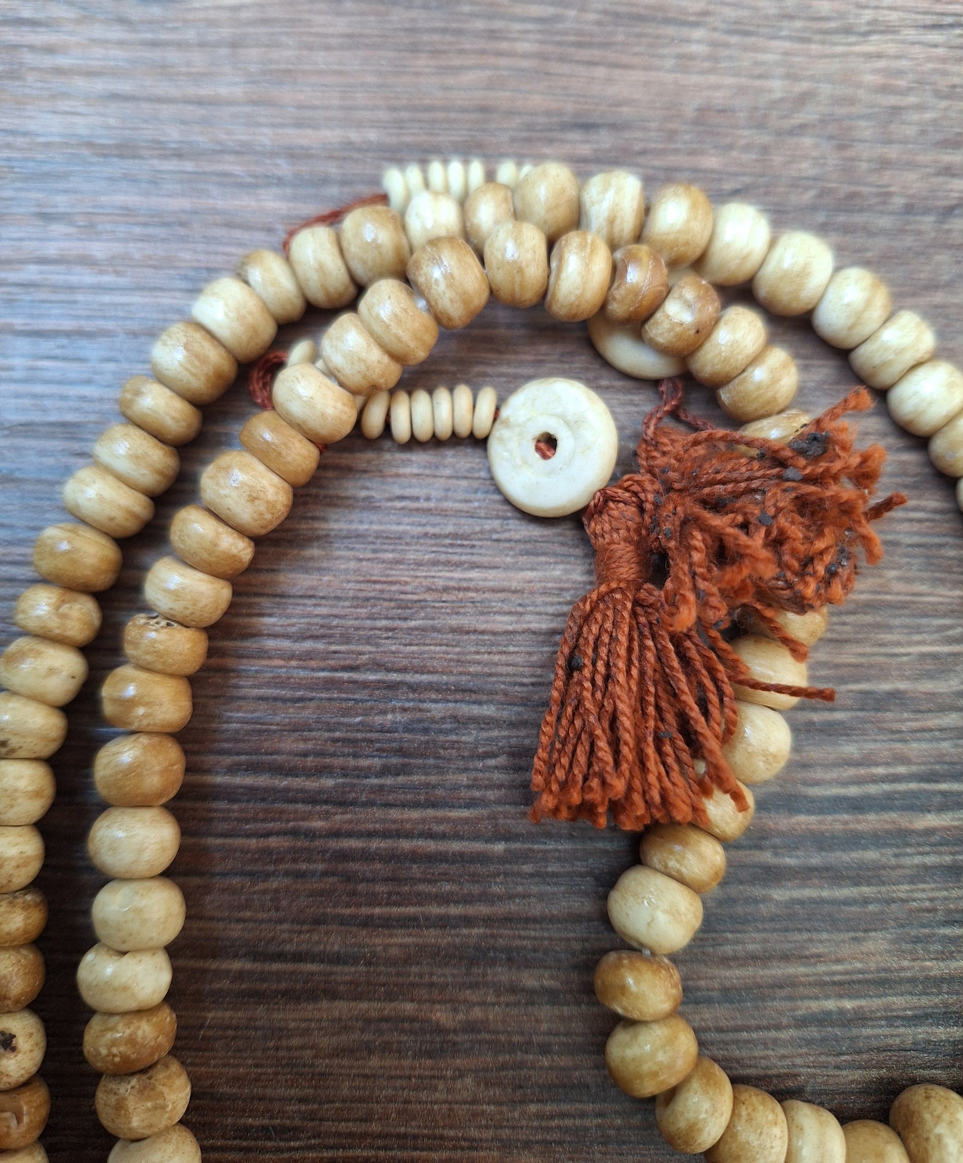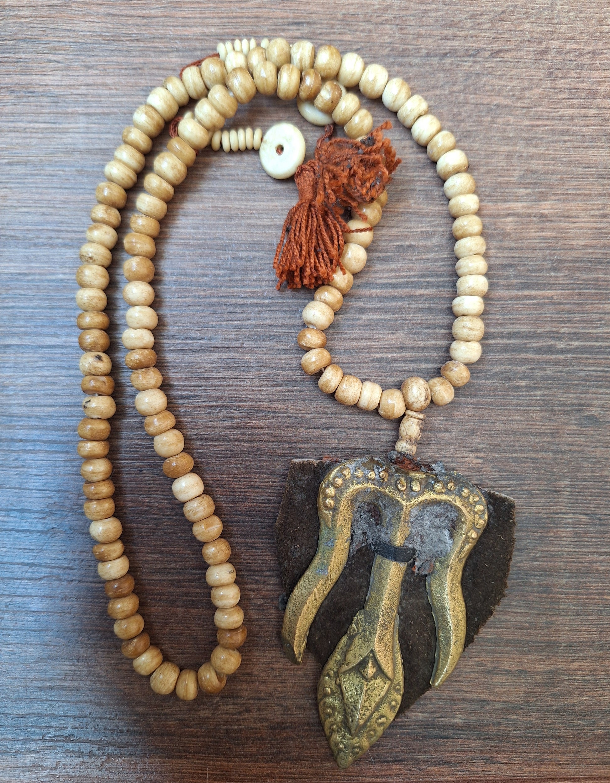 This mala comes from Tibet and is made with yak bone beads. The beads are approximately 5 millimeters high and 8 millimeters in diameter. Total length of the mala is approximately 64 centimeters (measured without the pendant) and total weight including the pendant is 124 grams.