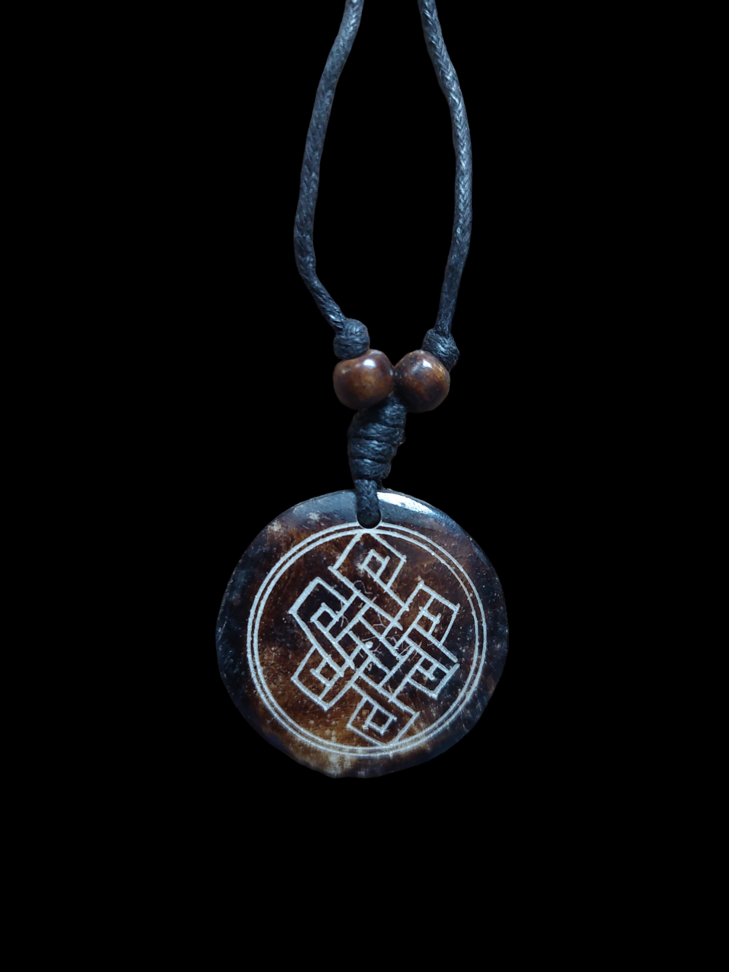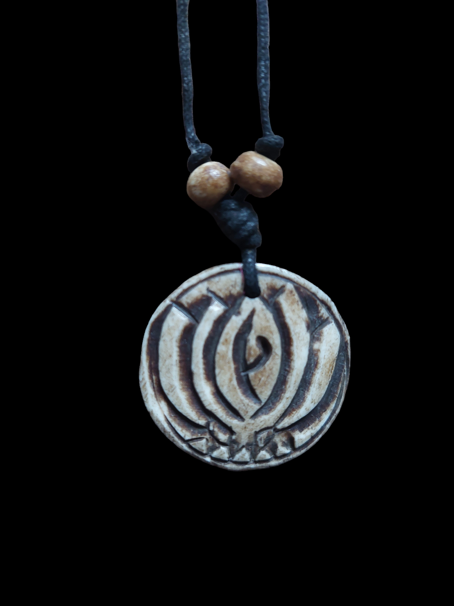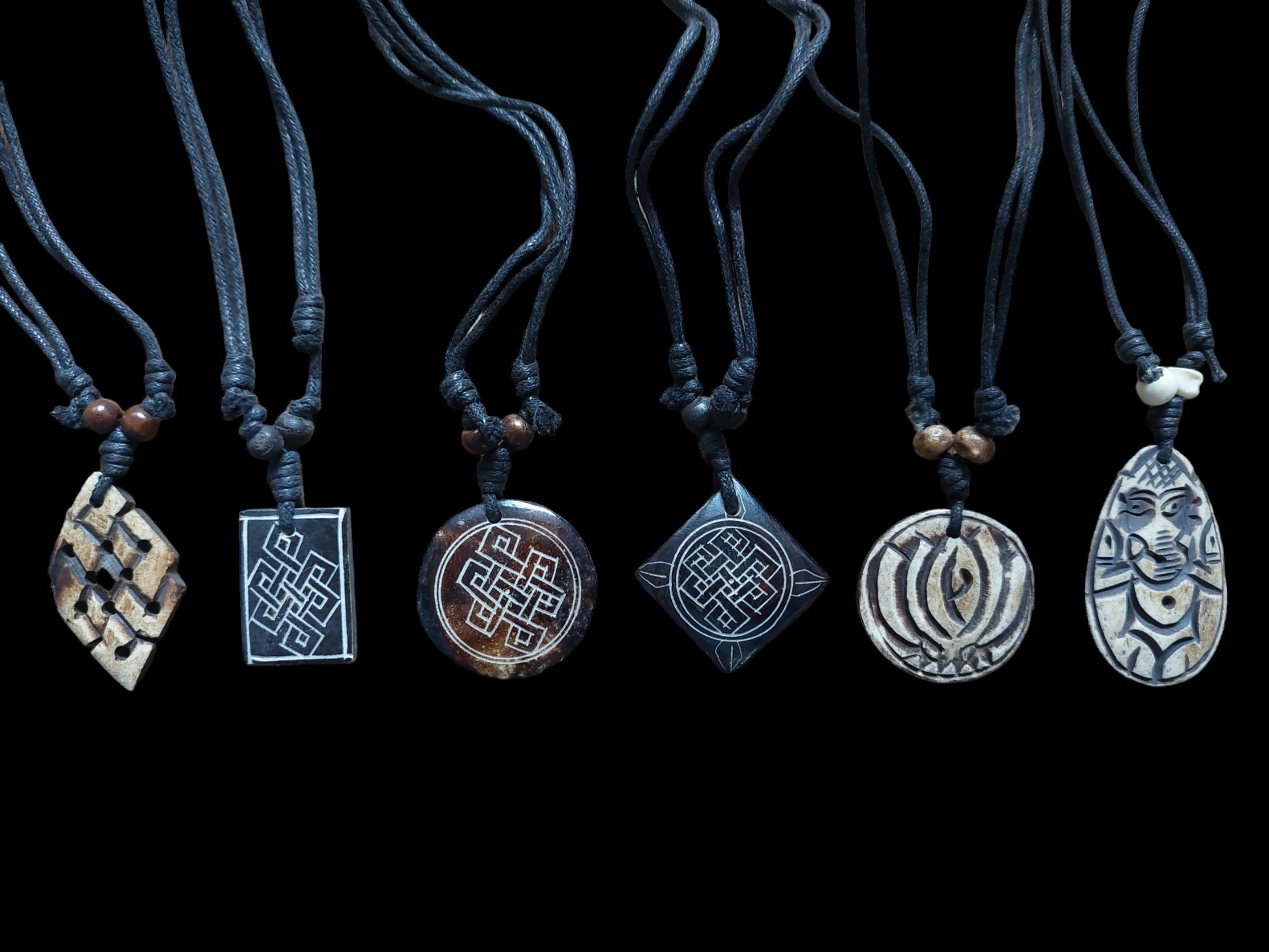 Simple but nice handmade necklaces from Tibet featuring a pendant made from carved yak bone, on black waxcord. The necklaces close with two simple sliding knots, which makes it possible to adjust them easily to your personal lenght.