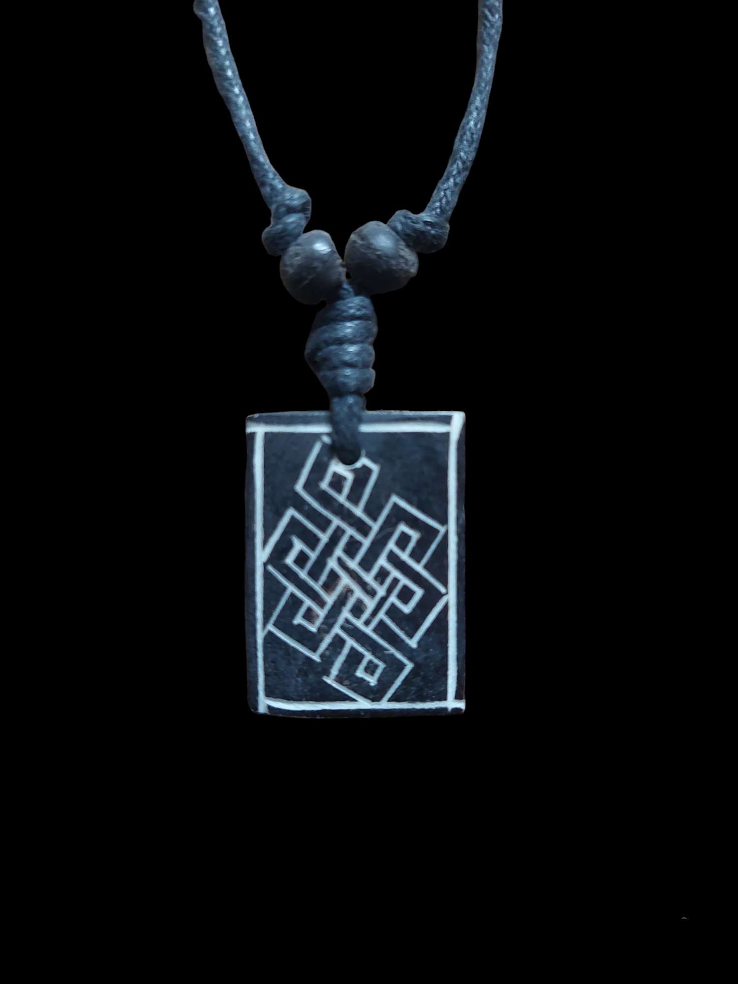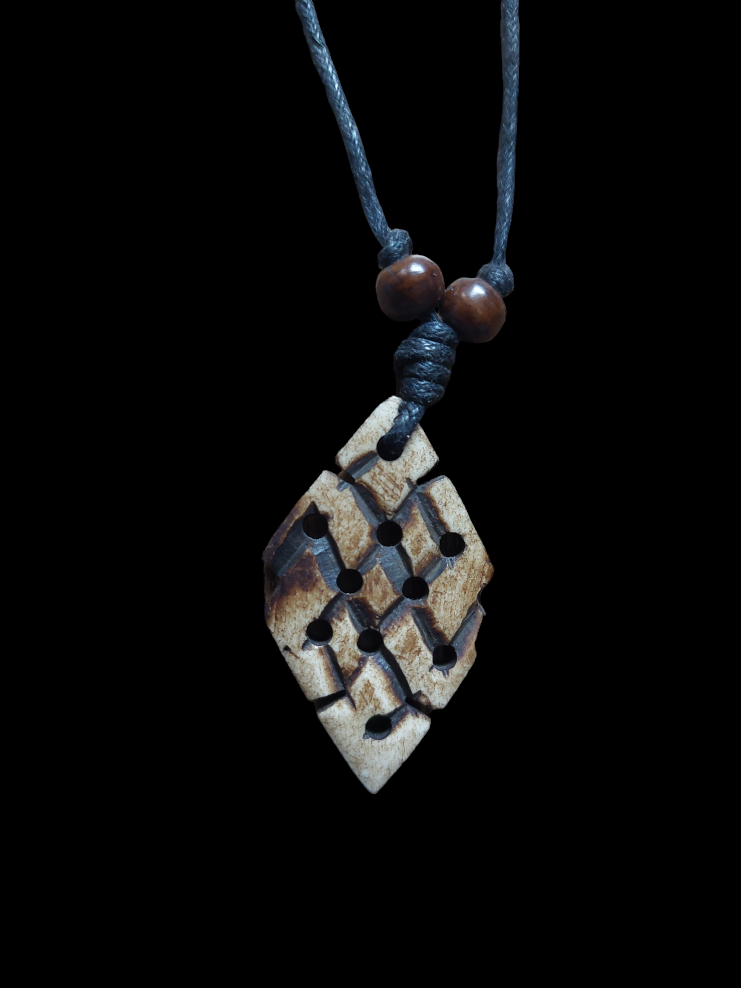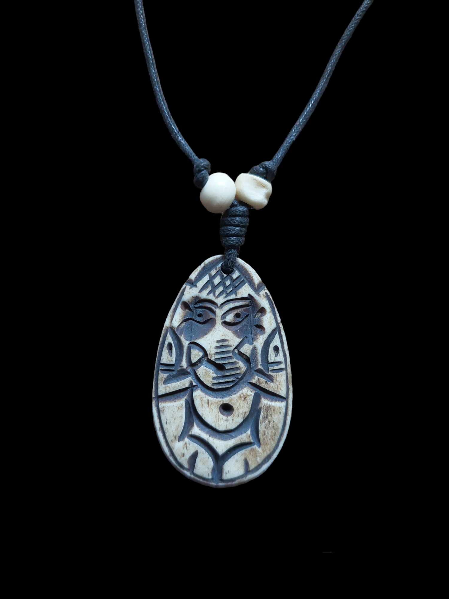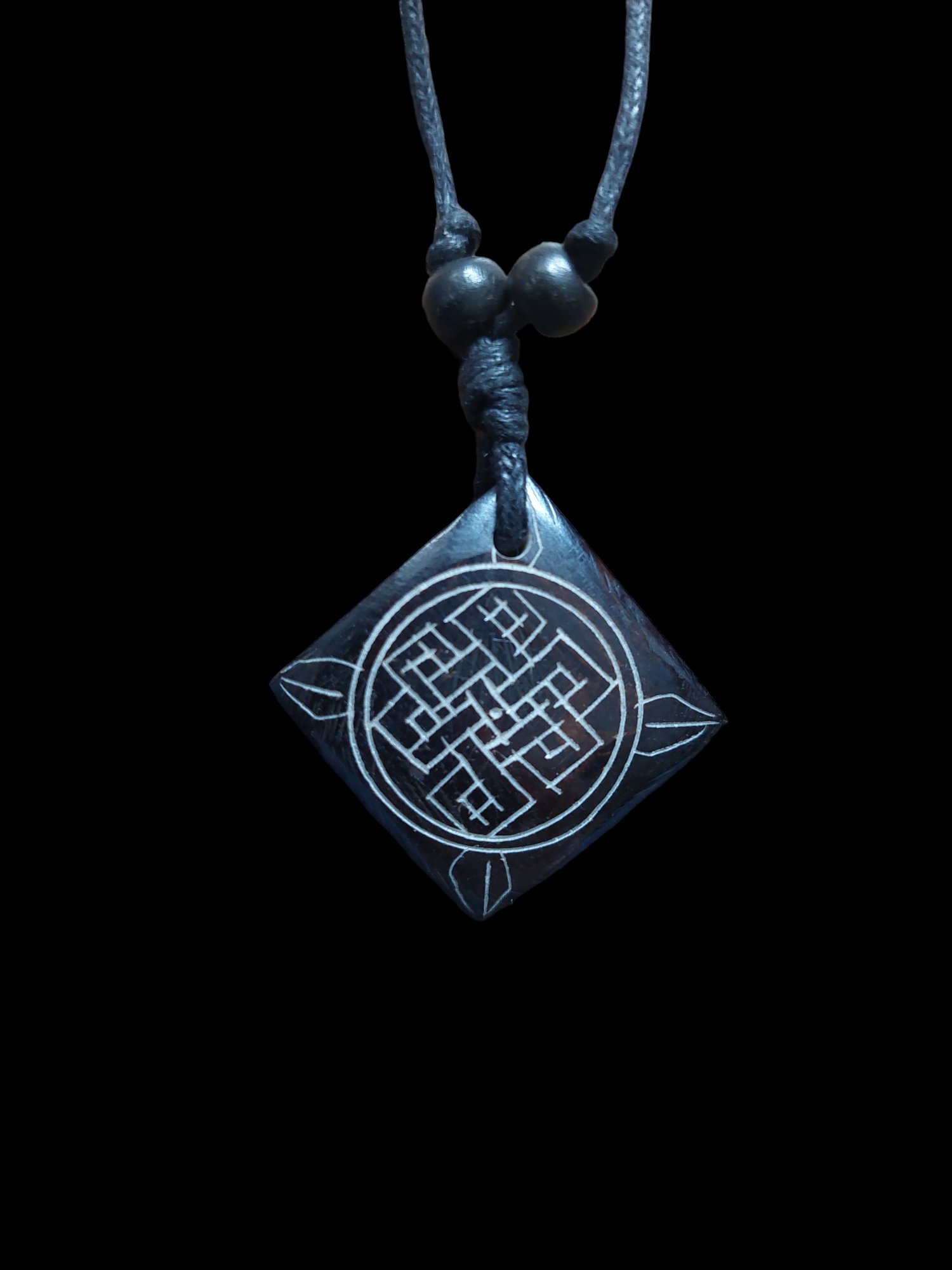 Simple but nice handmade necklaces from Tibet featuring a pendant made from carved yak bone, on black waxcord. The necklaces close with two simple sliding knots, which makes it possible to adjust them easily to your personal lenght.